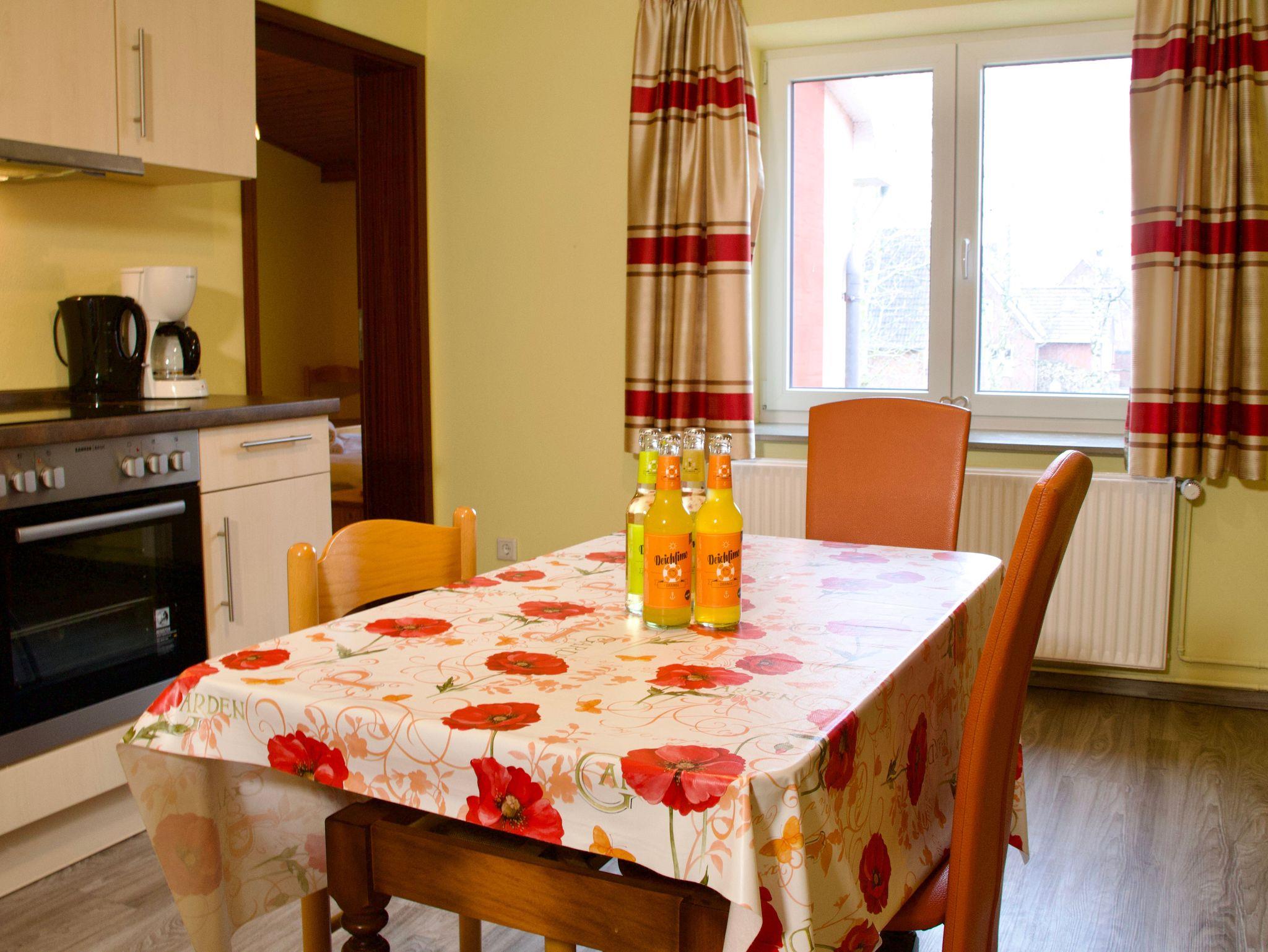 Im ersten Stock des Nebengebäudes des Seetuun-Hoffs befindet sich die Wohnung Dree, eine freundlich gestaltete Ferienwohnung für bis zu vier Personen. Warme Farbtöne und bewusst gesetzte, lebendige Akzente verleihen der Wohnung einen frischen, wohnlichen Charakter und schaffen eine positive, angenehme Atmosphäre.