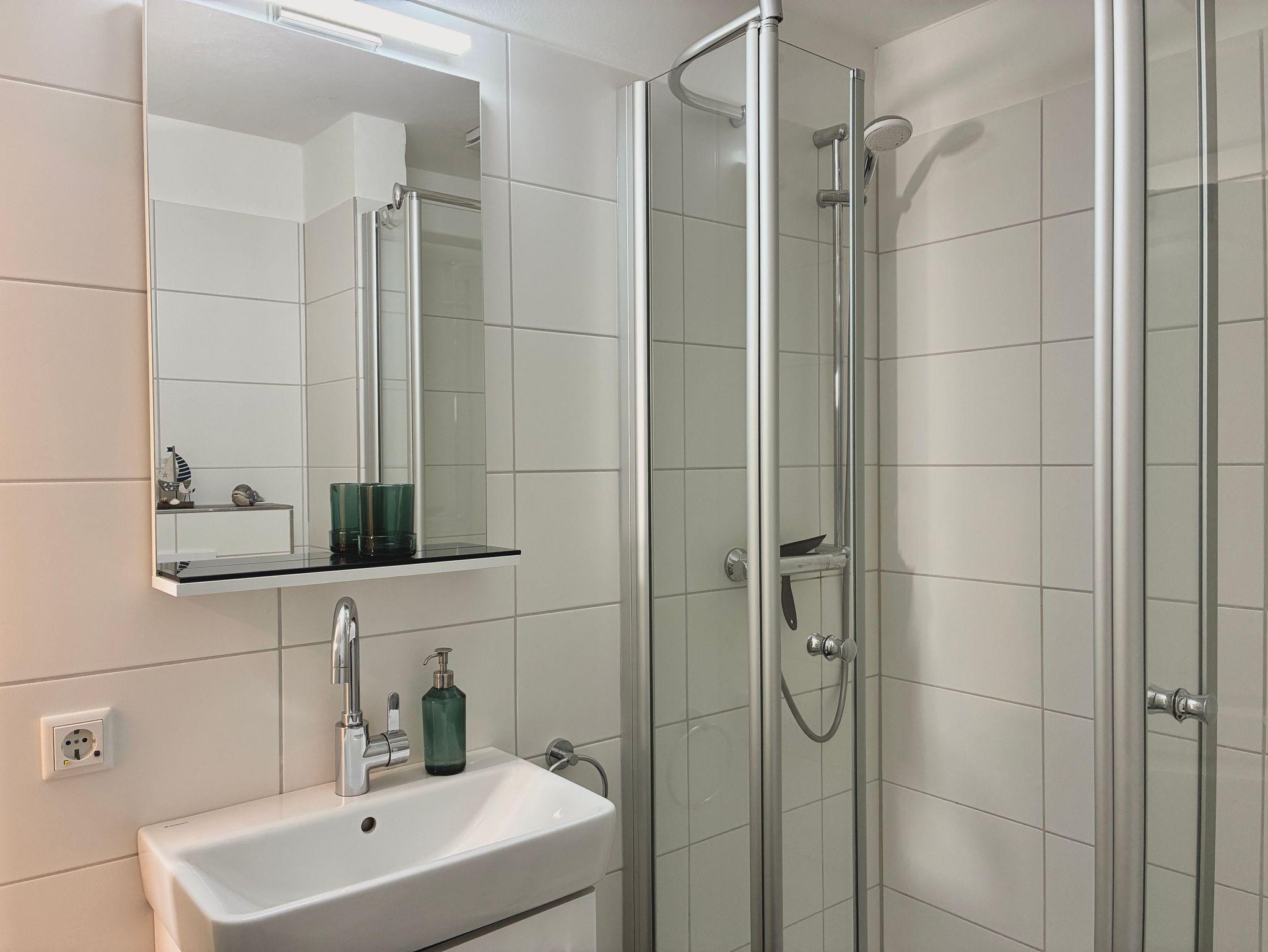Im Obergeschoss befinden sich zwei separate Schlafzimmer, eines mit einem Doppelbett und eines mit zwei Einzelbetten. Ergänzt wird diese Ebene durch ein Bad mit Dusche und WC, hell gestaltet und funktional ausgestattet.