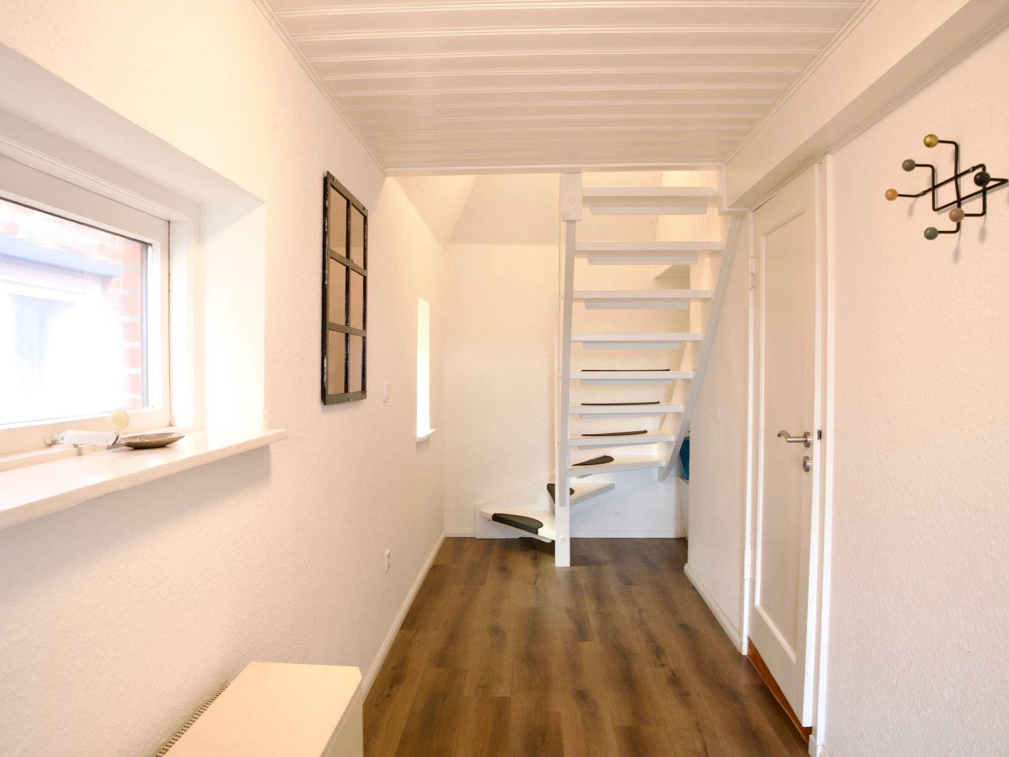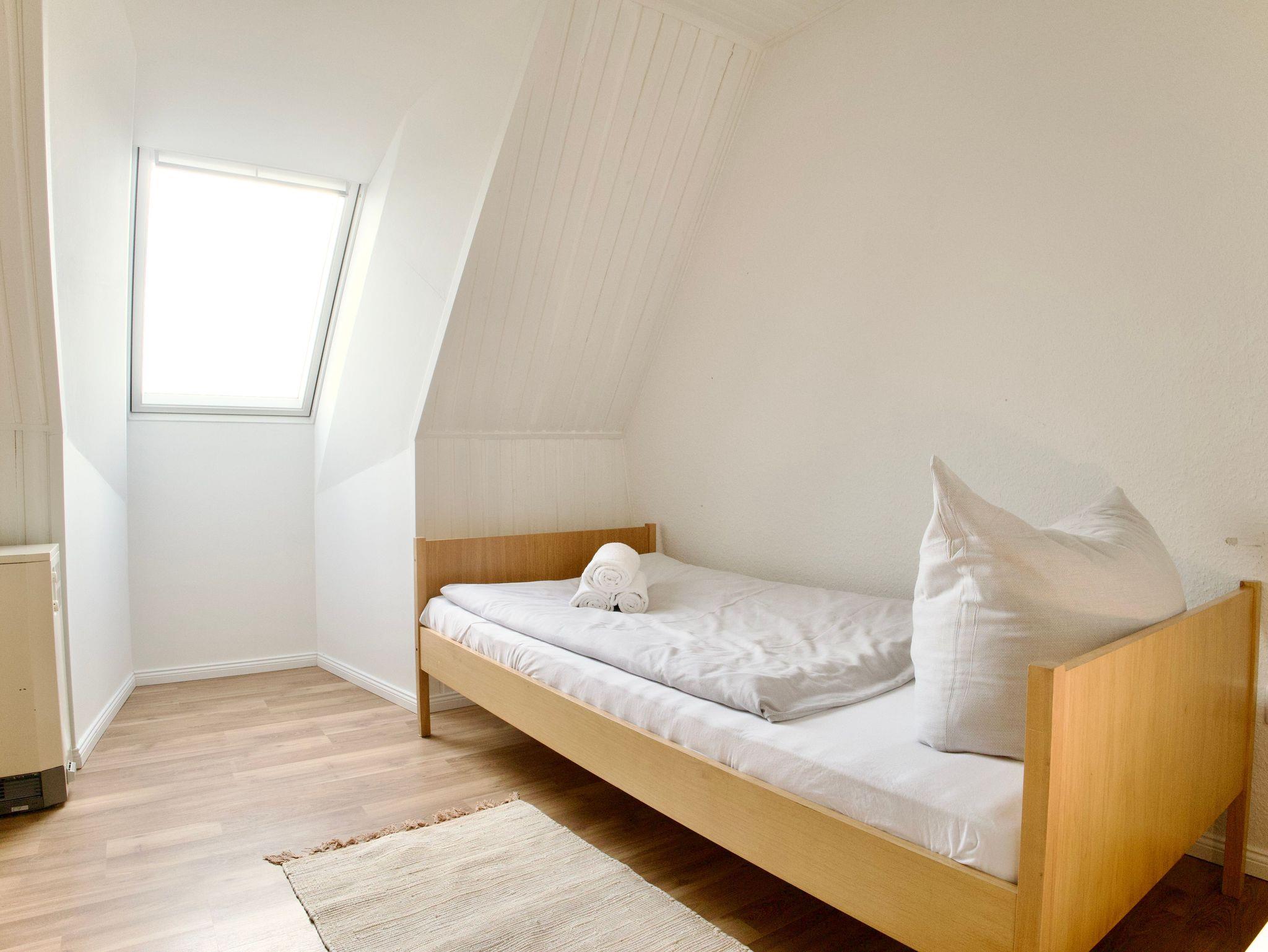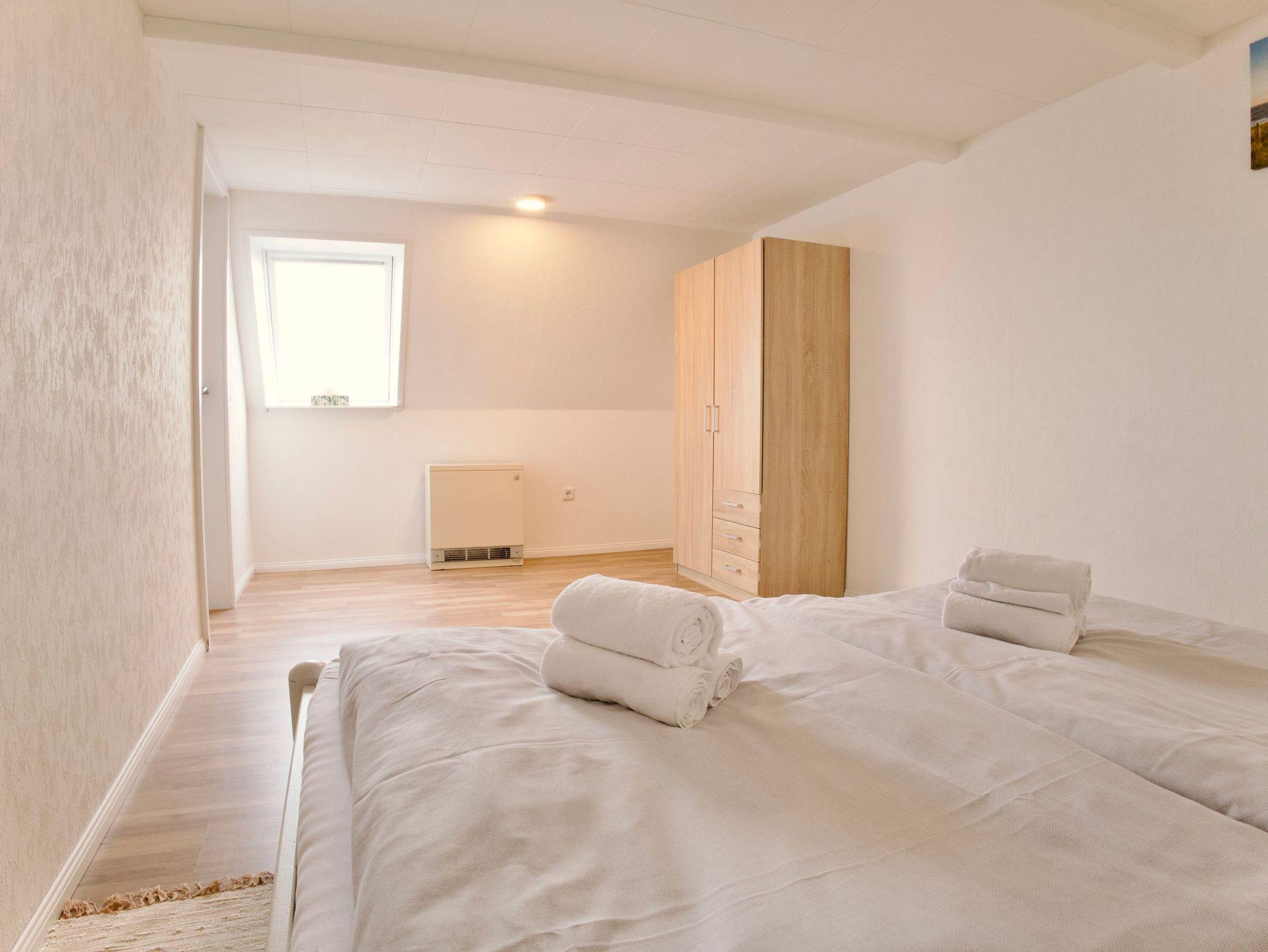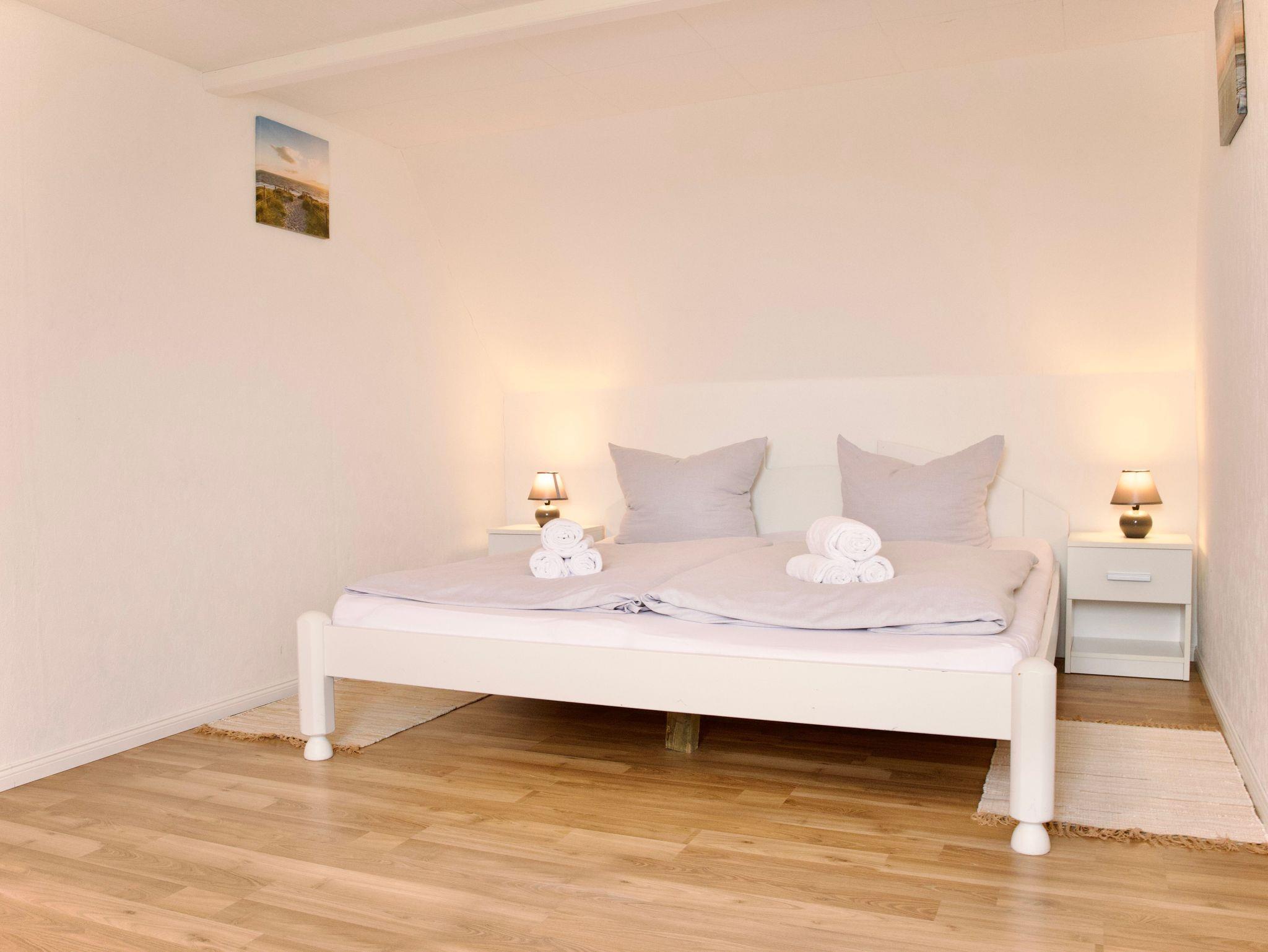 Über eine offene Treppe gelangen Sie in das Obergeschoss. Hier befinden sich zwei großzügige Schlafzimmer. Eines ist mit zwei 90 Zentimeter breiten Einzelbetten ausgestattet und bietet einen schönen Blick in die Landschaft. Das zweite Schlafzimmer verfügt über ein 180 Zentimeter breites Doppelbett mit Meerblick und freier Sicht auf die Weiden mit Schafen und Lämmern.