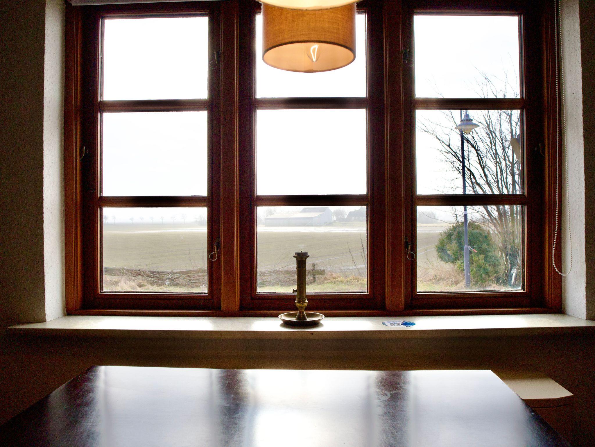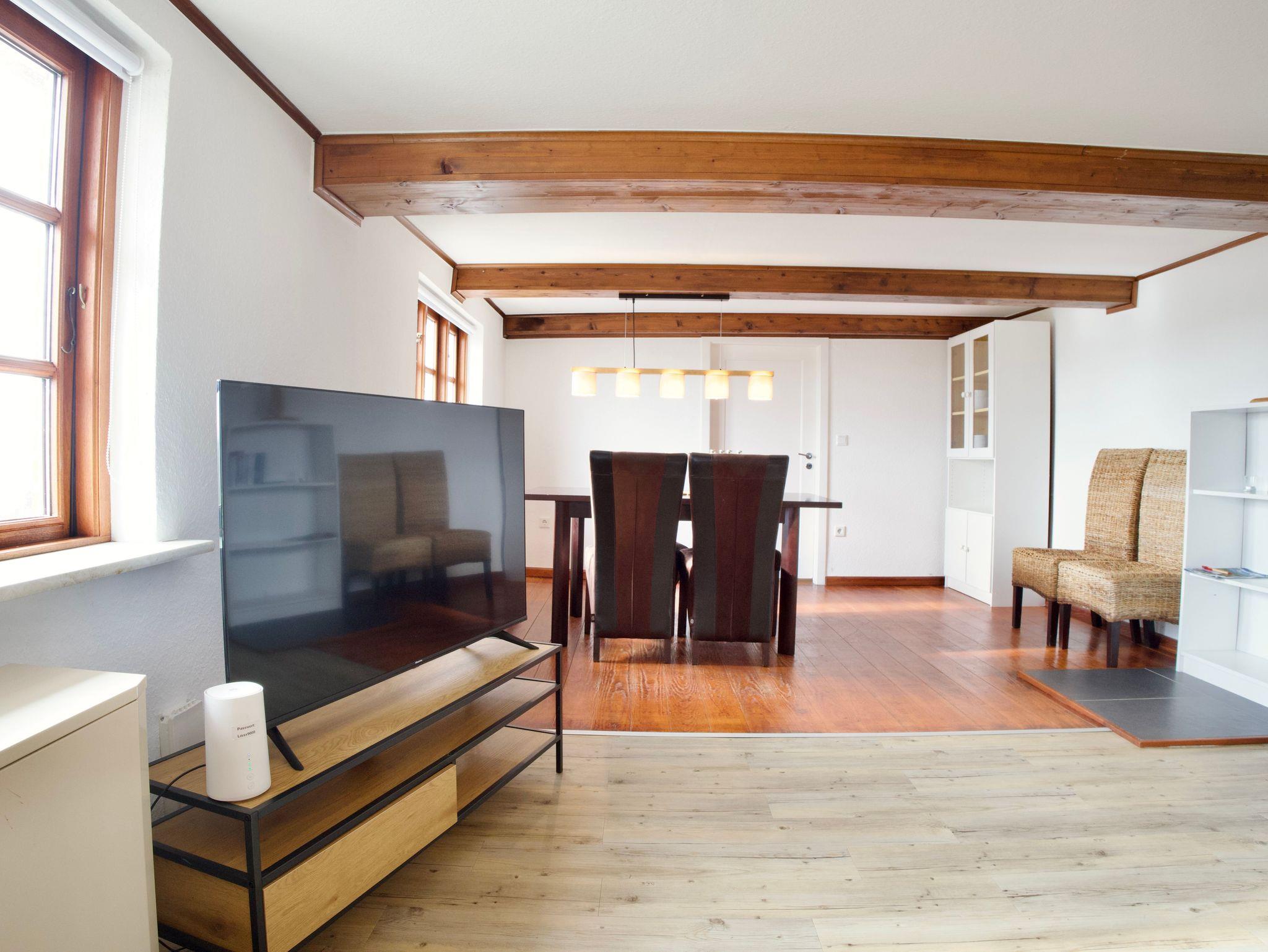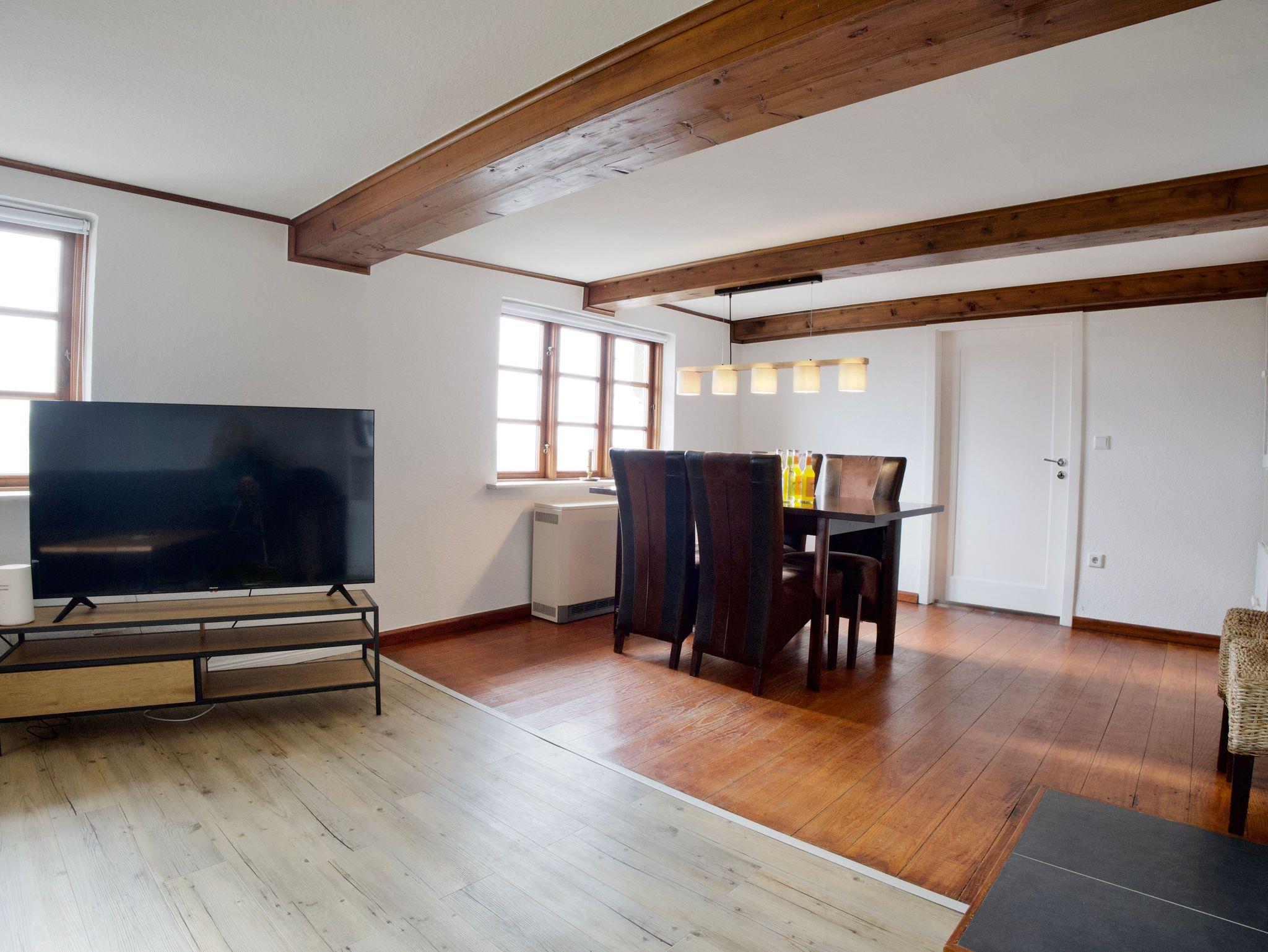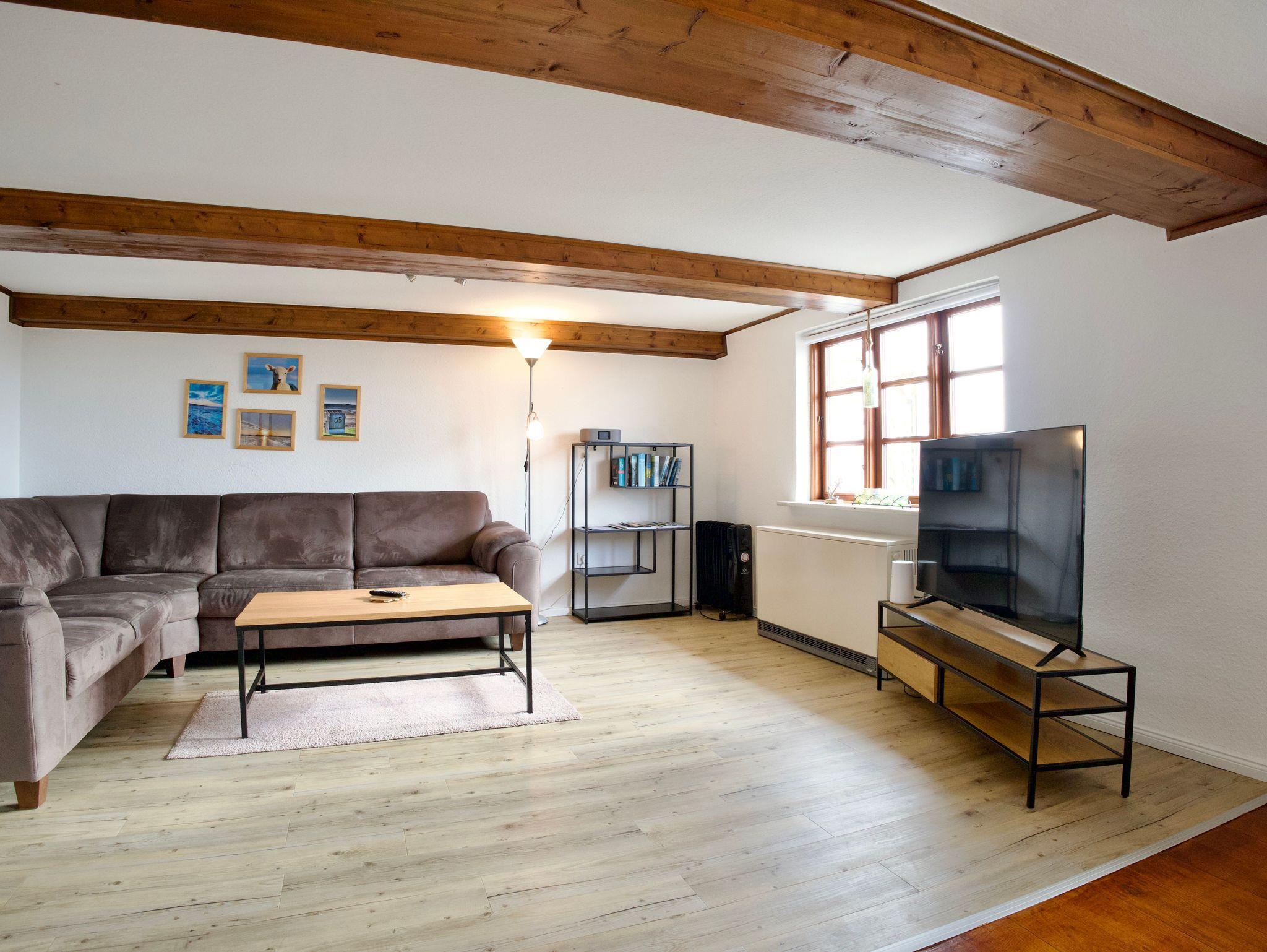 Im Erdgeschoss befindet sich das großzügige Wohnzimmer mit integriertem Essbereich. Der helle, offen gestaltete Raum wird von einer Holzbalkendecke und einem Dielenboden geprägt und vermittelt eine warme, behagliche Atmosphäre. Eine große Couch, ein Smart-TV sowie Bücher, Spiele und Infomaterial rund um Nordstrand laden zu entspannten Stunden ein. Der Esstisch ist am Fenster platziert und bietet einen freien Blick ins Grüne und über die Felder der Umgebung.