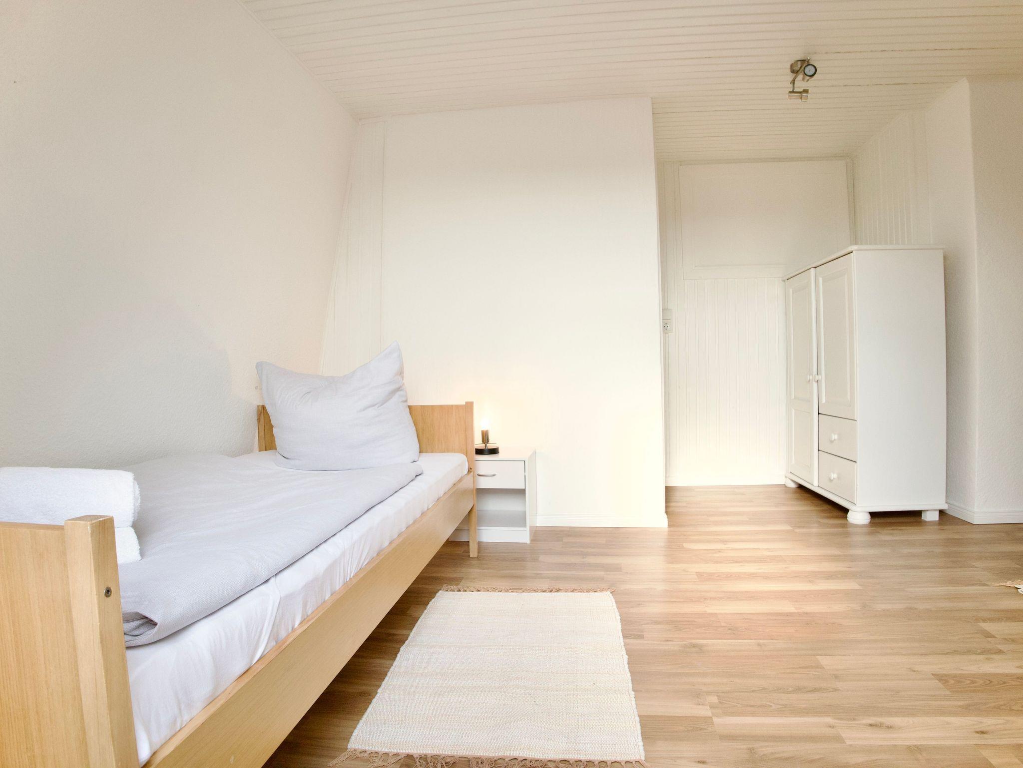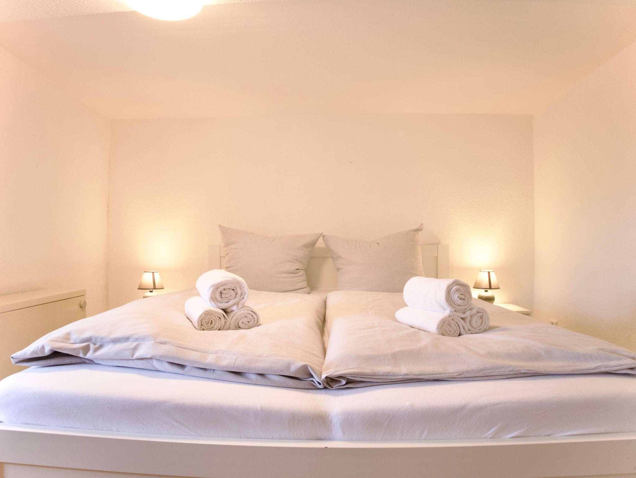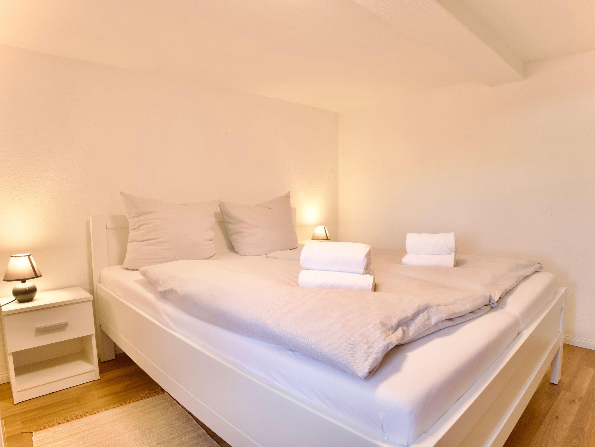 Von hier aus gelangen Sie direkt in das erste Schlafzimmer im Erdgeschoss, das mit einem 160 Zentimeter breiten Doppelbett ausgestattet ist.