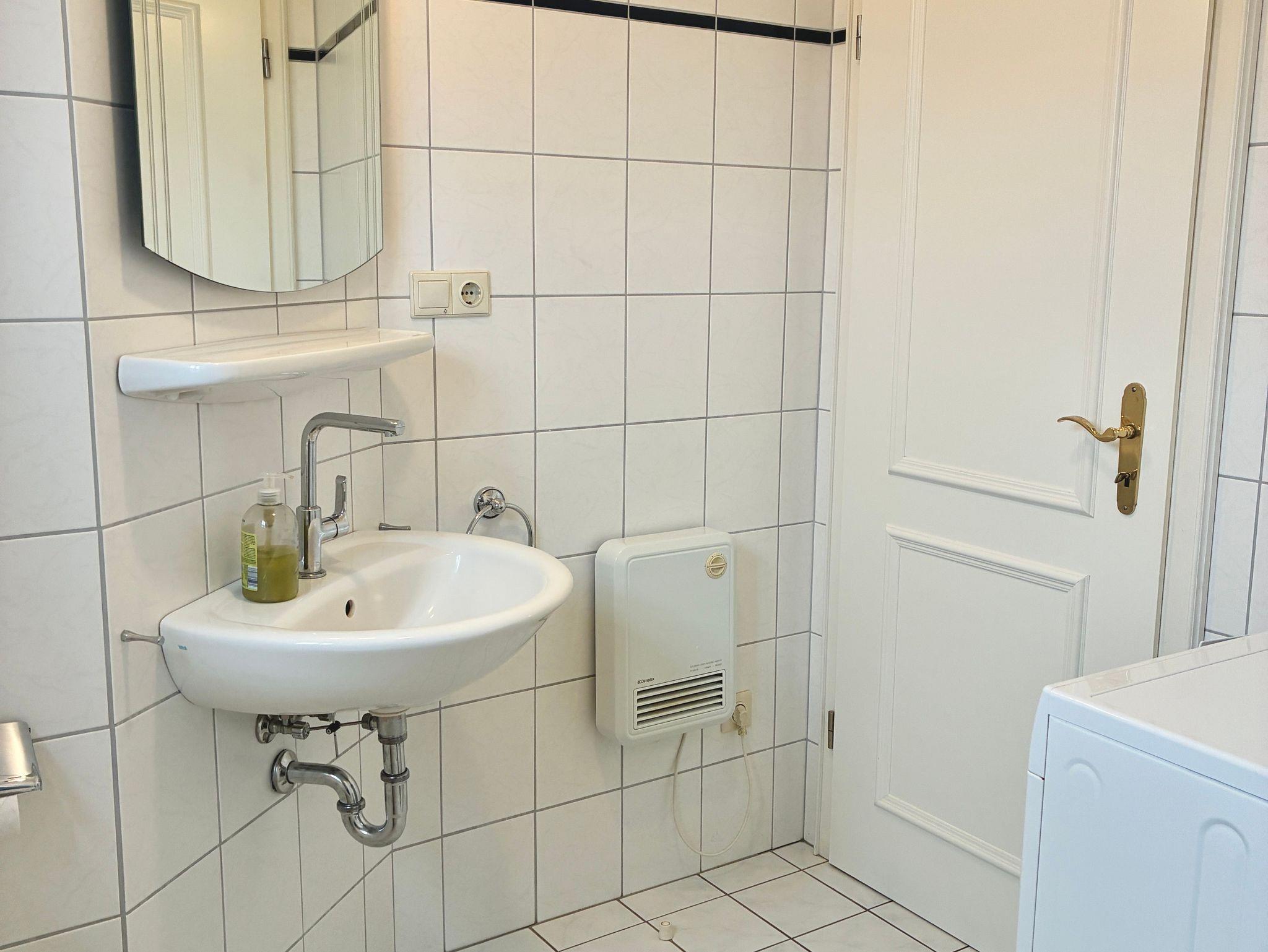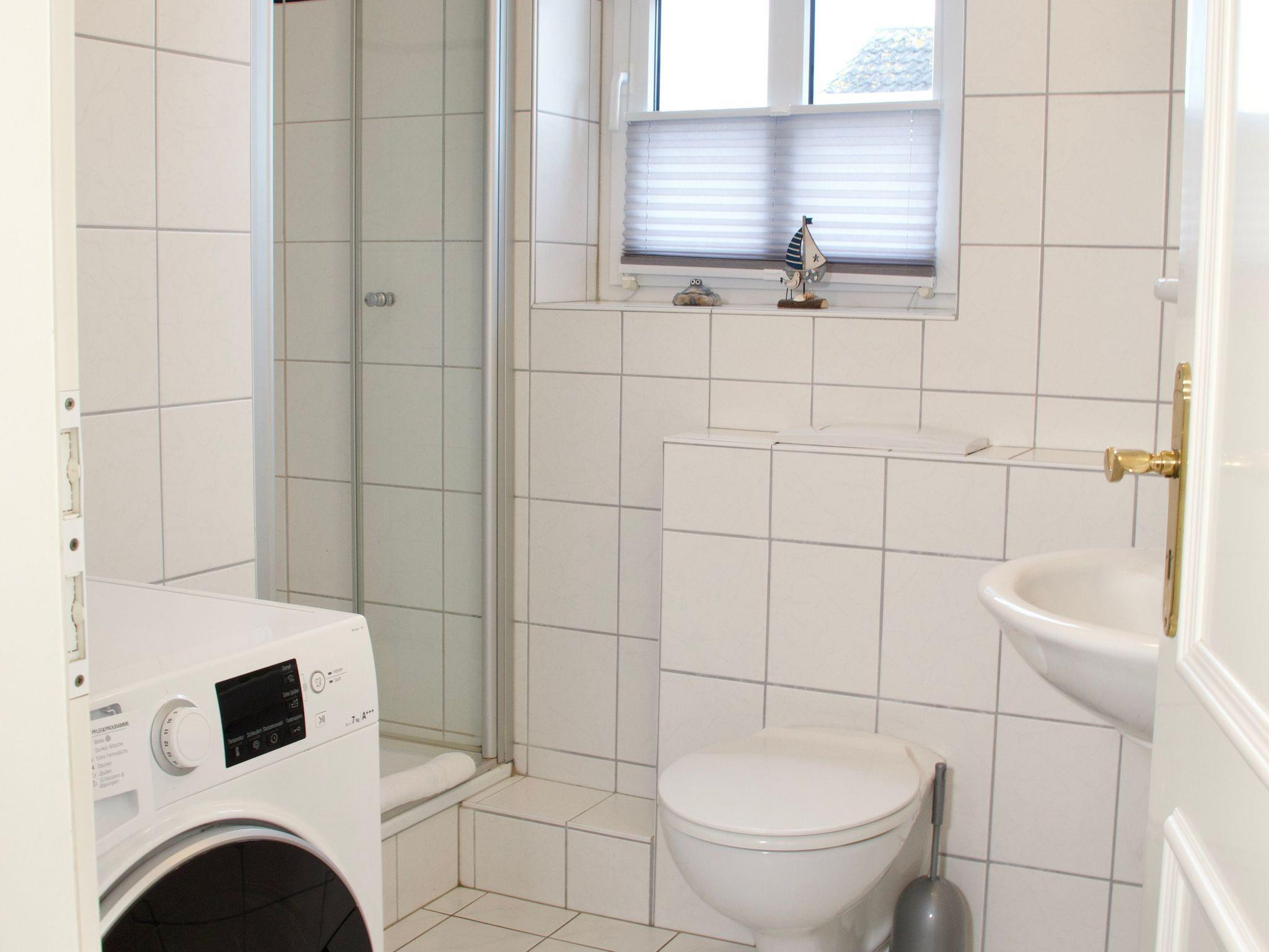 Im oberen Stockwerk befinden sich zwei separate Schlafzimmer, eines mit einem Doppelbett und eines mit zwei Einzelbetten. Ergänzt wird diese Ebene durch ein helles Bad mit Fenster, Dusche und integrierter Waschmaschine, praktisch auch für längere Aufenthalte.