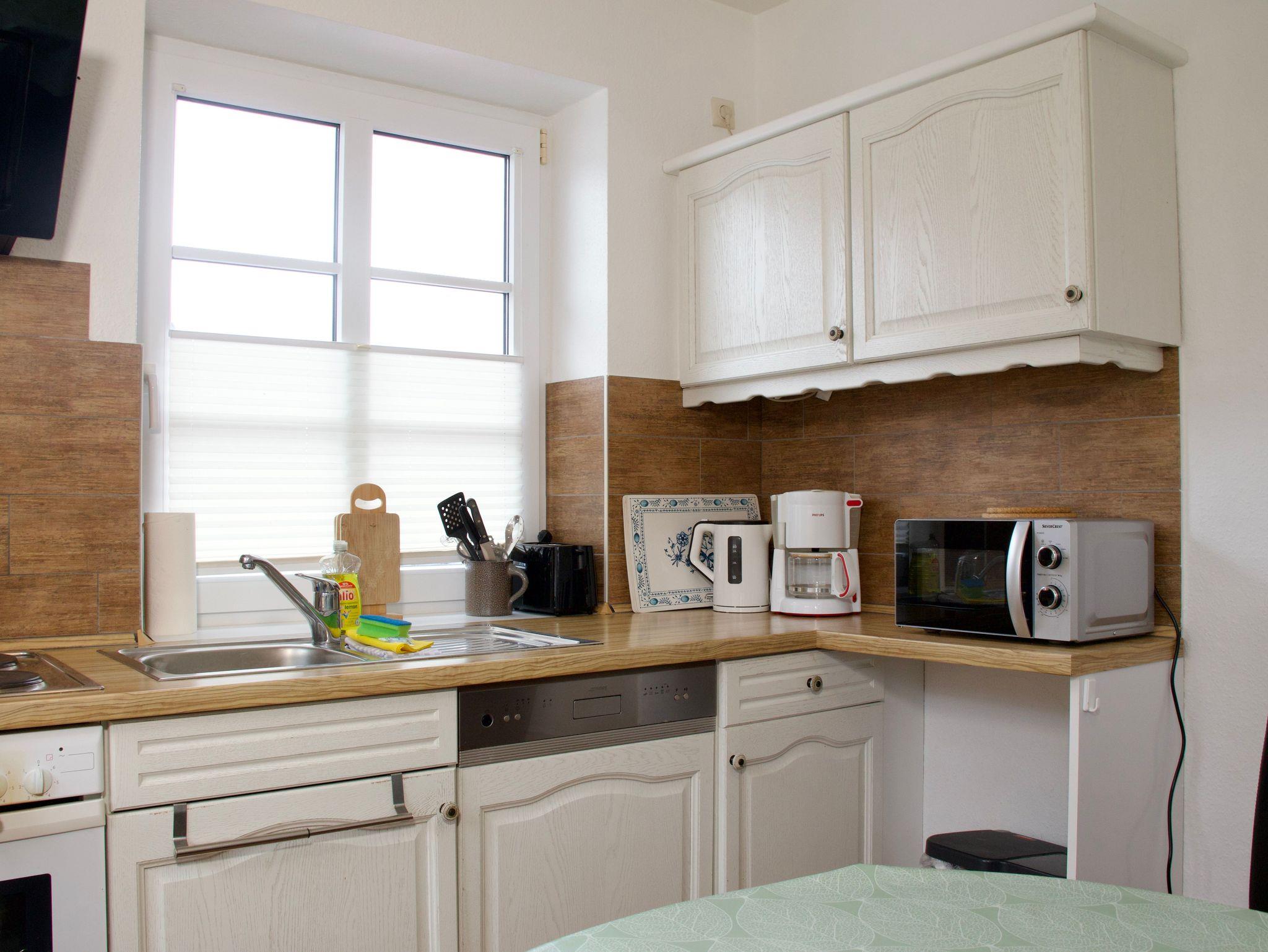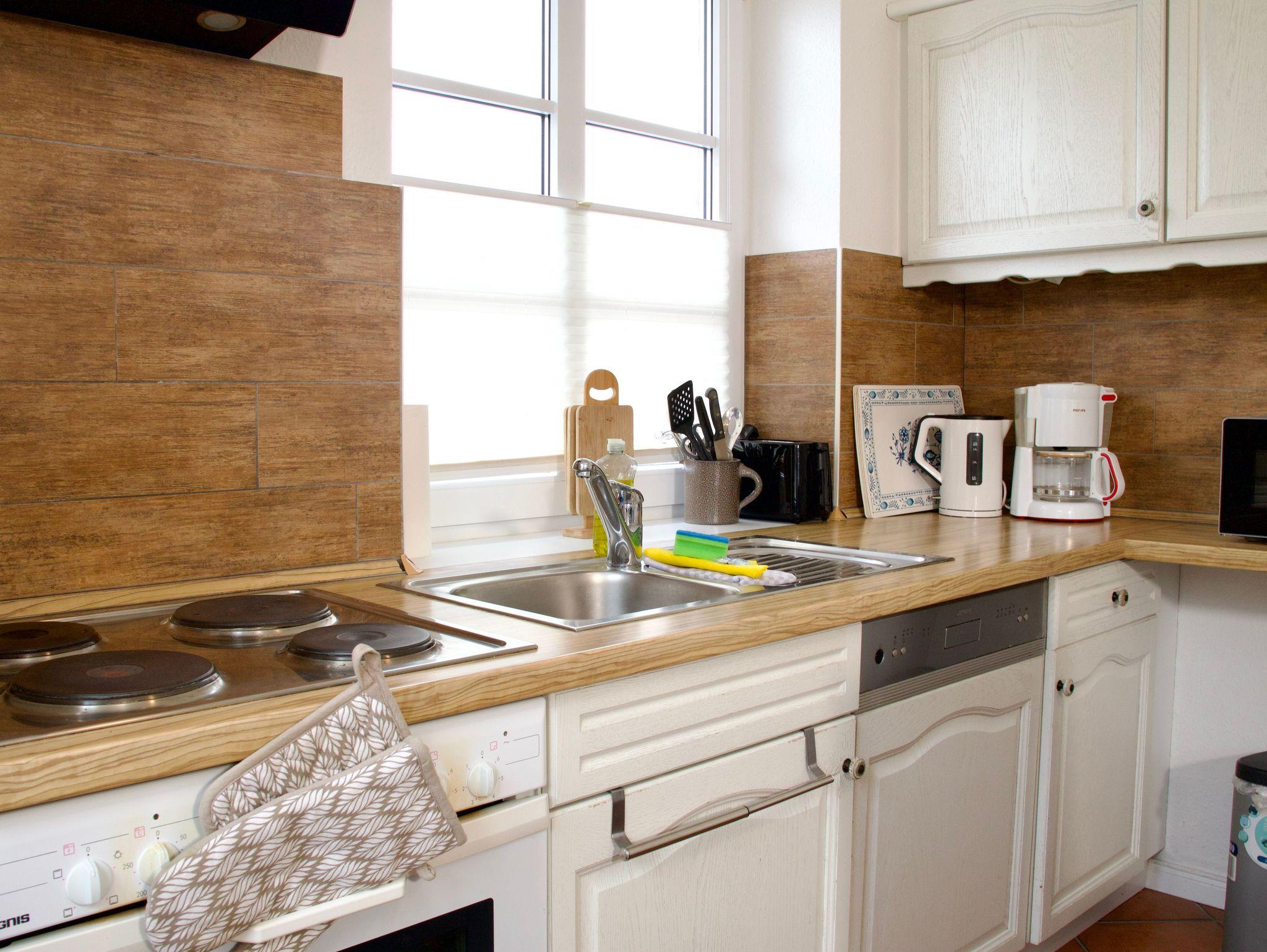 Die separate Küche ist funktional und übersichtlich eingerichtet und verfügt über eine Spülmaschine sowie eine Gefriermöglichkeit. Zusätzlich befindet sich im Erdgeschoss ein Gäste-WC.