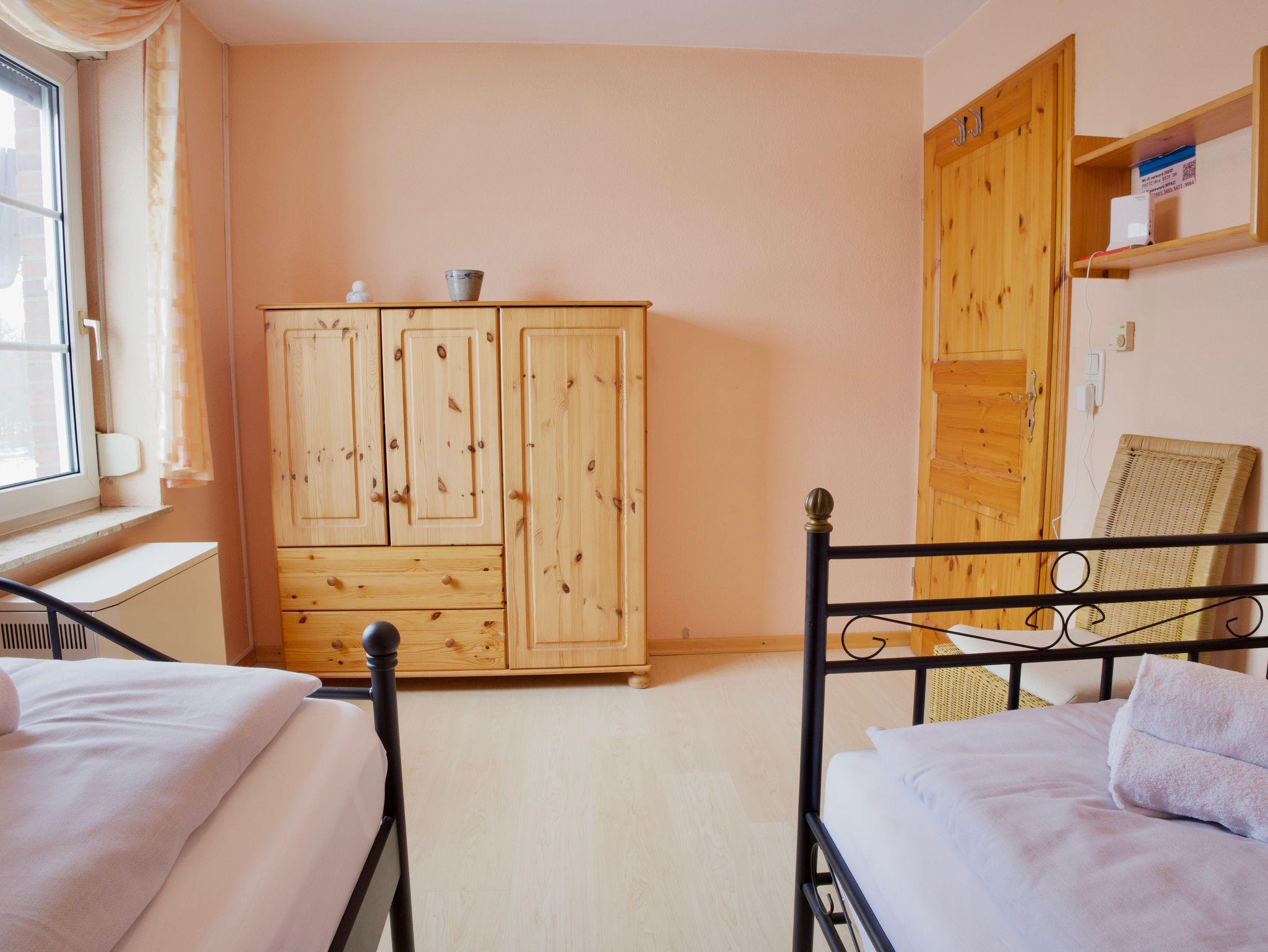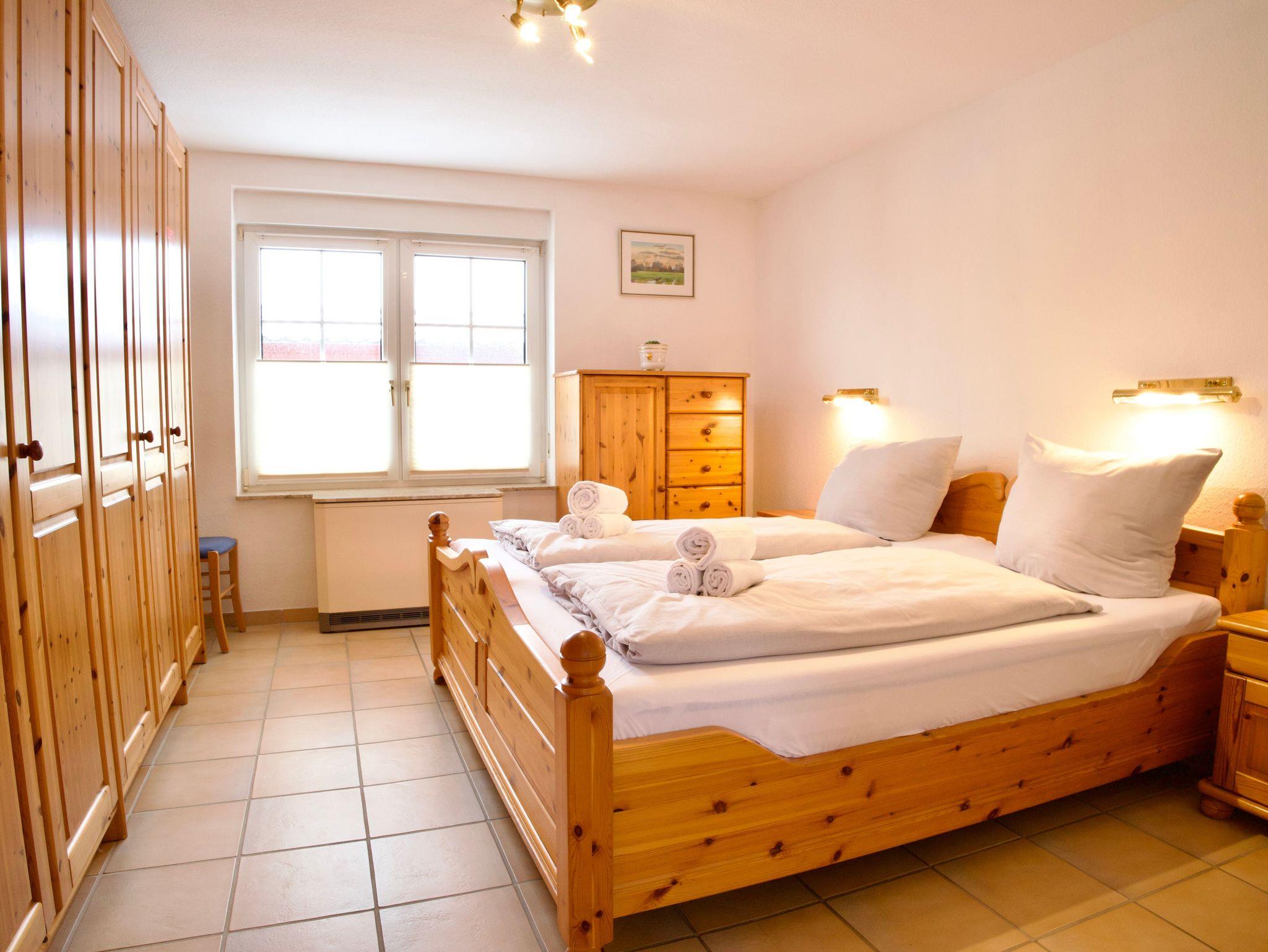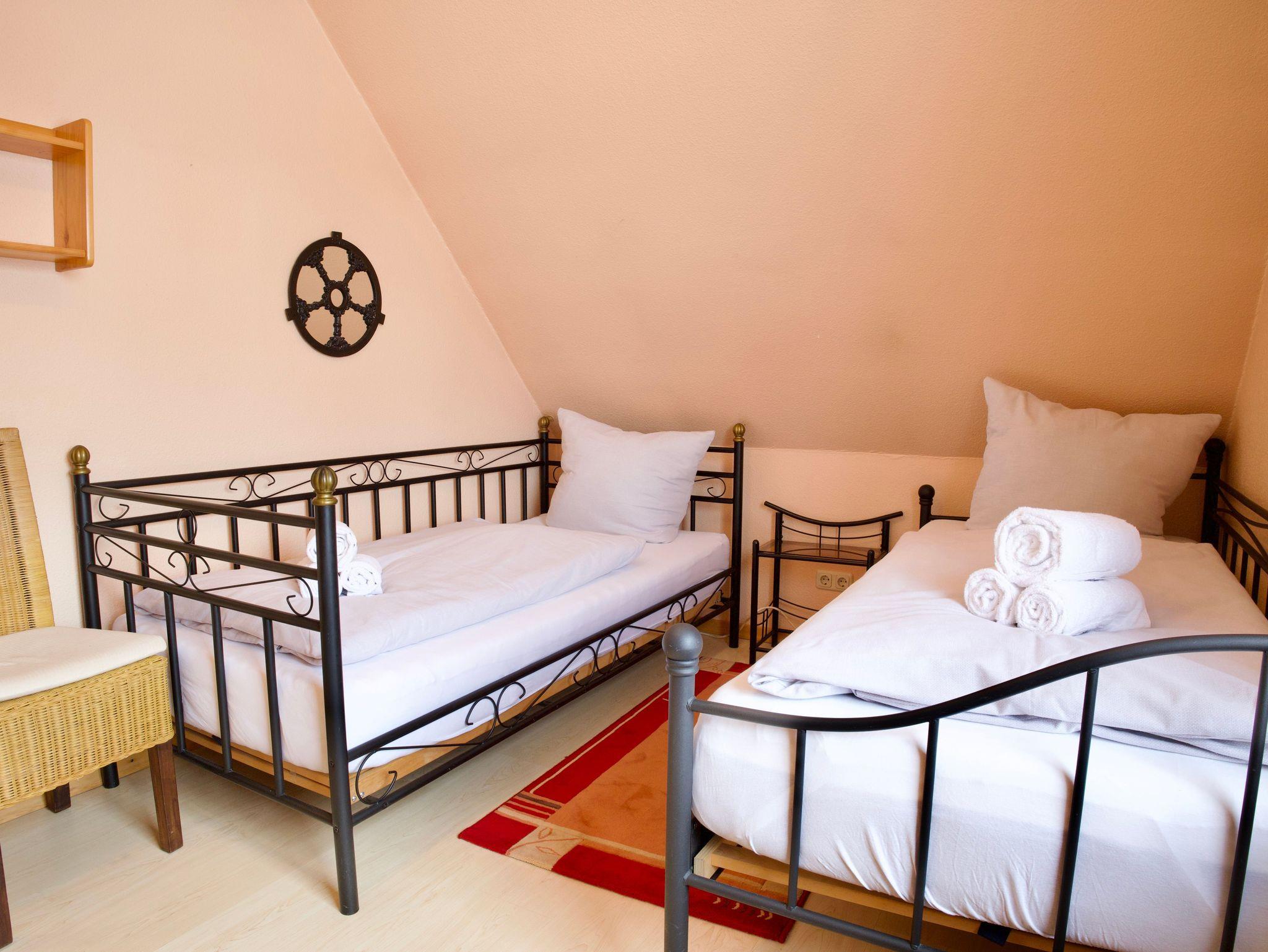 Im Obergeschoss stehen zwei weitere Schlafzimmer zur Verfügung, eines mit einem Doppelbett in der Größe 180 x 200 Zentimeter und eines mit zwei Einzelbetten in der Größe 90 x 200 Zentimeter. Ergänzt wird diese Ebene durch ein gemütliches Wohnzimmer, eine weitere Küche sowie ein zusätzliches Duschbad.
