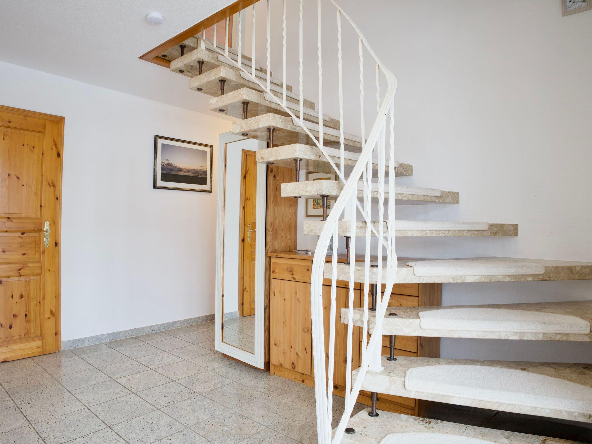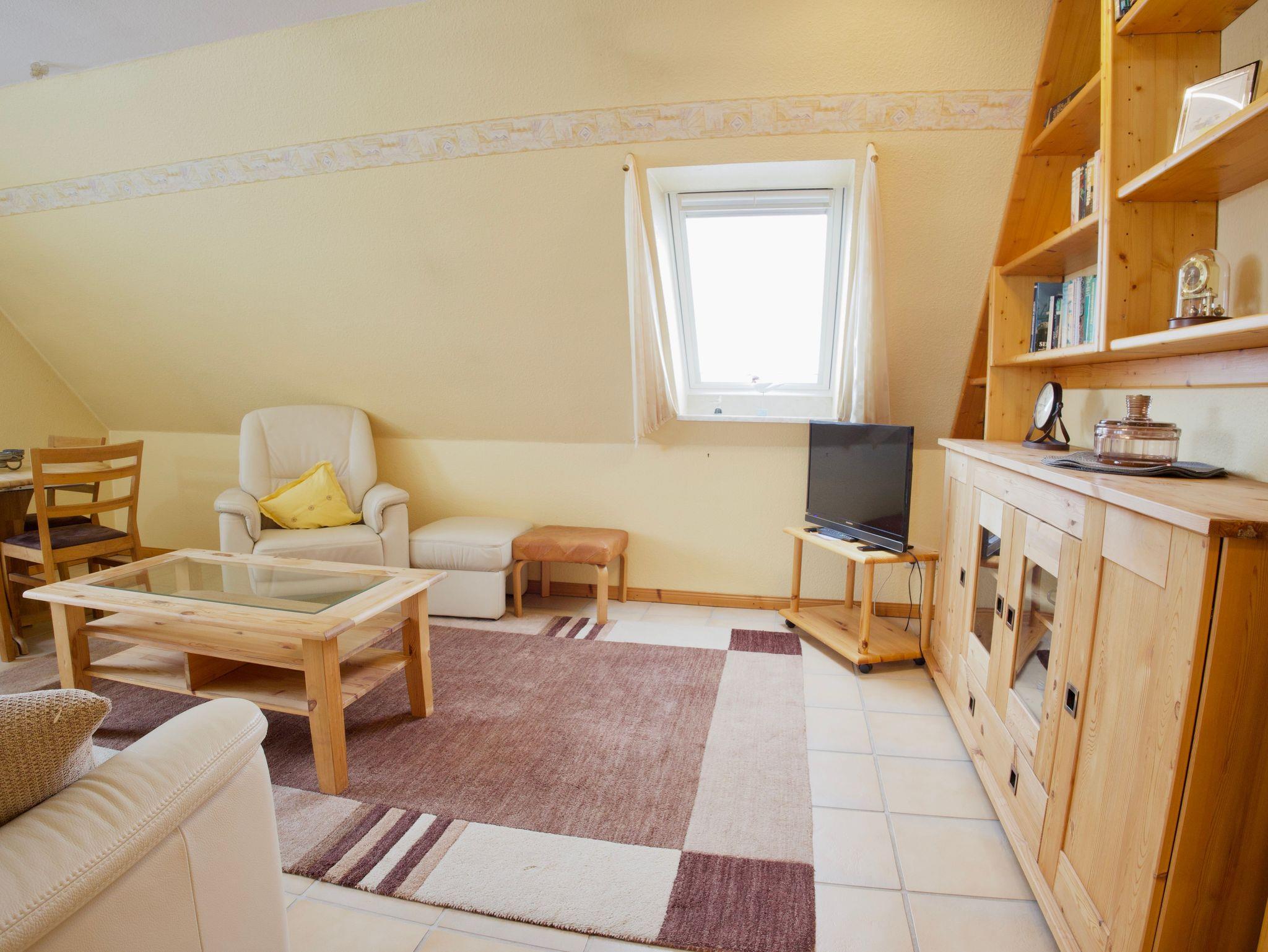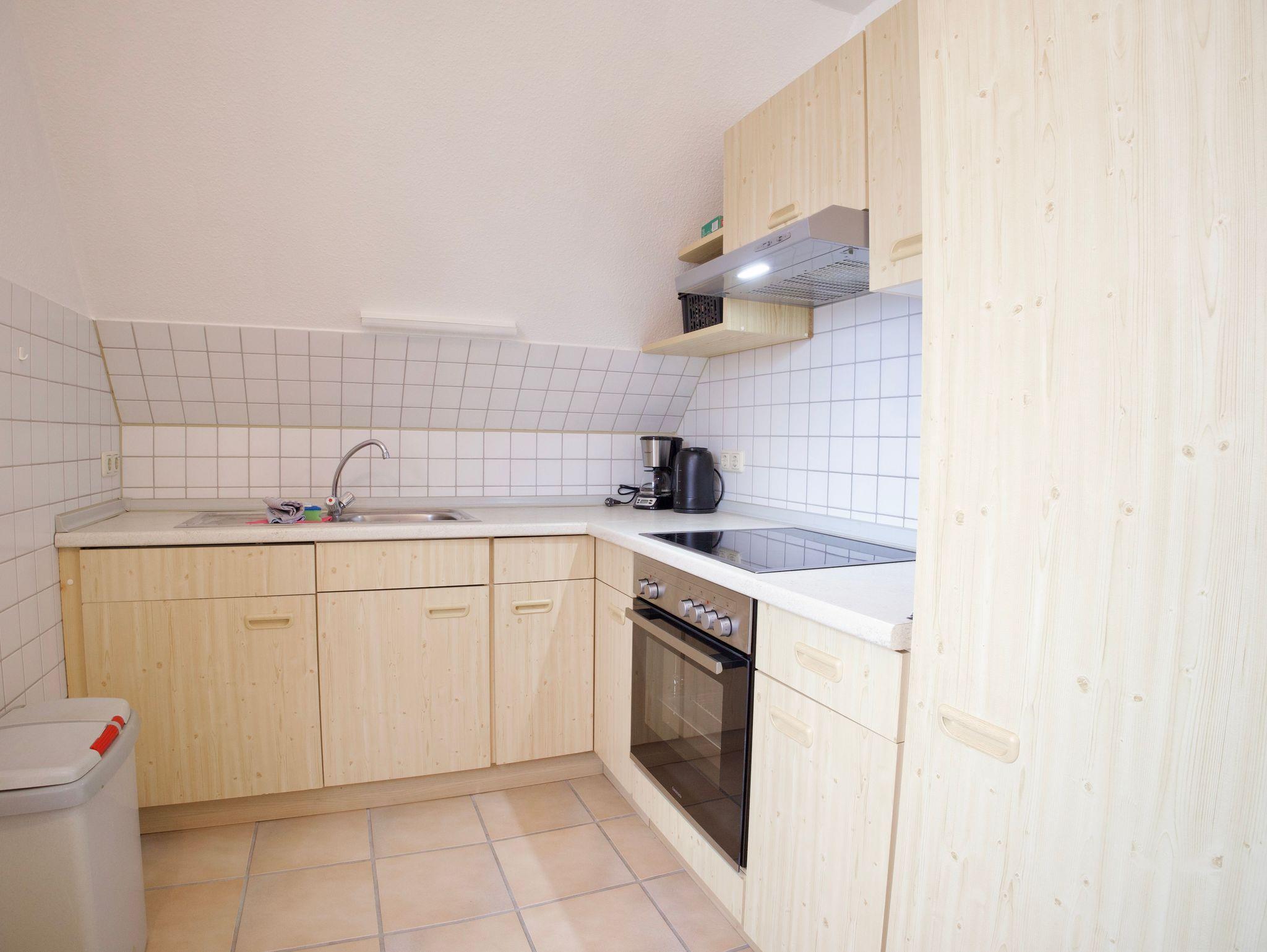 Im Obergeschoss stehen zwei weitere Schlafzimmer zur Verfügung, eines mit einem Doppelbett in der Größe 180 x 200 Zentimeter und eines mit zwei Einzelbetten in der Größe 90 x 200 Zentimeter. Ergänzt wird diese Ebene durch ein gemütliches Wohnzimmer, eine weitere Küche sowie ein zusätzliches Duschbad.