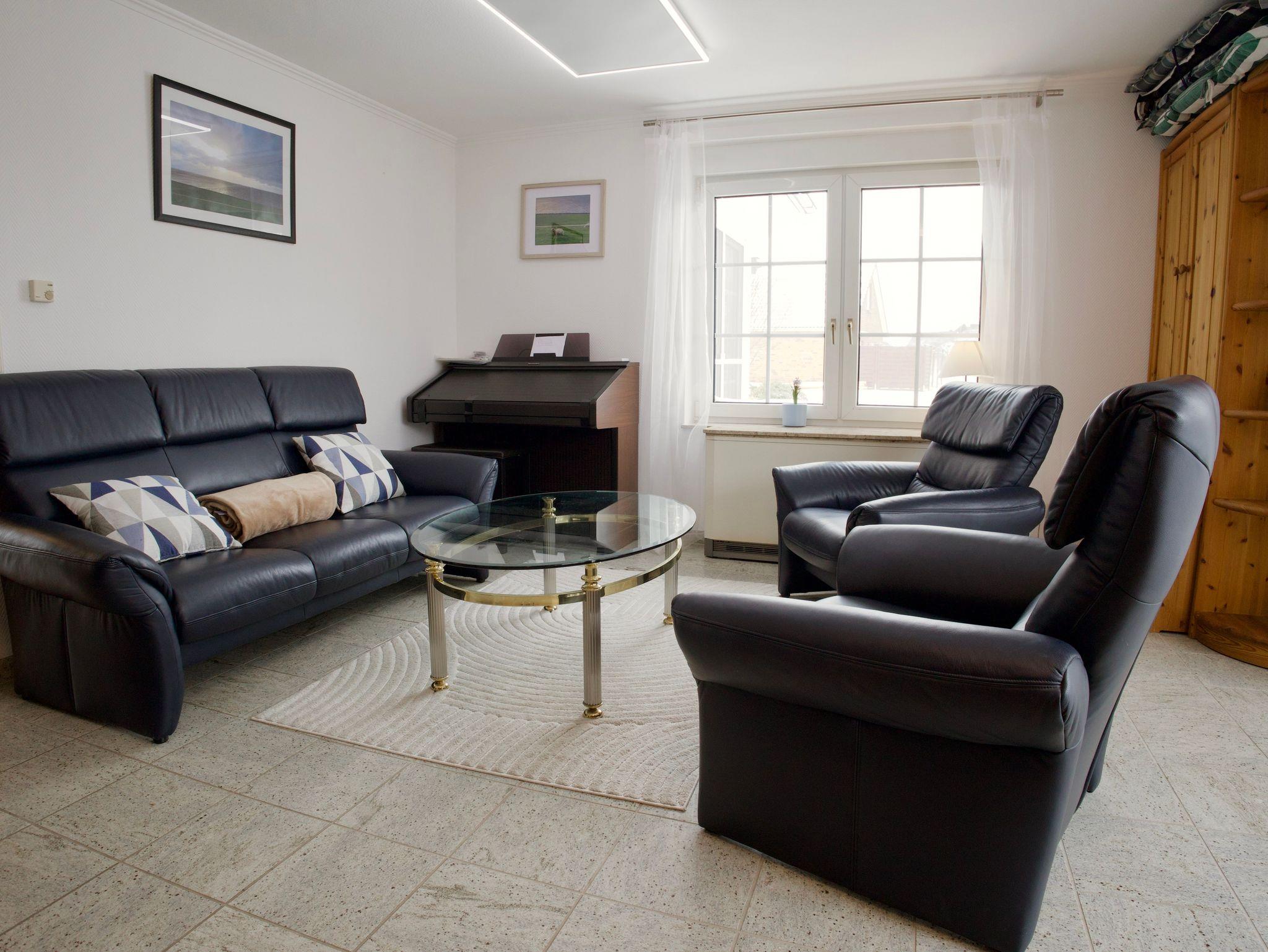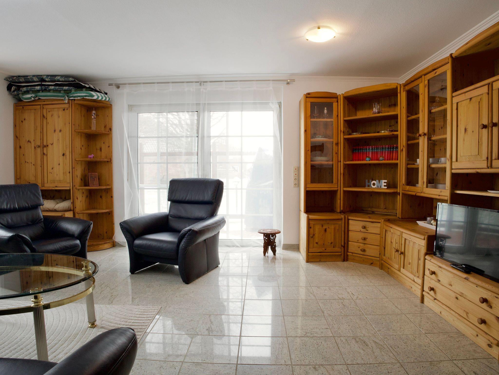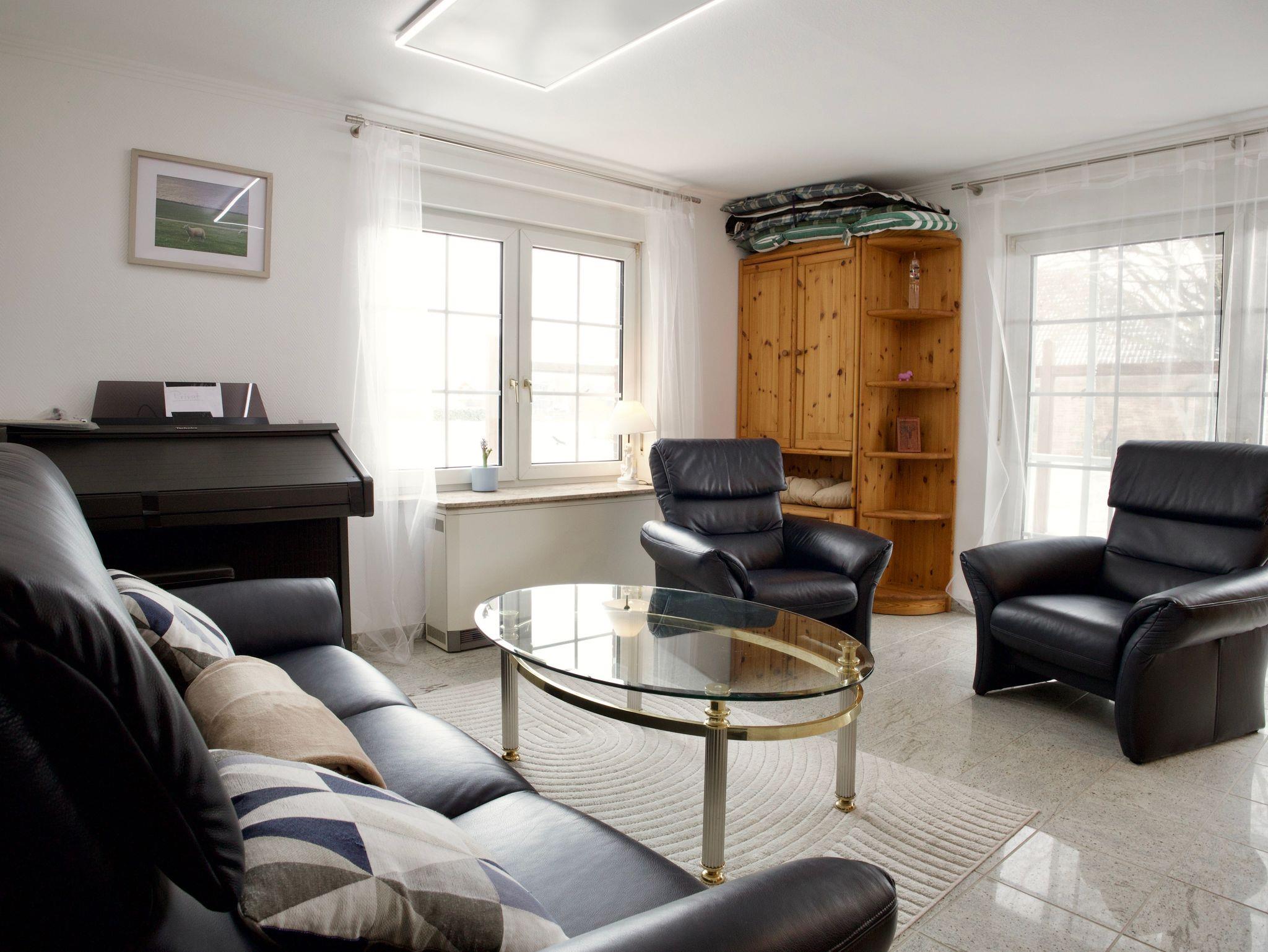 Der großzügige Wohnbereich bietet viel Platz für gemeinsame Stunden. Ein Kaminofen sorgt an kühleren Tagen für eine behagliche Atmosphäre und macht den Raum zu einem gemütlichen Mittelpunkt des Hauses. Von hier aus gelangen Sie direkt in den Garten mit Sonnenterrasse und Strandkorb, der zum Entspannen im Freien einlädt.