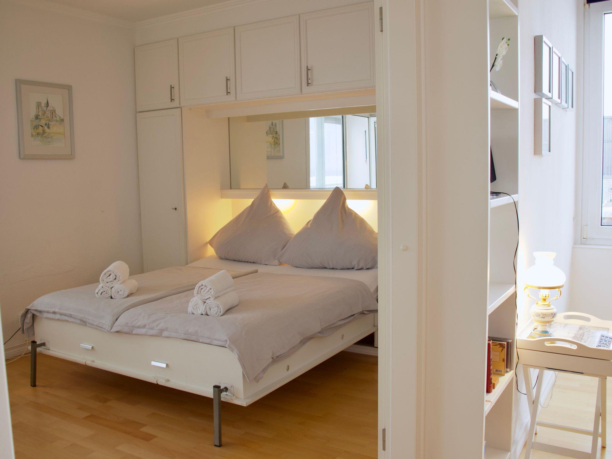 Schon beim Betreten fällt das helle, freundliche Raumgefühl auf. Große Panoramafenster lassen viel Tageslicht herein und geben den Blick frei über die Umgebung. Der Wohn- und Schlafraum ist modern, klar und bewusst zurückhaltend eingerichtet und schafft eine entspannte Atmosphäre. Ergänzt wird die Wohnung durch ein separates Wohnzimmer, das Raum für ruhige Stunden bietet. Ein Smart-TV sowie WLAN stehen hier zur Verfügung.