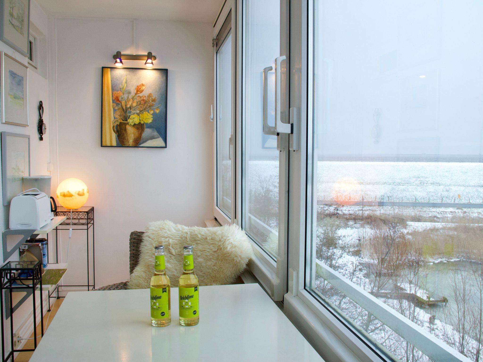 Ein besonderes Merkmal der Wohnung ist der Wintergarten mit gemütlicher Essecke. Von hier aus reicht der Blick über die Nordsee bis zu den Halligen und über Nordstrand, ergänzt durch den Ausblick auf den großen Angelteich direkt neben dem Haus, der die Aussicht um eine ruhige, naturnahe Komponente erweitert.