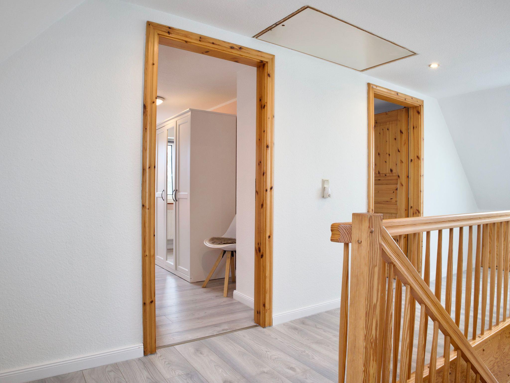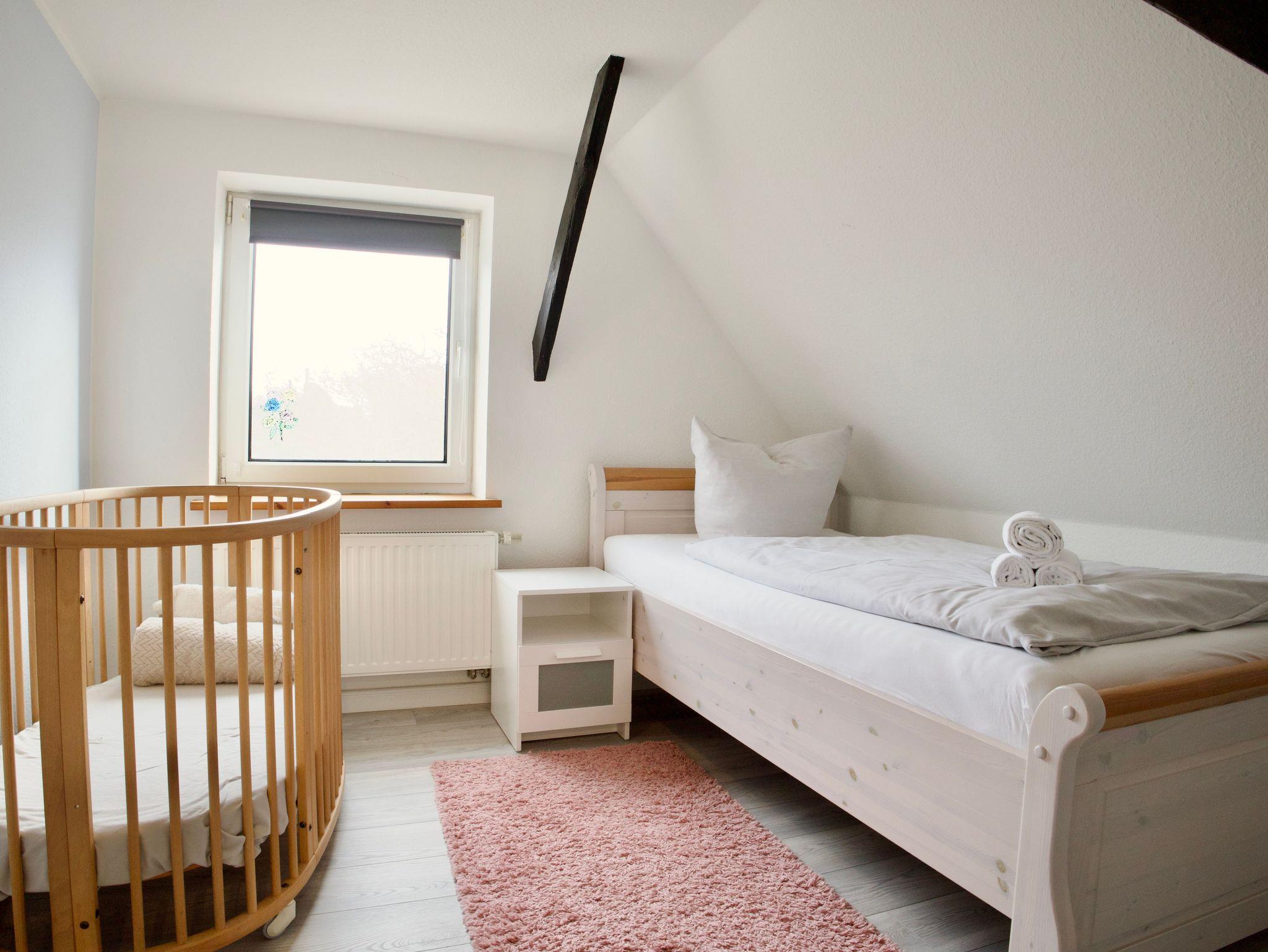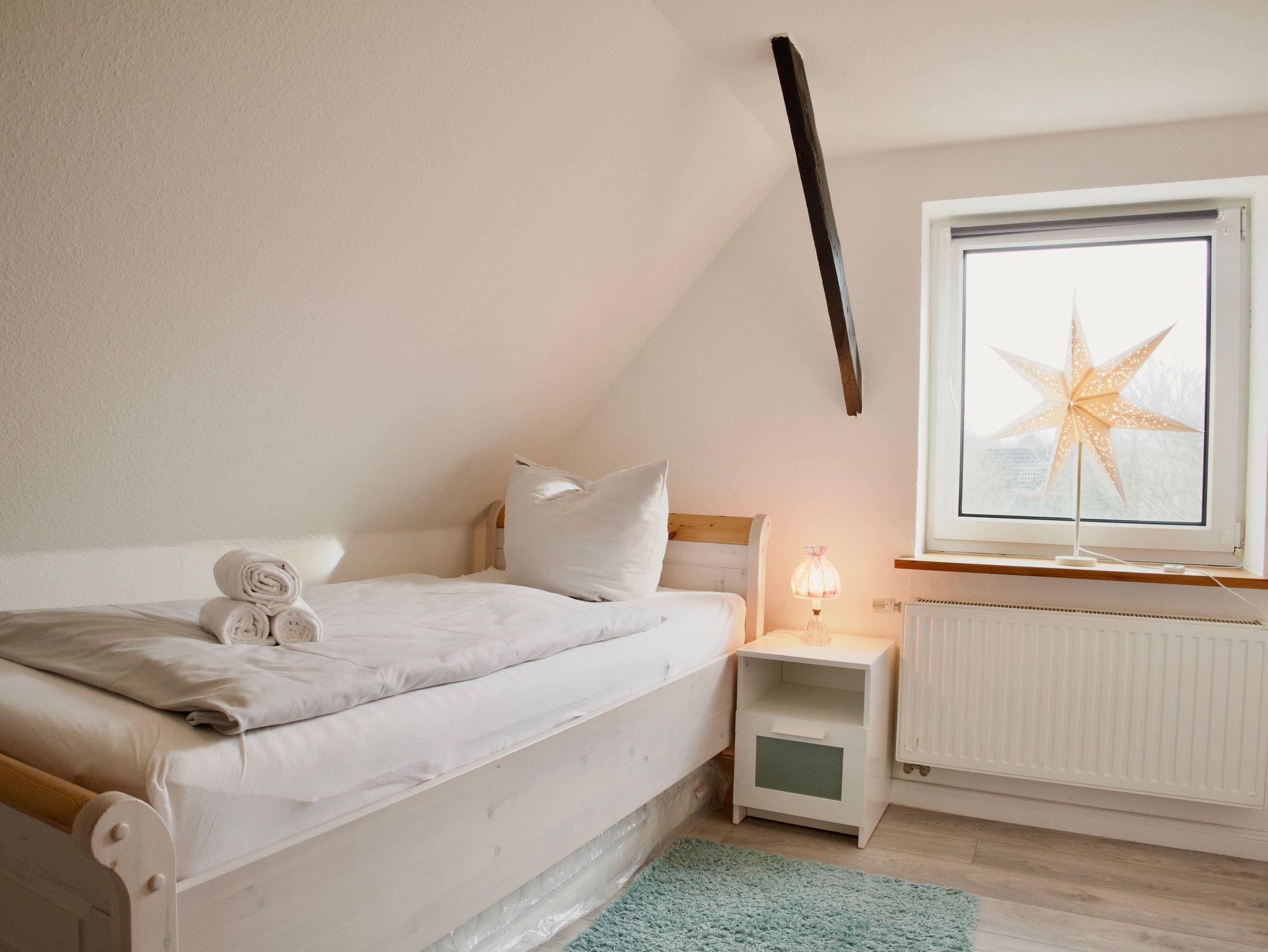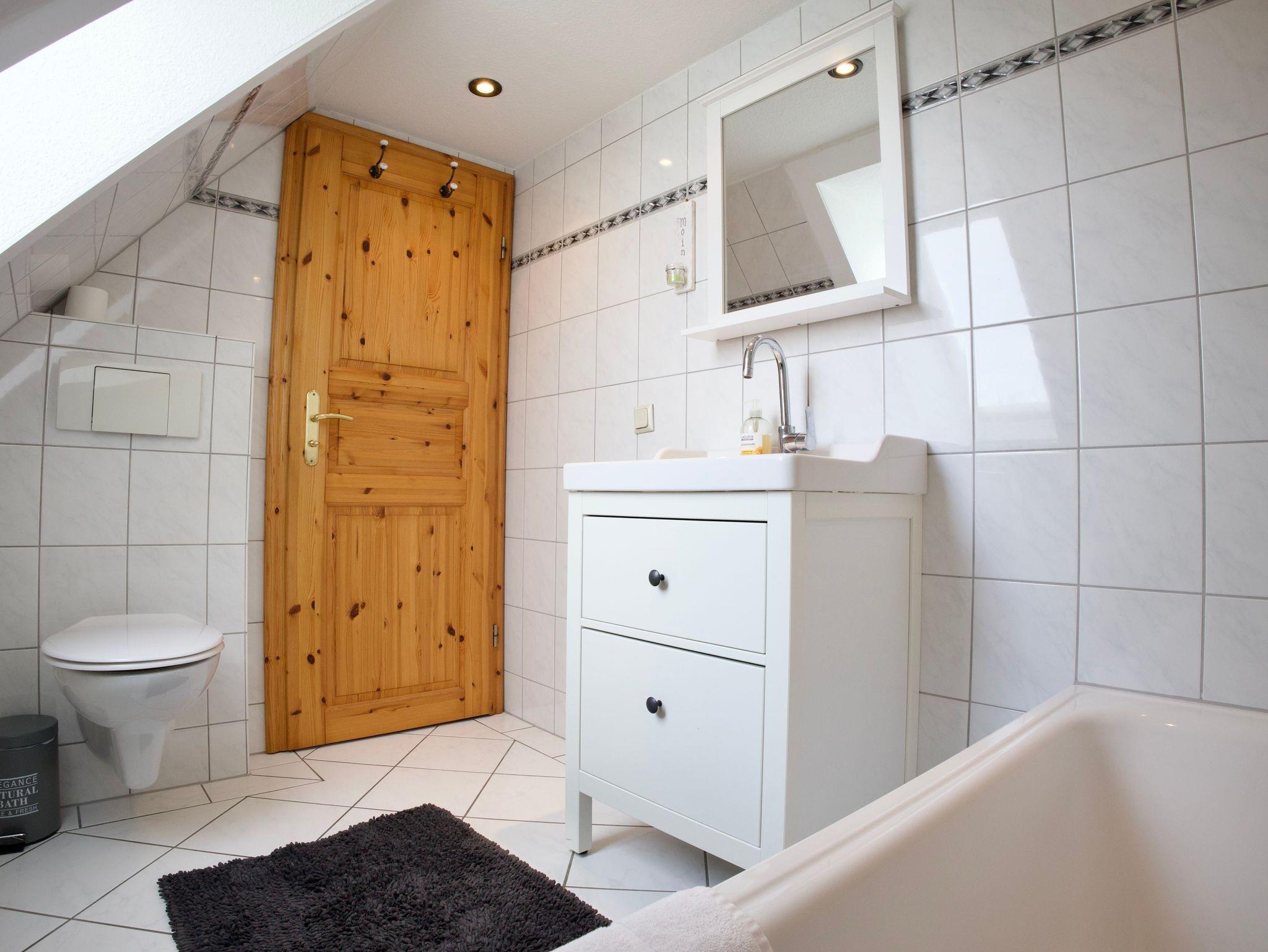 Im Obergeschoss stehen drei ruhig und klar eingerichtete Schlafzimmer zur Verfügung. Eines ist mit einem Doppelbett ausgestattet, die beiden weiteren mit jeweils einem Einzelbett. Ebenfalls im Obergeschoss befindet sich ein stilvolles Badezimmer mit Badewanne. Ein weiteres Badezimmer mit Dusche liegt im Erdgeschoss und ergänzt die Ausstattung sinnvoll. Eine Waschmaschine steht ebenfalls zur Verfügung.