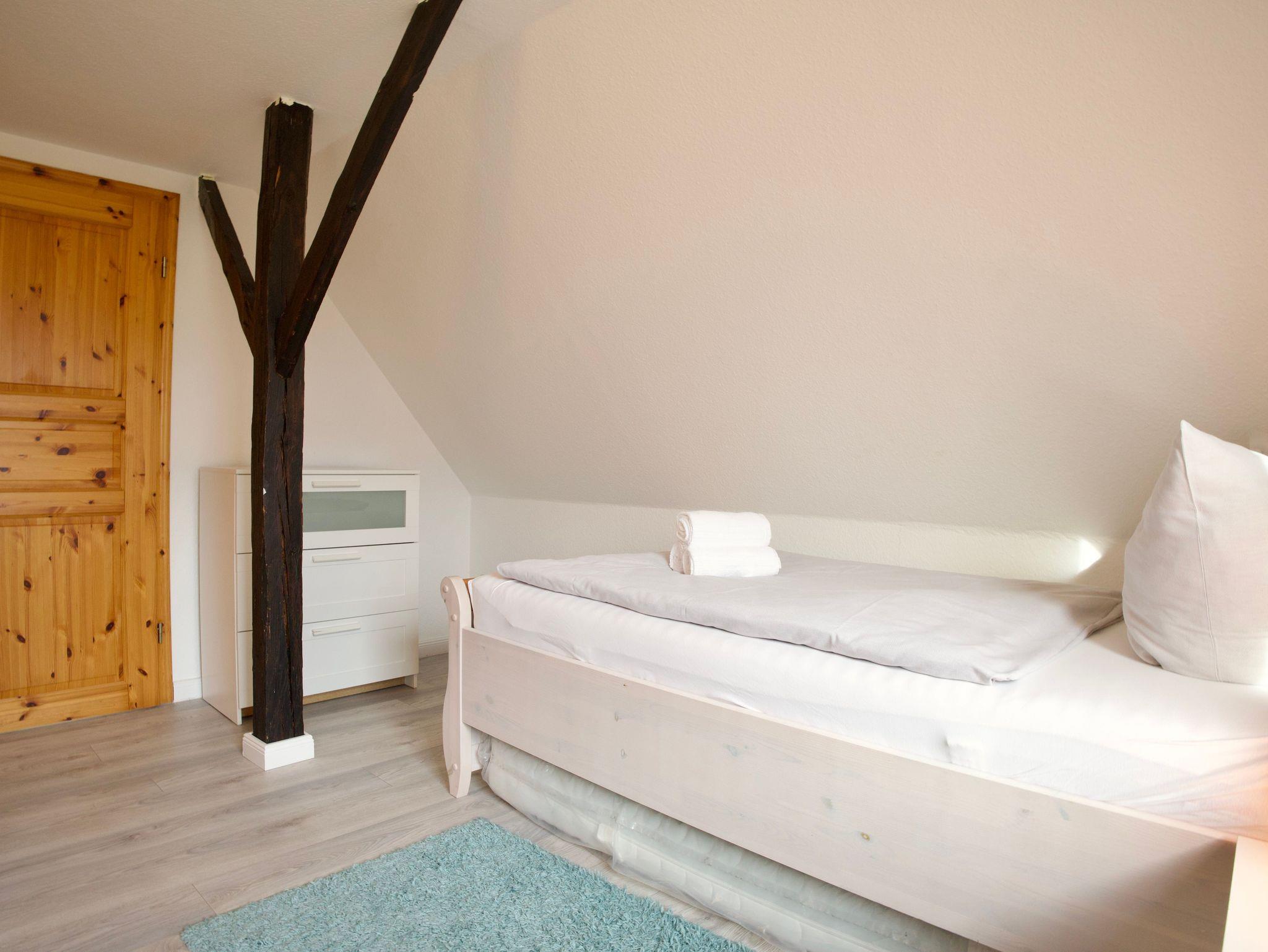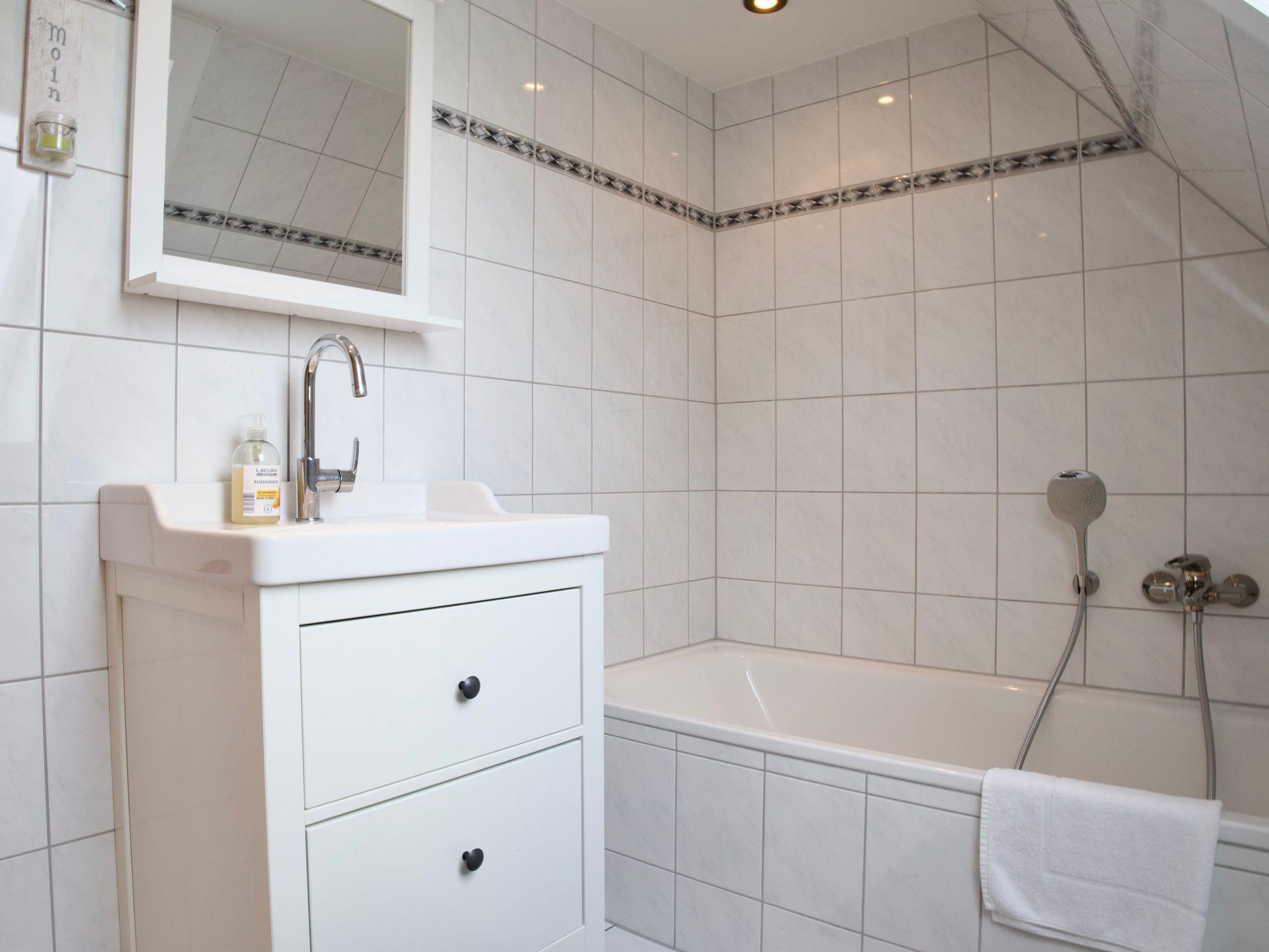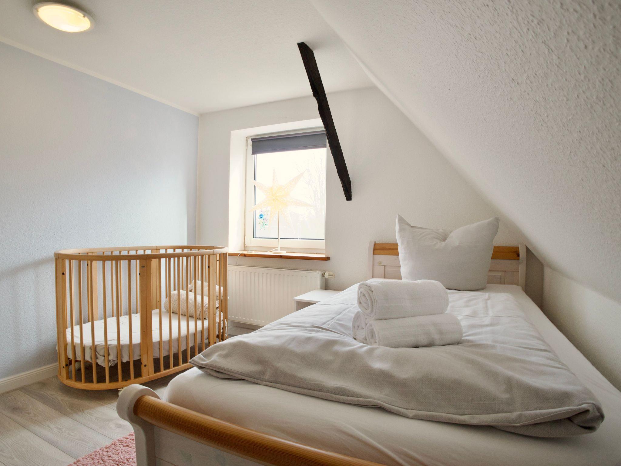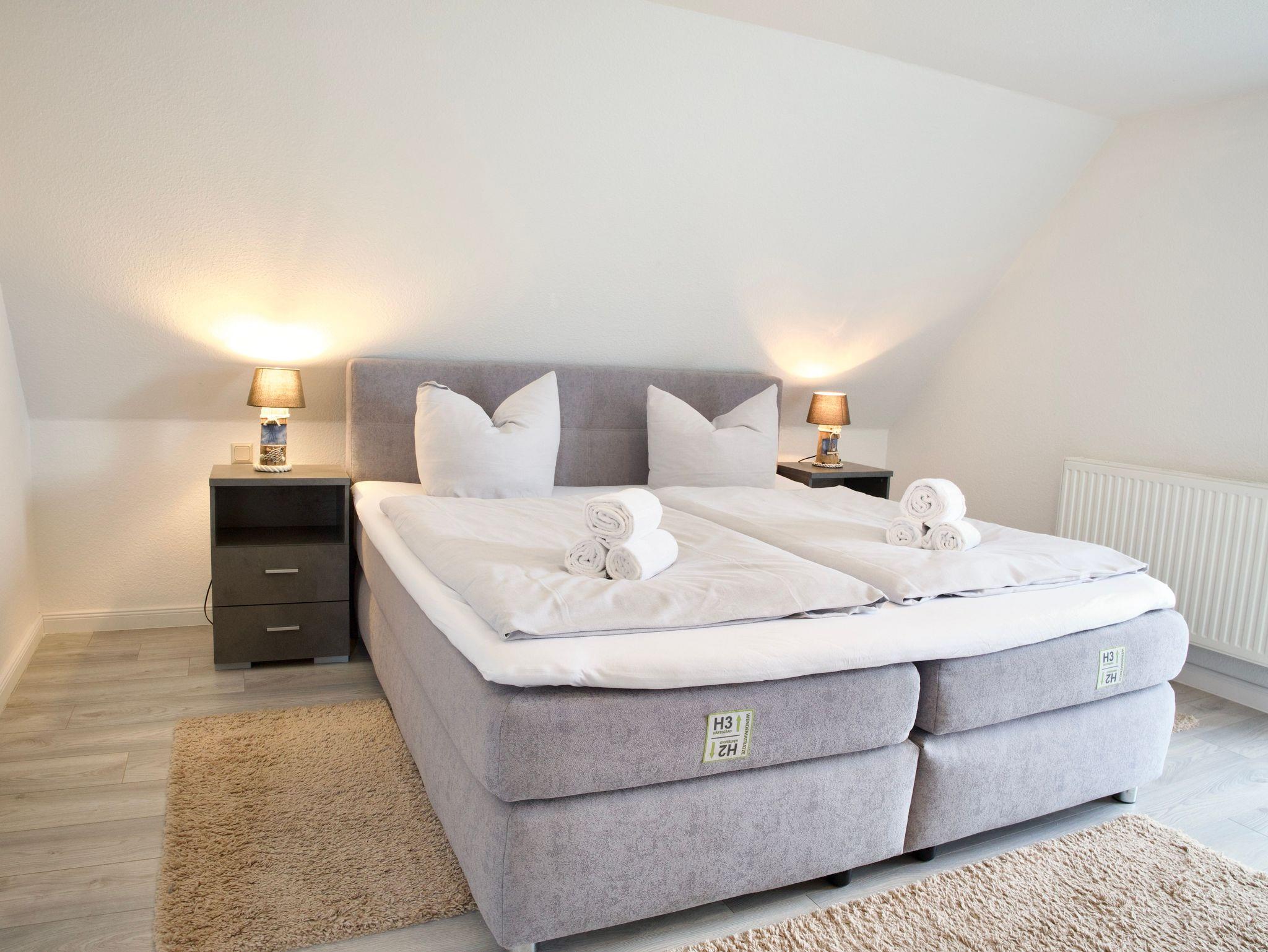 Im Obergeschoss stehen drei ruhig und klar eingerichtete Schlafzimmer zur Verfügung. Eines ist mit einem Doppelbett ausgestattet, die beiden weiteren mit jeweils einem Einzelbett. Ebenfalls im Obergeschoss befindet sich ein stilvolles Badezimmer mit Badewanne. Ein weiteres Badezimmer mit Dusche liegt im Erdgeschoss und ergänzt die Ausstattung sinnvoll. Eine Waschmaschine steht ebenfalls zur Verfügung.