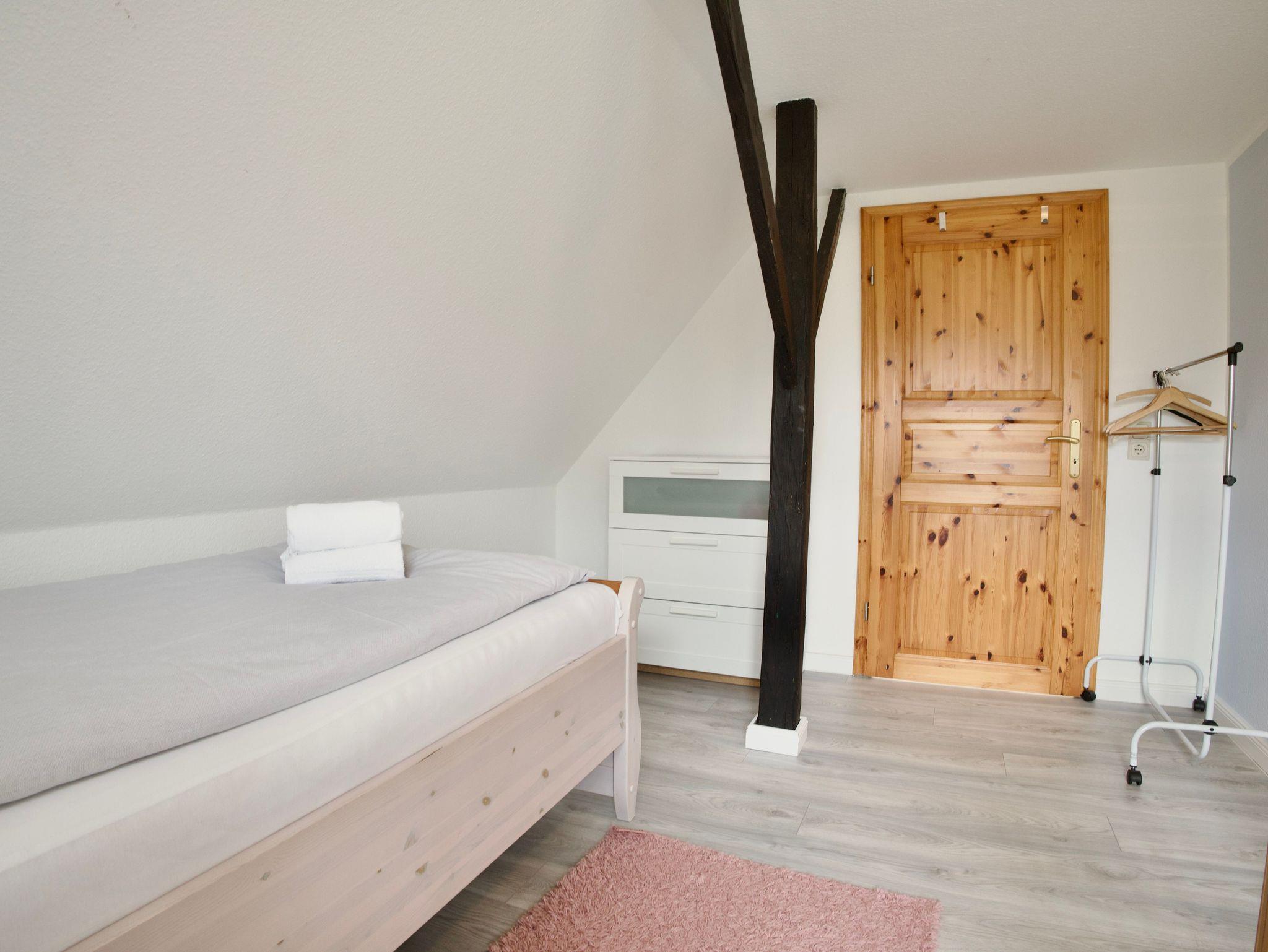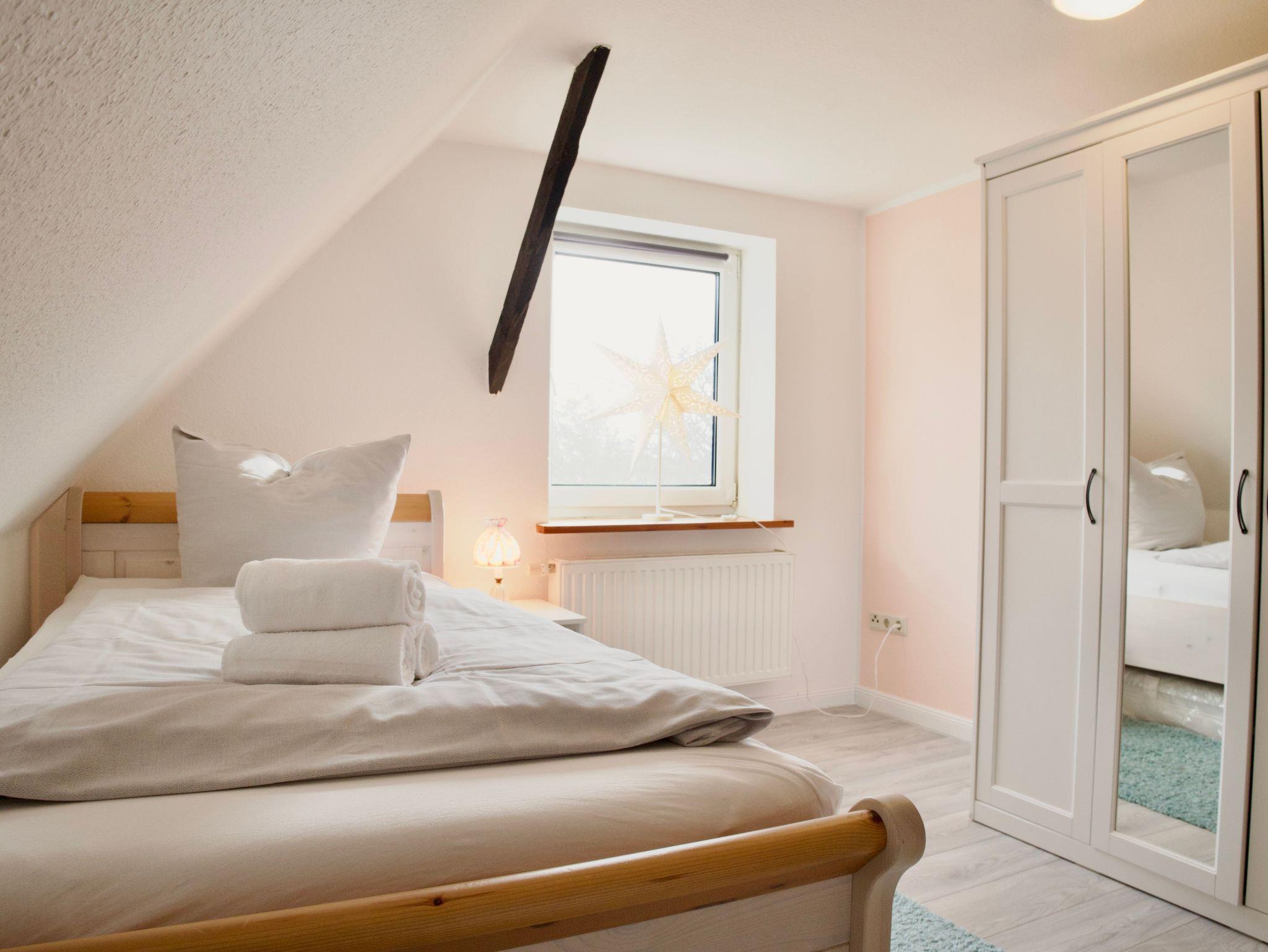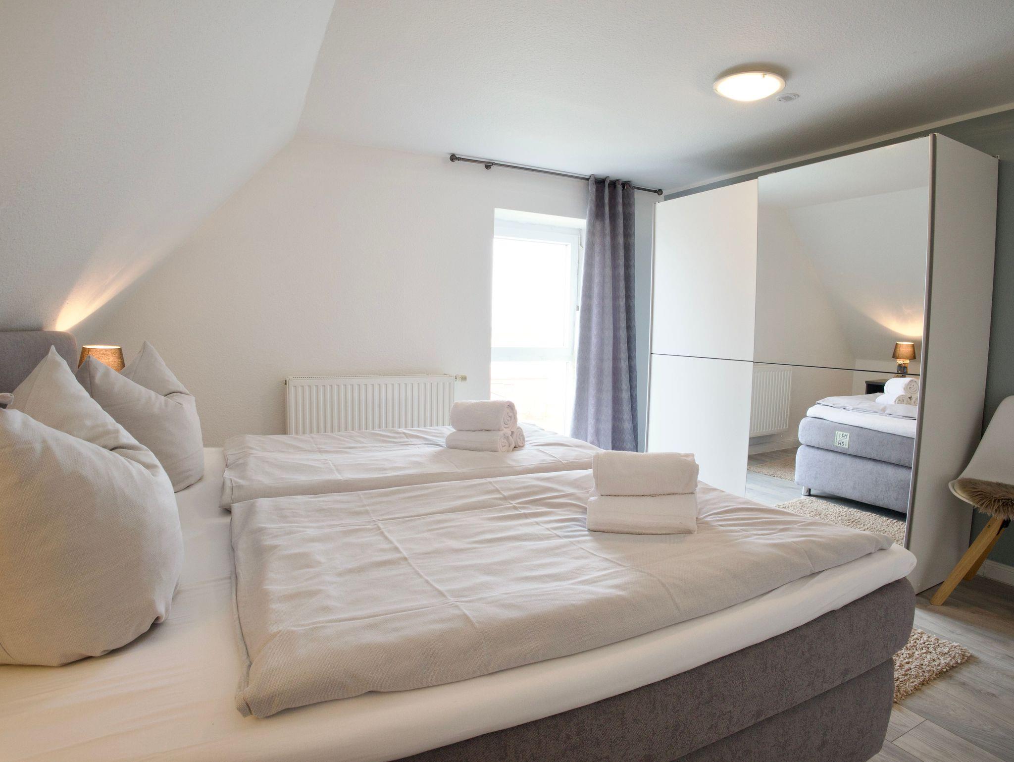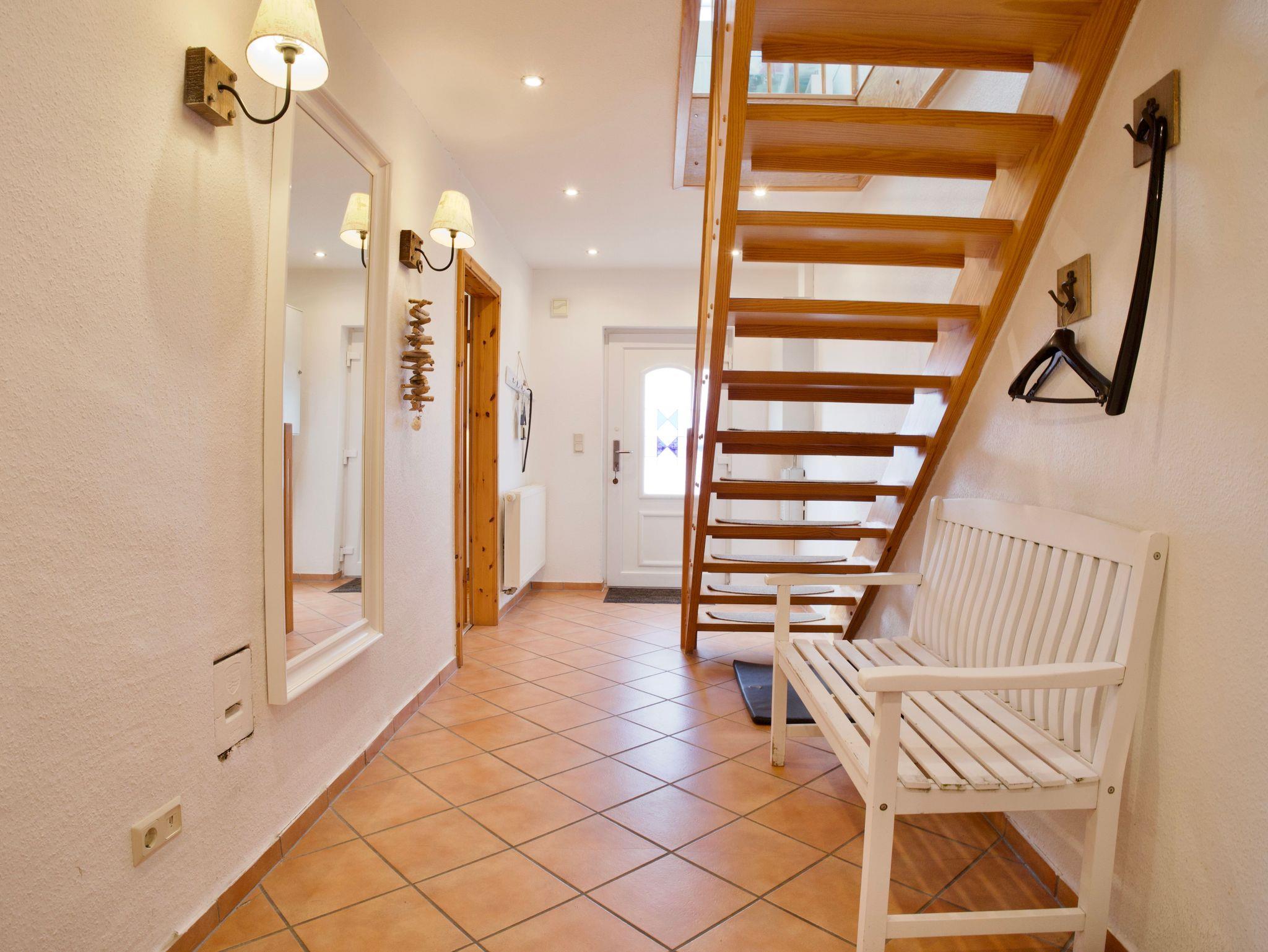 Im Obergeschoss stehen drei ruhig und klar eingerichtete Schlafzimmer zur Verfügung. Eines ist mit einem Doppelbett ausgestattet, die beiden weiteren mit jeweils einem Einzelbett. Ebenfalls im Obergeschoss befindet sich ein stilvolles Badezimmer mit Badewanne. Ein weiteres Badezimmer mit Dusche liegt im Erdgeschoss und ergänzt die Ausstattung sinnvoll. Eine Waschmaschine steht ebenfalls zur Verfügung.
