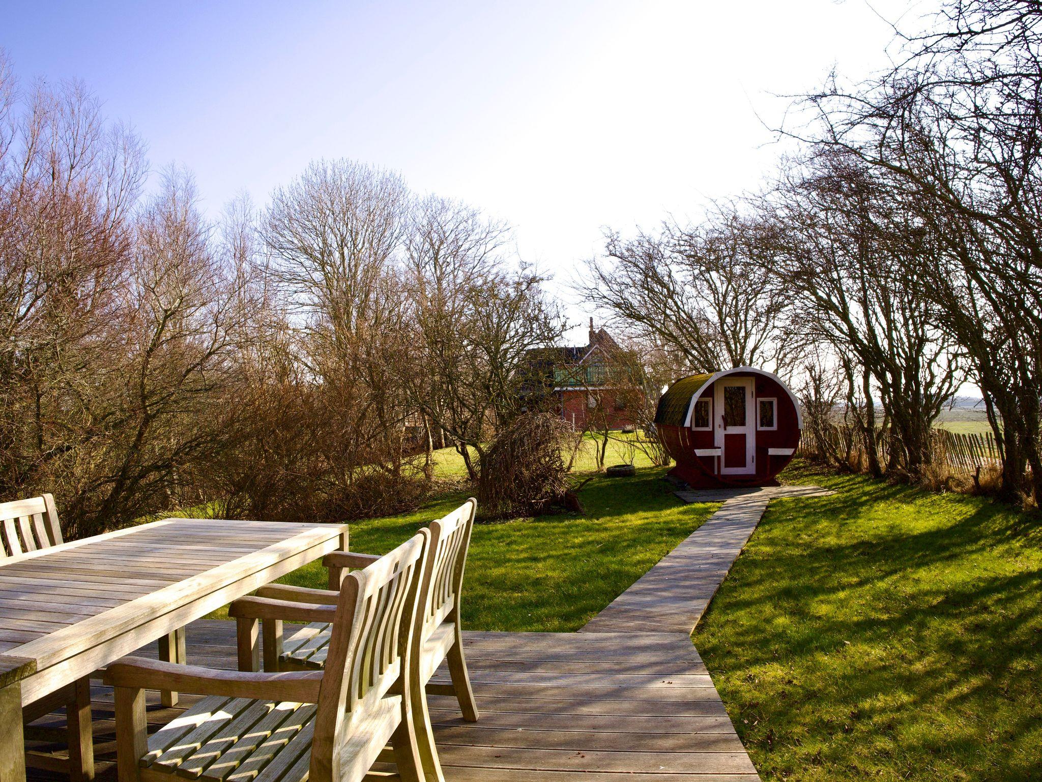 Die sonnige Terrasse ist mit eleganten Gartenmöbeln, einem Grill und einem Strandkorb ausgestattet und lädt zum Verweilen im Freien ein. Der Garten bietet viel Platz und Privatsphäre und macht den Aufenthalt besonders in Kombination mit der Fasssauna zu einem Ort der Erholung.
