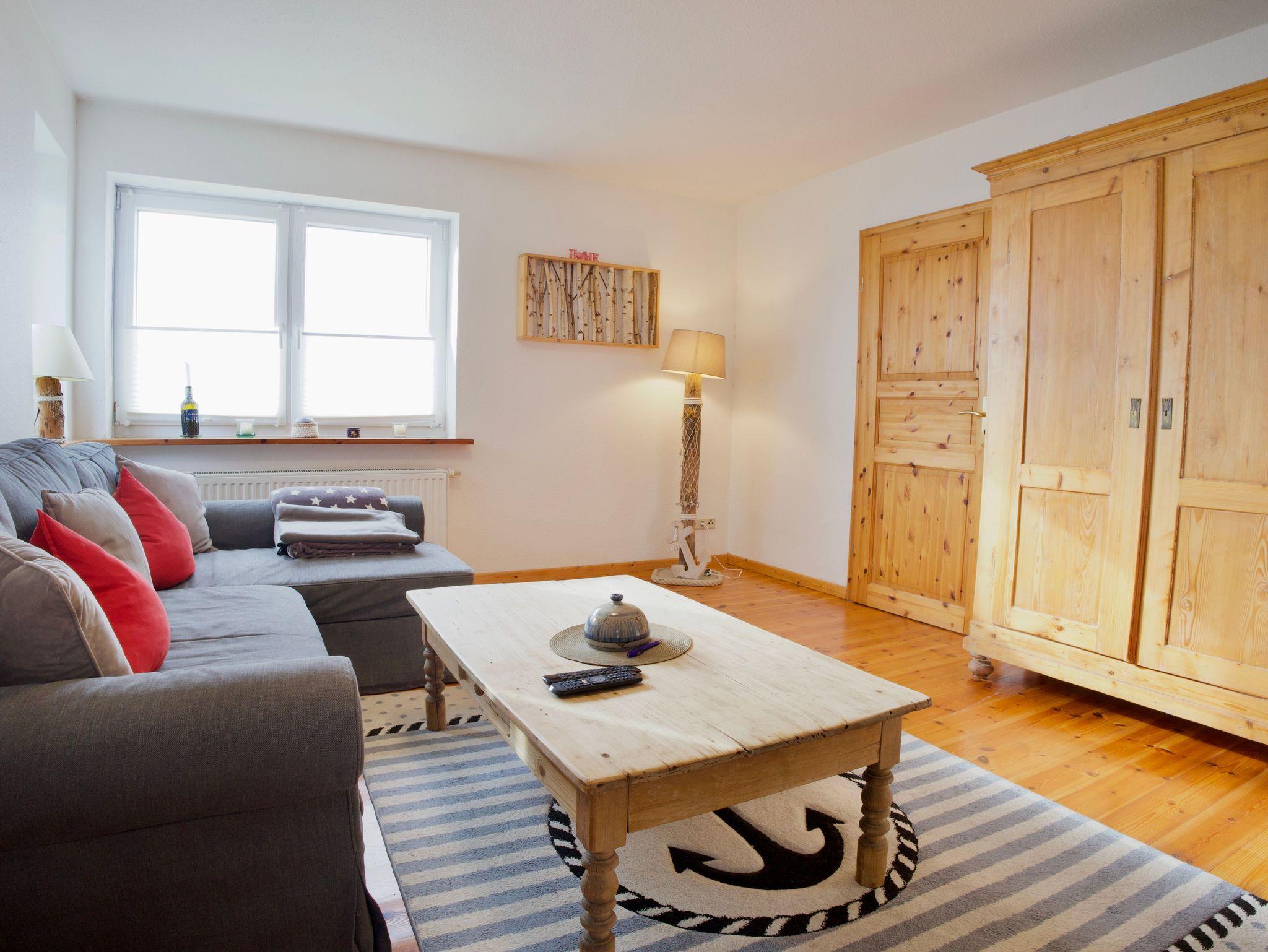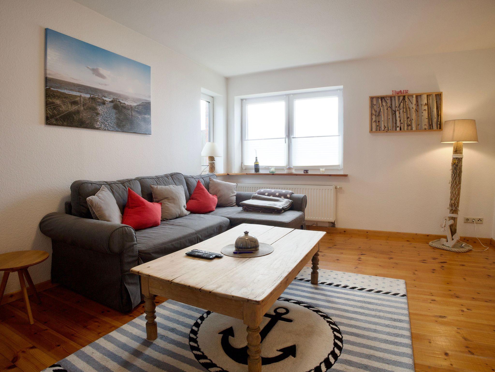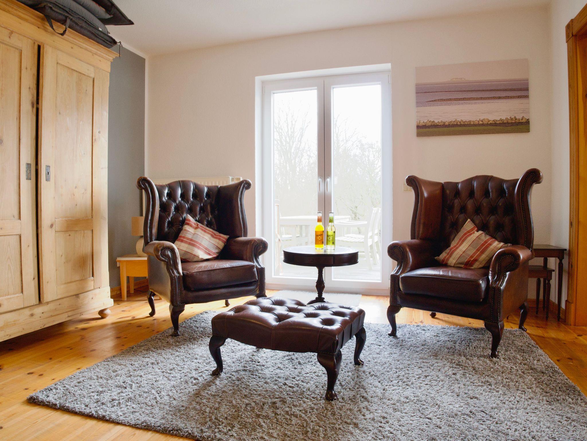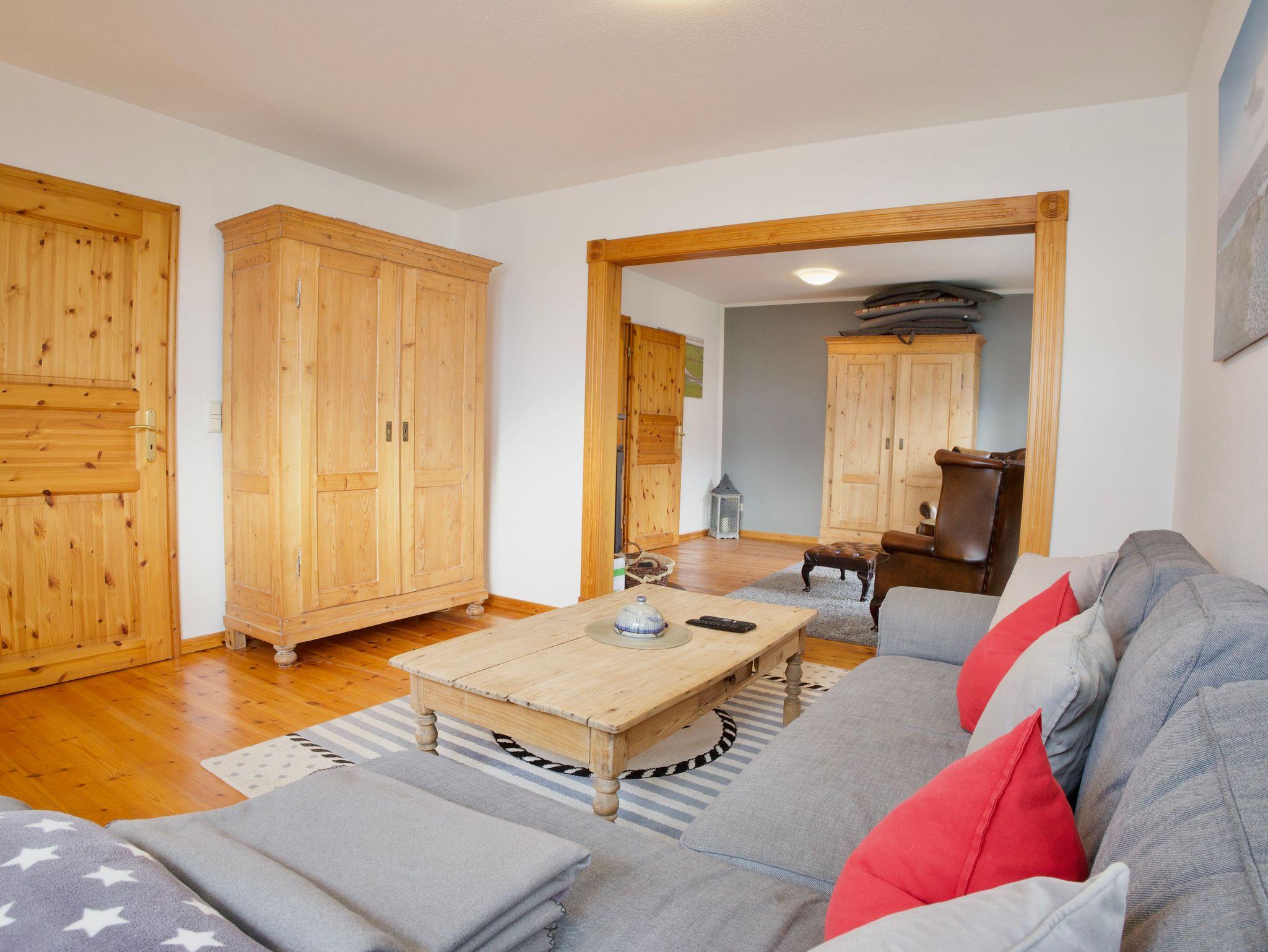 Im Erdgeschoss befindet sich das gemütliche Wohnzimmer mit Holzboden, harmonisch abgestimmten Möbeln, Smart-TV und Kaminofen. Sichtbare Holzbalken und ein großzügiger Durchgang verbinden die Wohnbereiche miteinander und unterstreichen den offenen Charakter des Hauses. Vom Wohnbereich aus eröffnet sich der Blick über die weiten Felder Nordstrands und verstärkt das Gefühl von Ruhe und Weite.