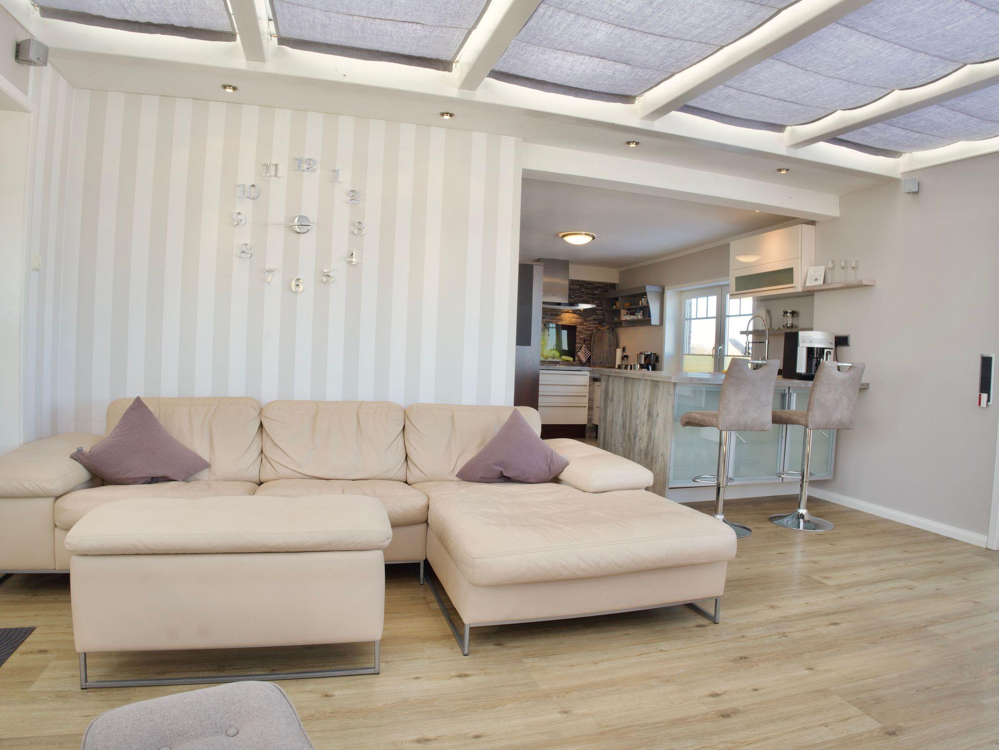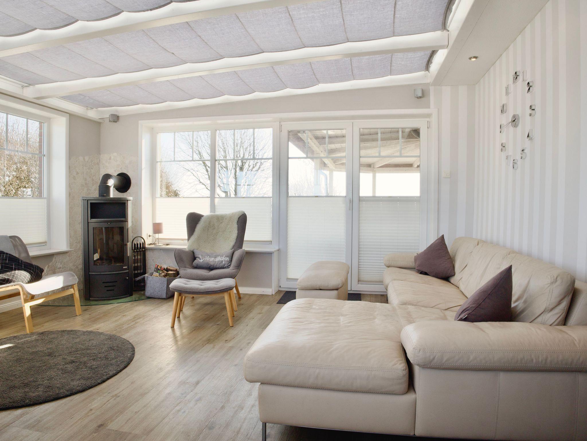 Der helle Wohn- und Essbereich ist zurückhaltend gestaltet und geht fließend in den angrenzenden Wintergarten über. Dieser bildet einen geschützten Rückzugsort mit freiem Blick über die grünen Felder Nordstrands und lädt zu entspannten Stunden zu jeder Jahreszeit ein. Ein Kaminofen ergänzt die wohnliche Atmosphäre und sorgt besonders an kühleren Tagen für behagliche Wärme. Ein Smart-TV fügt sich dezent in den Wohnbereich ein und bietet zusätzlichen Komfort.