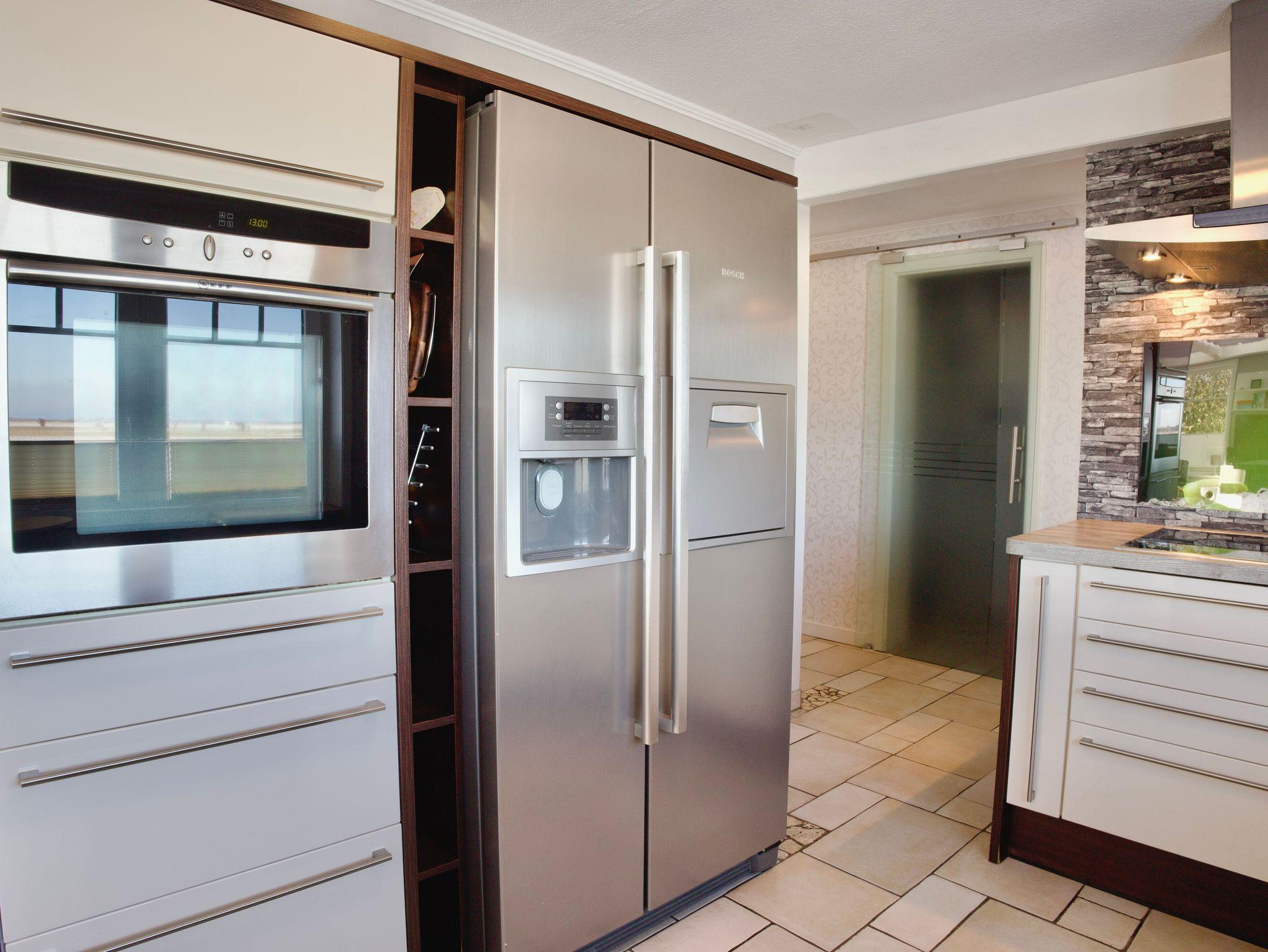 Die großzügige Eckküche ist offen in den Wohnraum integriert und in ruhigen, dezenten Farbtönen gehalten. Sie lässt keine Wünsche für die Selbstversorgung im Urlaub offen und verfügt unter anderem über eine Spülmaschine, eine Kaffeemaschine sowie eine Gefriermöglichkeit. Ein Fenster bringt Tageslicht in den Kochbereich und verbindet auch hier den Innenraum mit der umgebenden Landschaft.