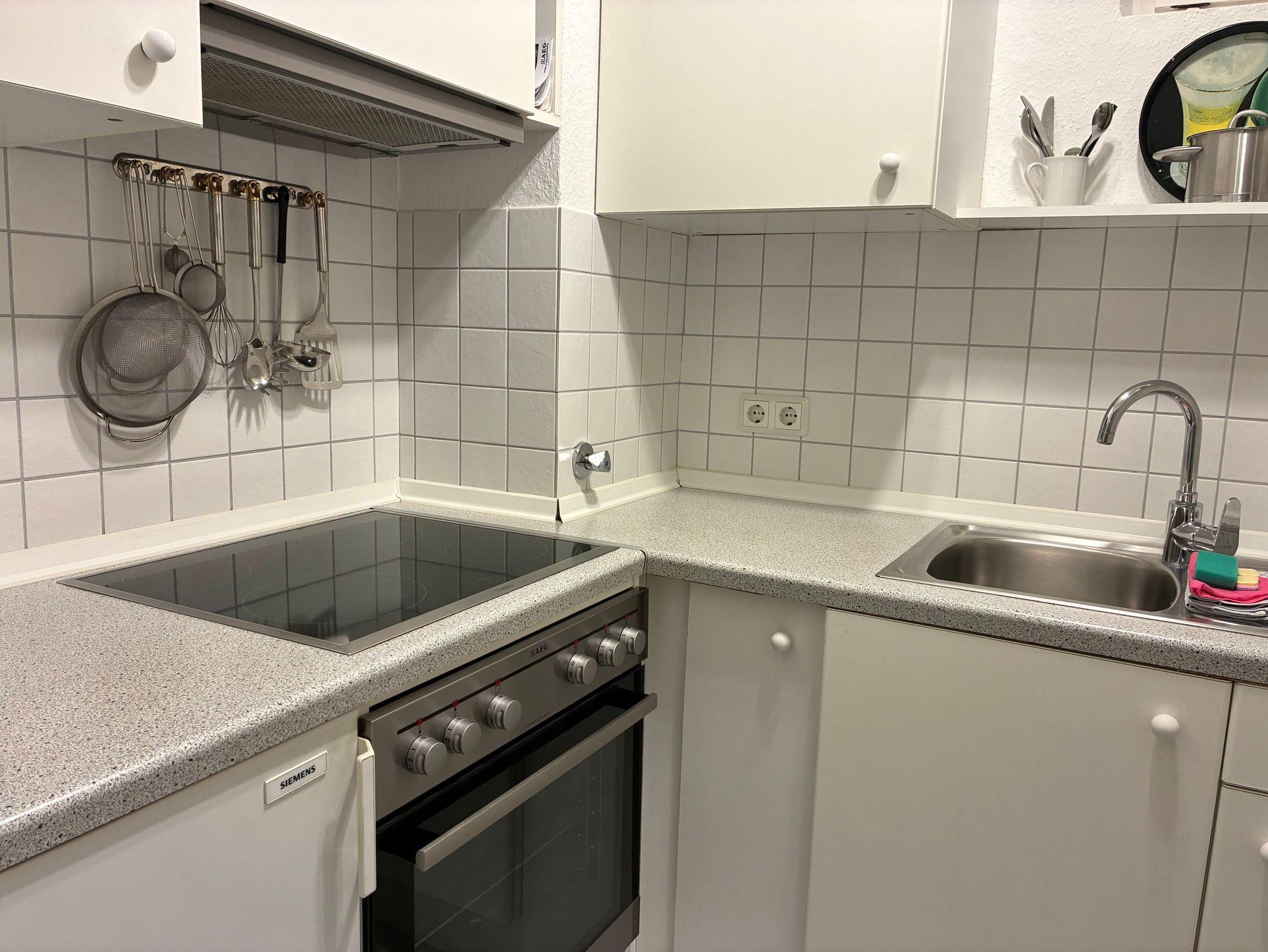 Die funktional gestaltete Küche ist harmonisch in den Wohnraum integriert und eignet sich gut für die Zubereitung eigener Mahlzeiten. Eine Kaffeemaschine sowie eine Gefriermöglichkeit sind vorhanden. Direkt am Fenster befindet sich eine Essecke, die sich ideal für ein entspanntes Frühstück oder einen Kaffee zwischendurch eignet.