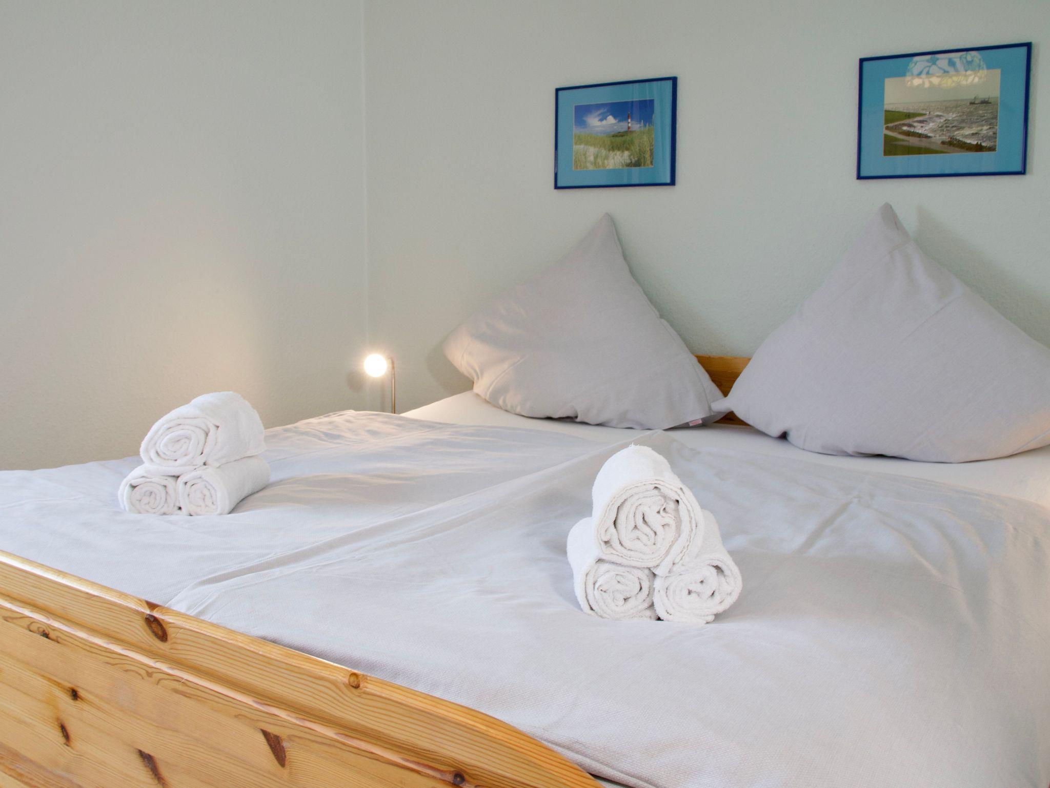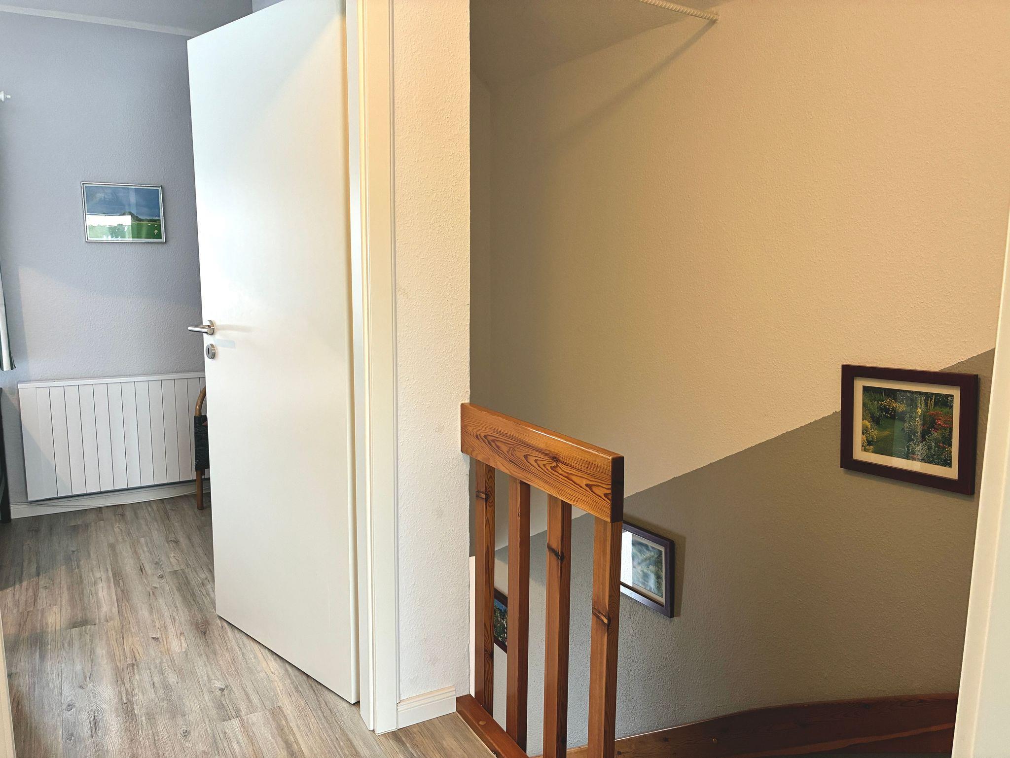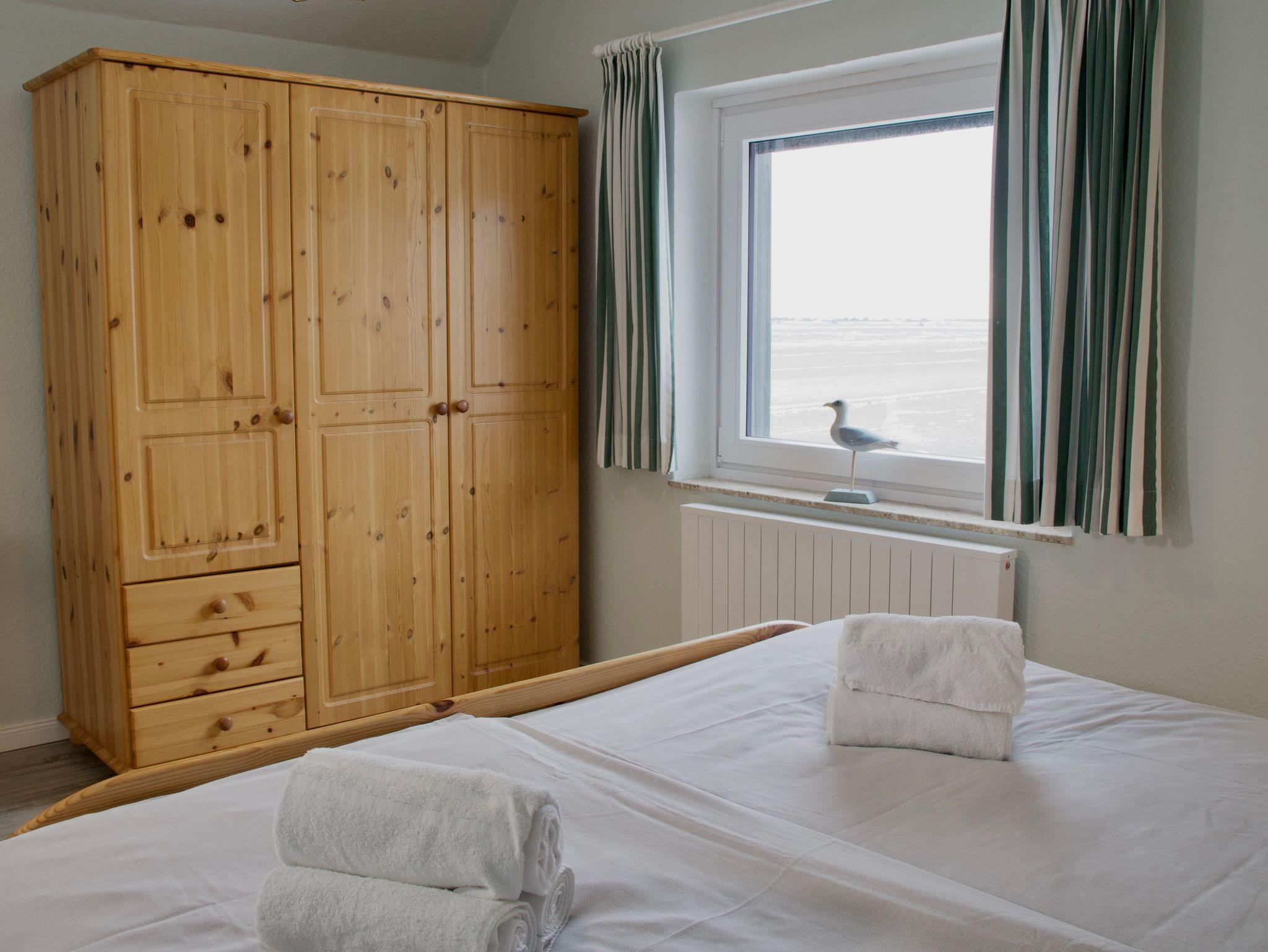 Das Haus verfügt über zwei Schlafzimmer. Eines ist mit einem Doppelbett ausgestattet, das zweite mit zwei Einzelbetten und hell sowie übersichtlich gestaltet. Im Obergeschoss befindet sich das Duschbad, zusätzlich steht im Erdgeschoss ein separates Gäste-WC zur Verfügung.
