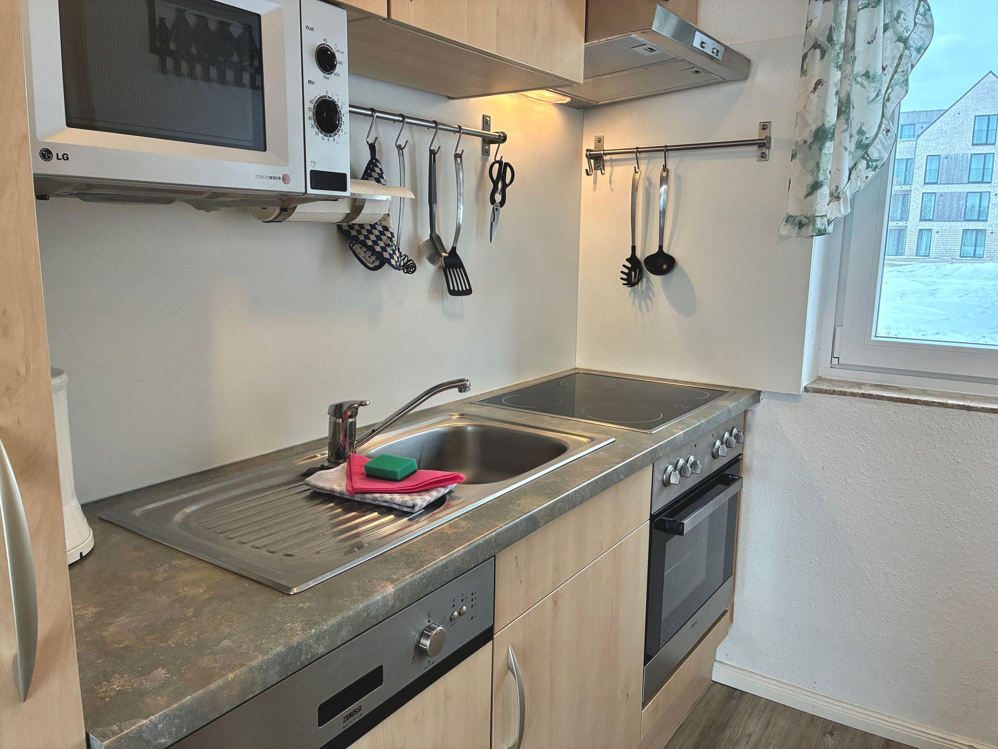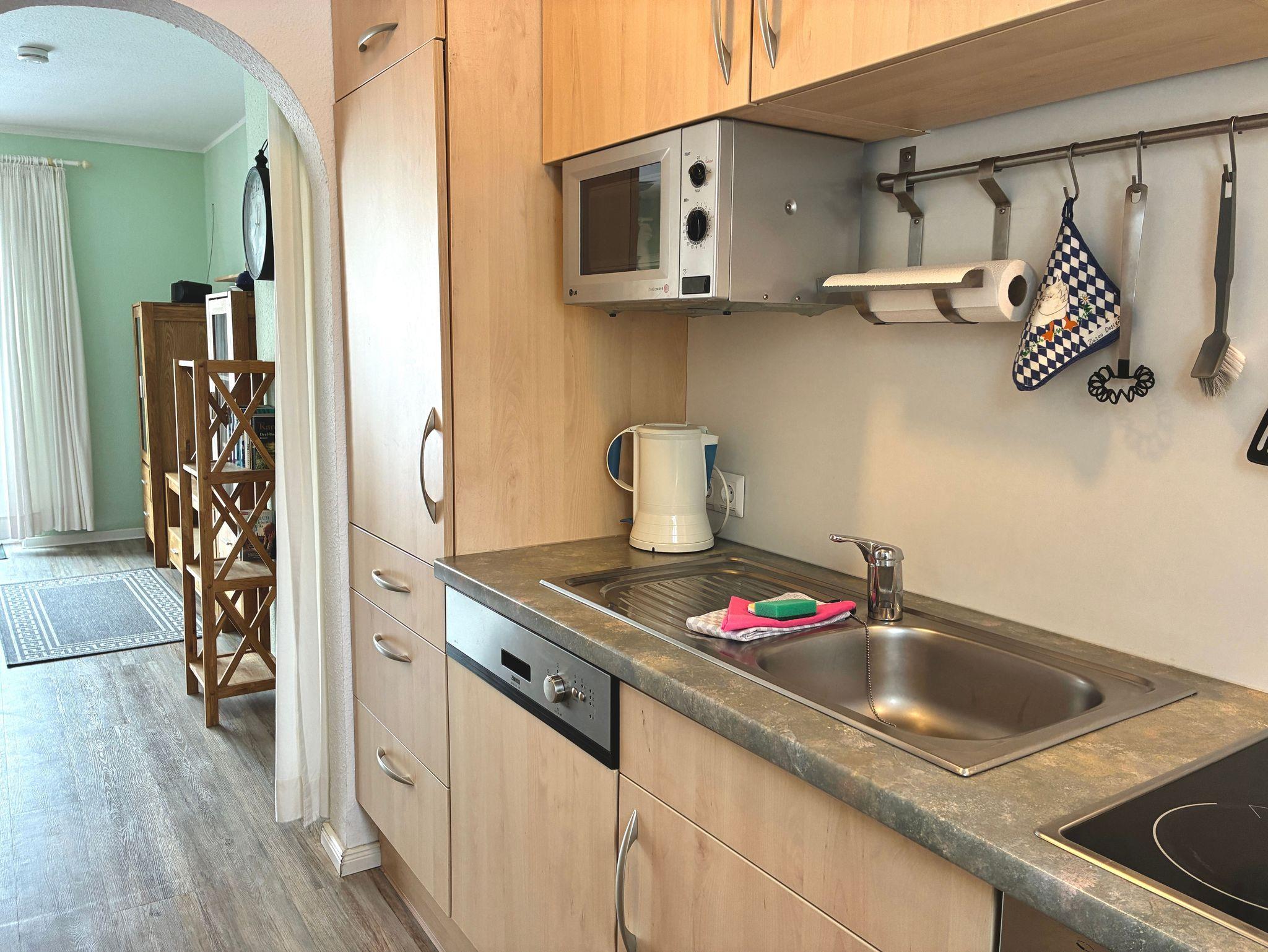Die Küche ist über einen Bogen mit dem Wohnbereich verbunden und fügt sich harmonisch in das Raumkonzept ein. Sie ist funktional ausgestattet und verfügt über eine Spülmaschine, eine Gefriermöglichkeit sowie eine Kaffeemaschine. Ein Fenster sorgt auch hier für zusätzliches Tageslicht und unterstreicht den wohnlichen Charakter.