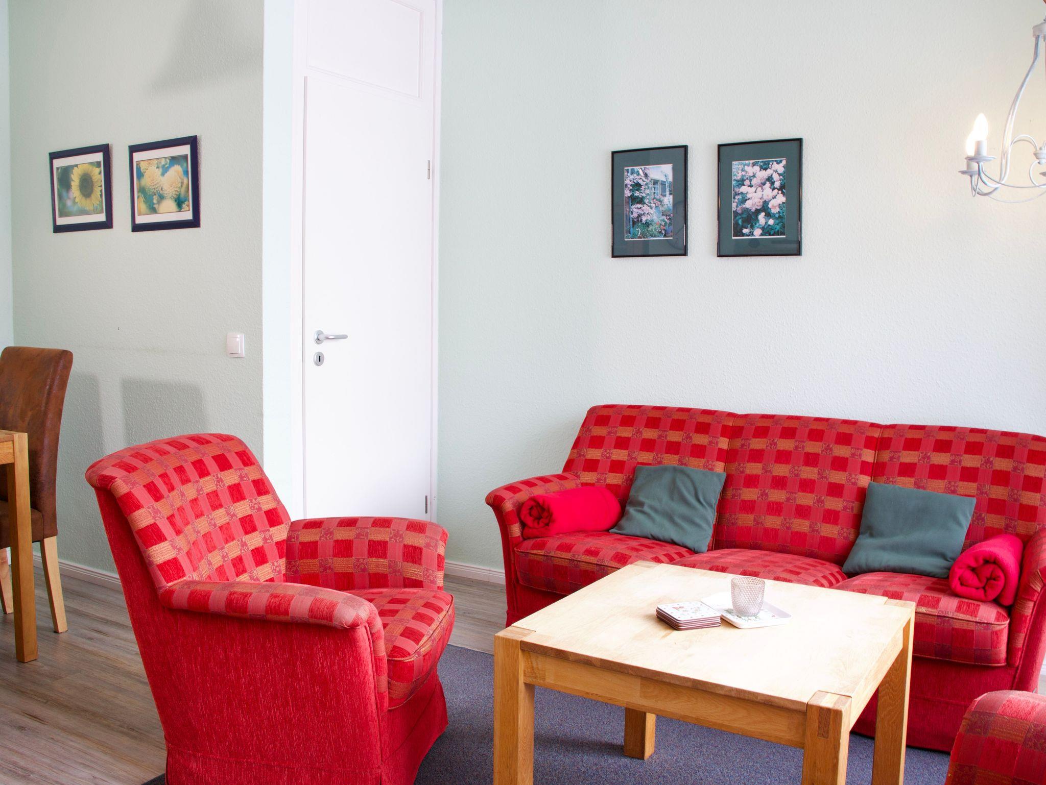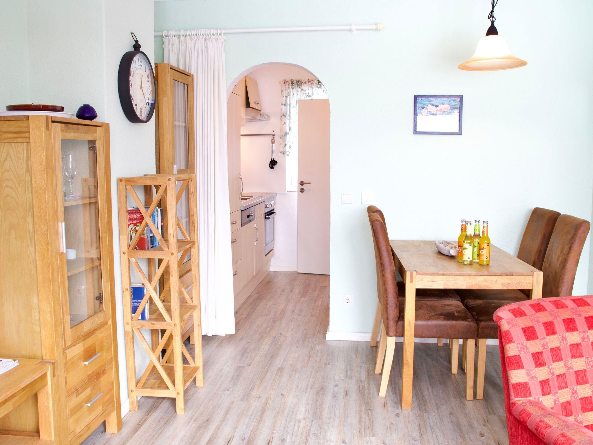 Im Erdgeschoss befindet sich der offen gestaltete Wohn- und Essbereich. Große Terrassentüren und Fenster sorgen für viel Tageslicht und verleihen dem Raum eine freundliche, offene Wirkung. Der Wohnbereich lädt mit seiner behaglichen Gestaltung zu entspannten Stunden ein und öffnet sich direkt zur Südterrasse, die den Wohnraum nach draußen erweitert. Ein Strandkorb steht hier ebenfalls zur Verfügung.
