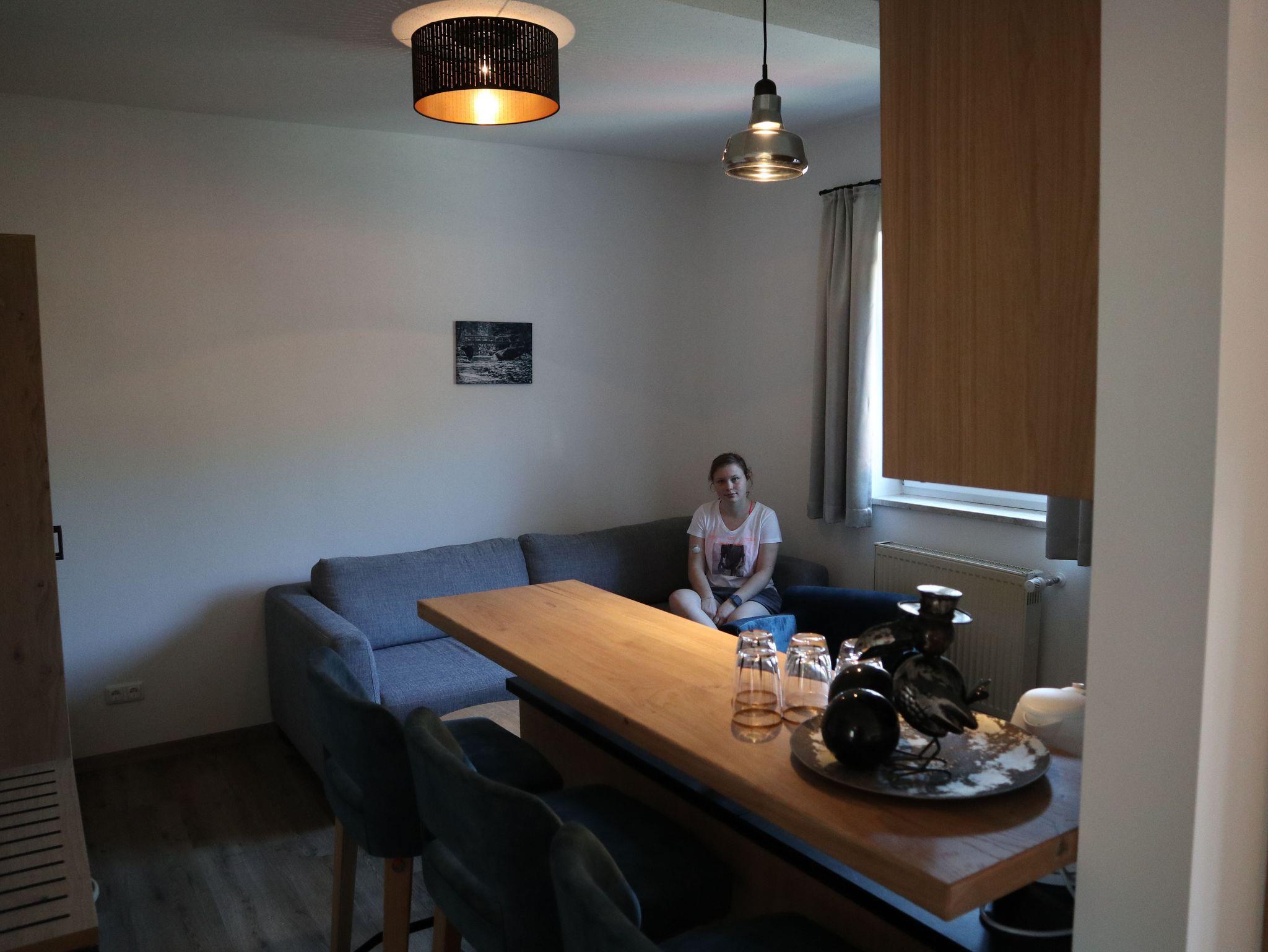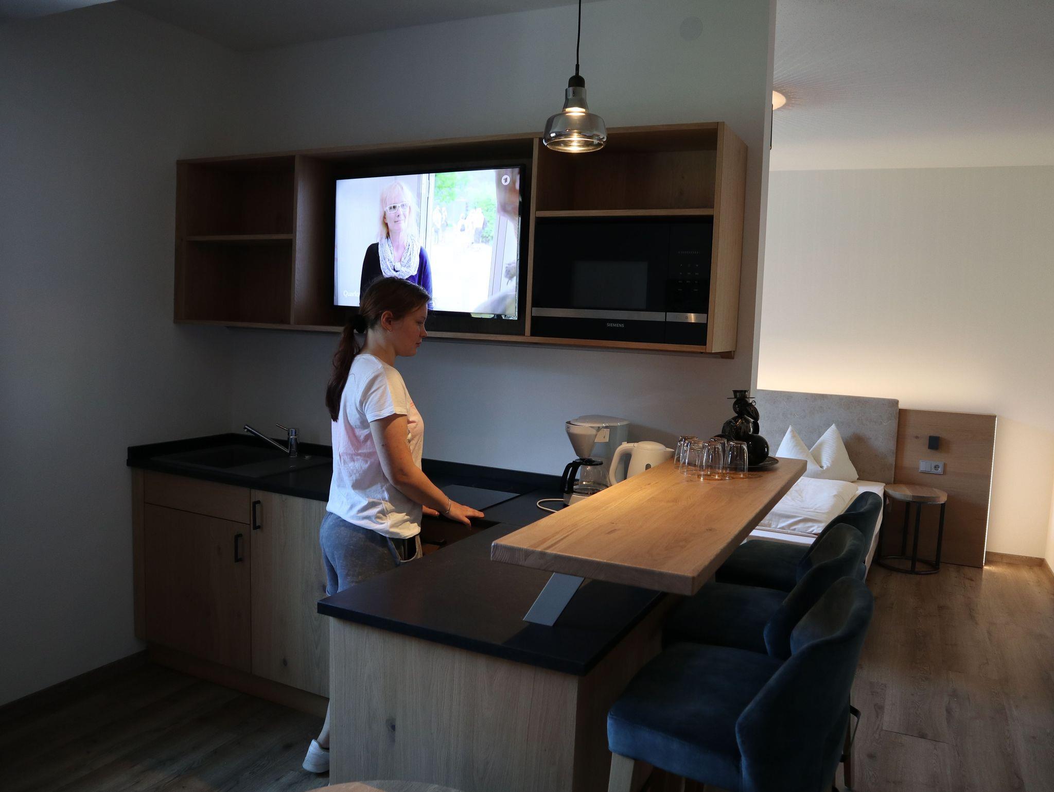 Die stilvolle Einrichtung des Apartments schafft eine angenehme Wohnatmosphäre, in der Sie sich nach einem erlebnisreichen Tag ideal entspannen können. Das Apartment verfügt über einen Vorraum, kleine Küche, Essplatz, Doppelbett, Couch, Sat-TV, Badezimmer mit ebenerdig begehbarer Dusche sowie über einen Balkon mit Blick ins Erlautal oder zum Vogtpark.