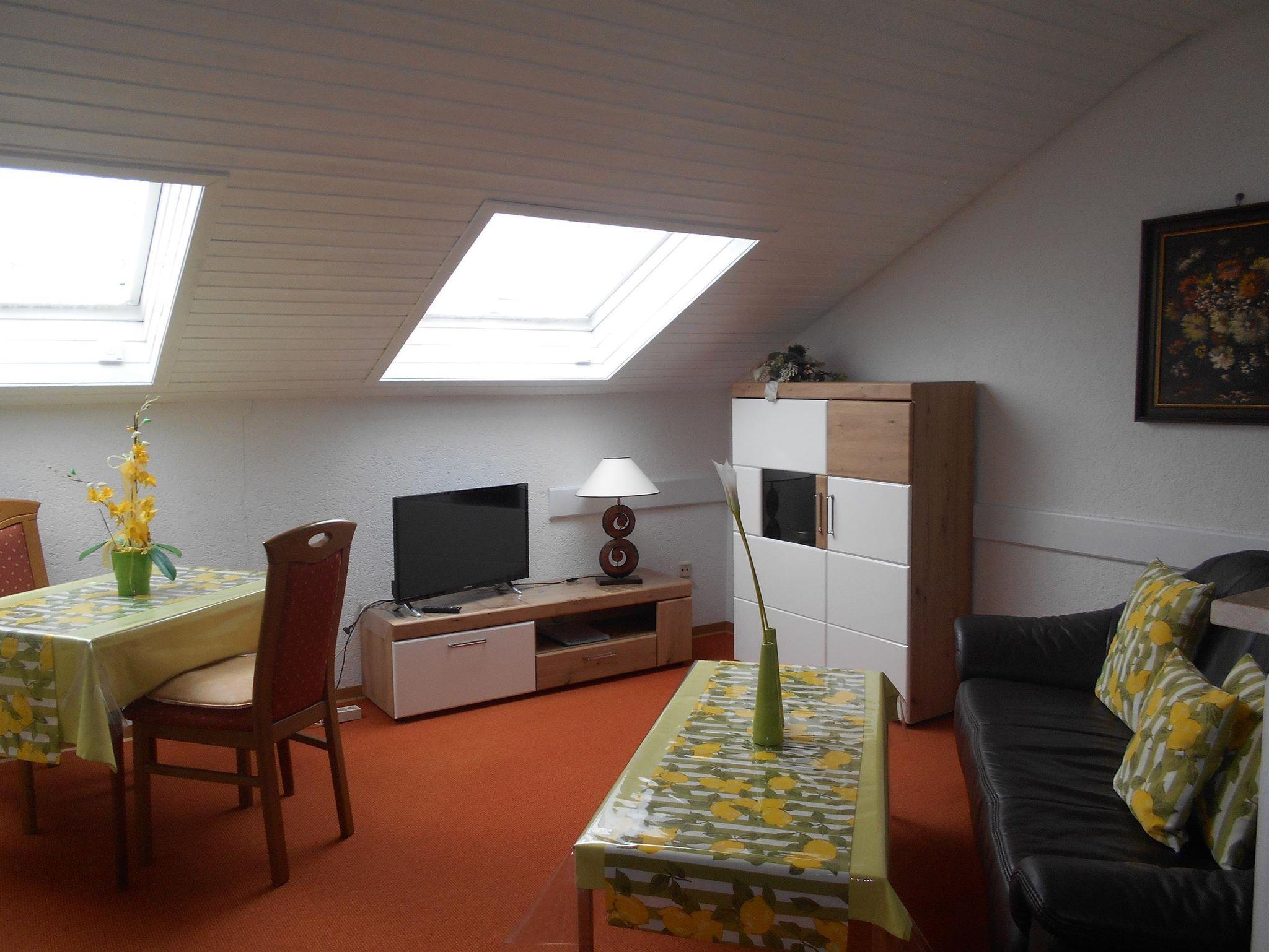 Unsere großzügige Ferienwohnung „Fantasie“ befindet sich im Dachgeschoss. Sie verfügt über ein Schlafzimmer, ein Wohnzimmer, Bad mit Dusche sowie eine Küchenzeile. Das Wohnzimmer ist mit einem gemütlichen Sofa und TV/Radio ausgestattet. WLAN steht Ihnen kostenfrei zur Verfügung.