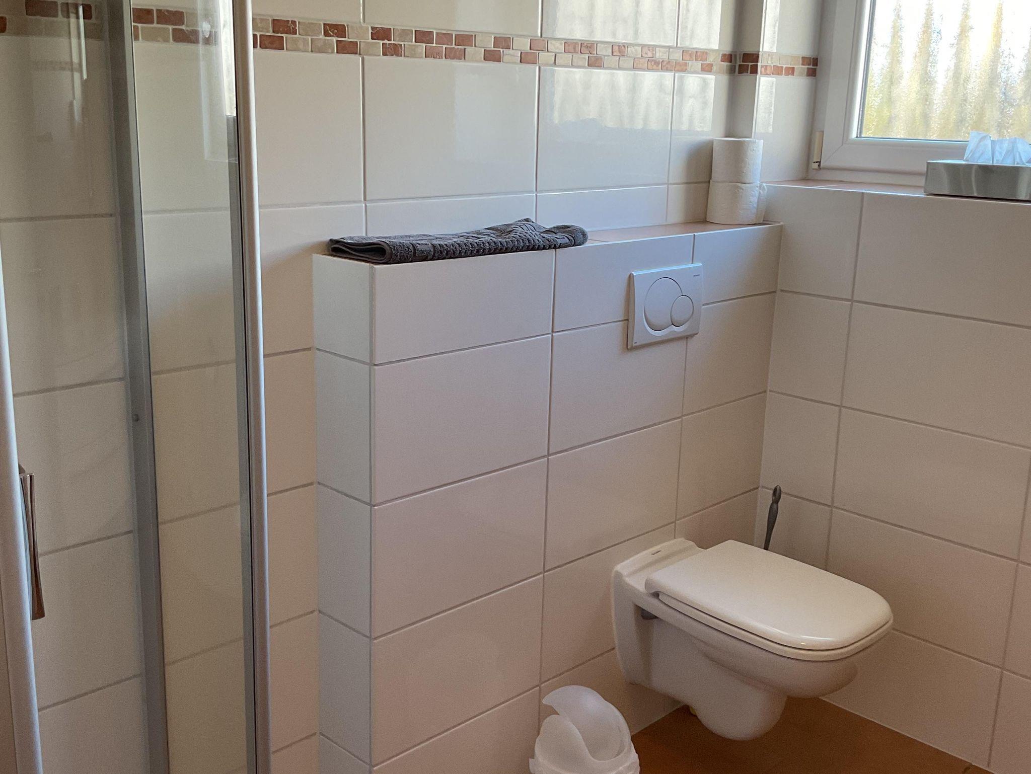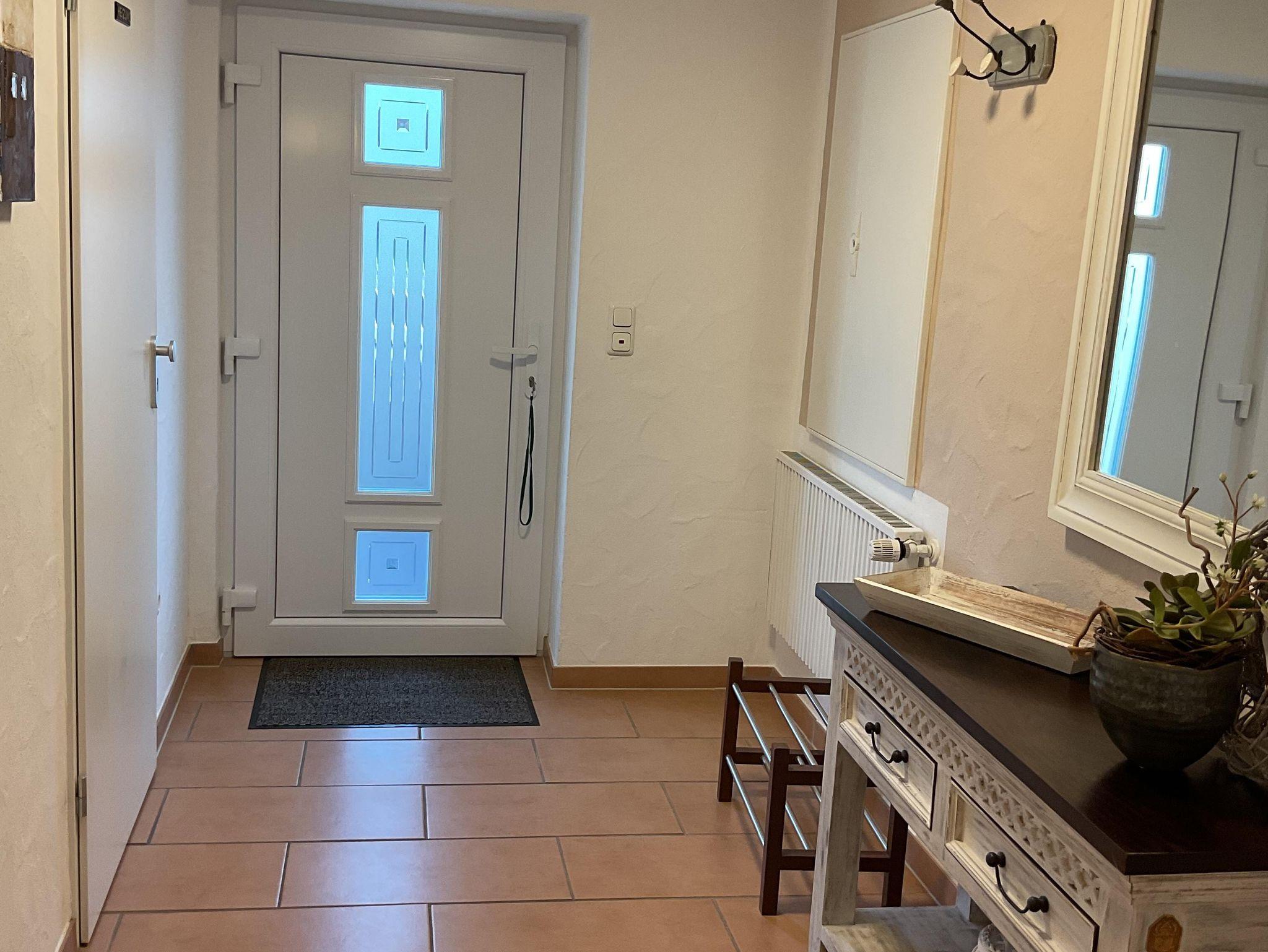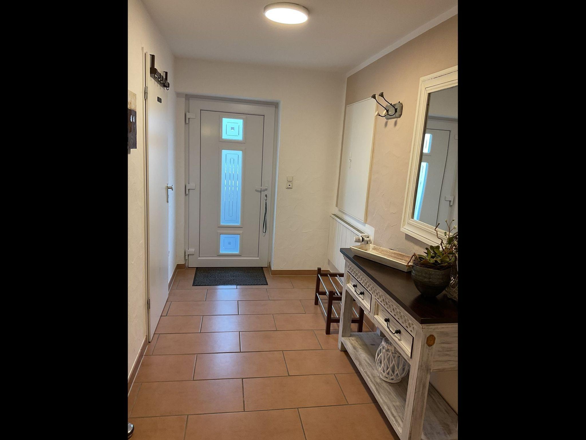 Die Ferienwohnung hat einen separaten Hauseingang. Durch den geräumigen Hausflur gelangen Sie in den Wohnbereich mit Küchenzeile, Esstisch und Couch. Durch die bodentiefen Fenstertüren gelangen Sie auf die große Sonnenterrasse. Auch vom Schlafzimmer aus haben Sie Zugang zur Terrasse. Das Bad ist mit einer ebenerdigen Dusche und WC ausgestattet. Ein Haartrockner ist vorhanden.