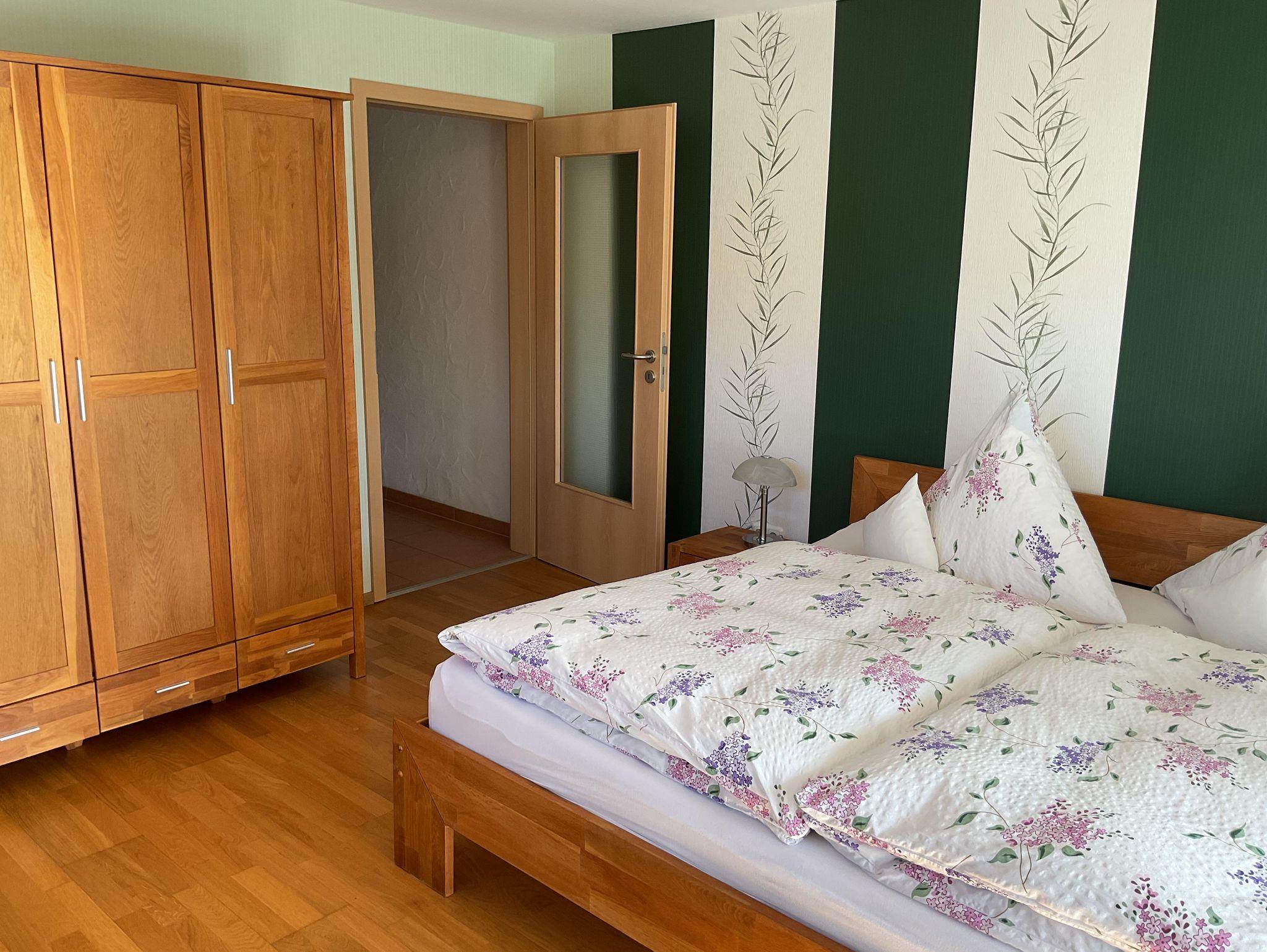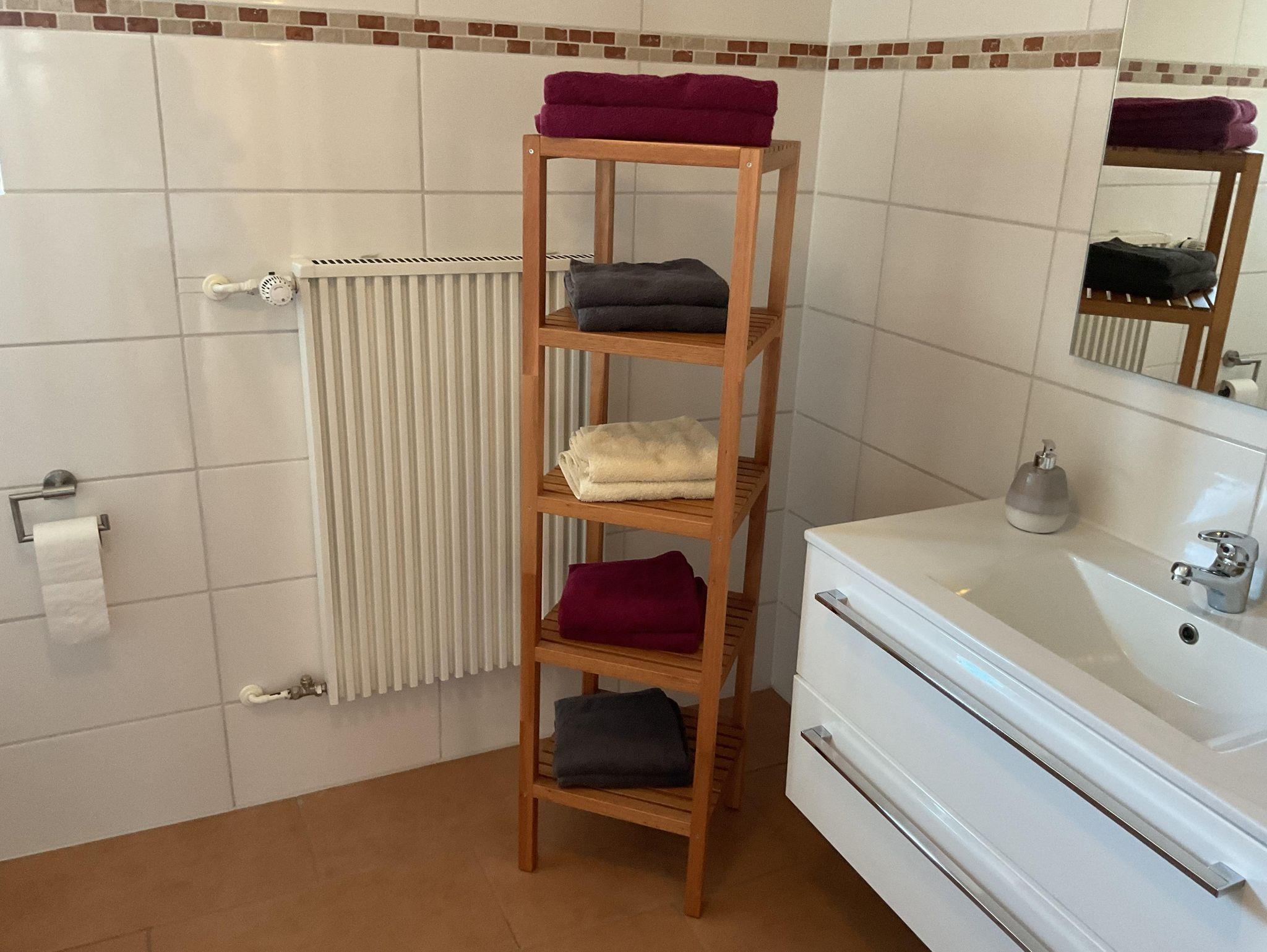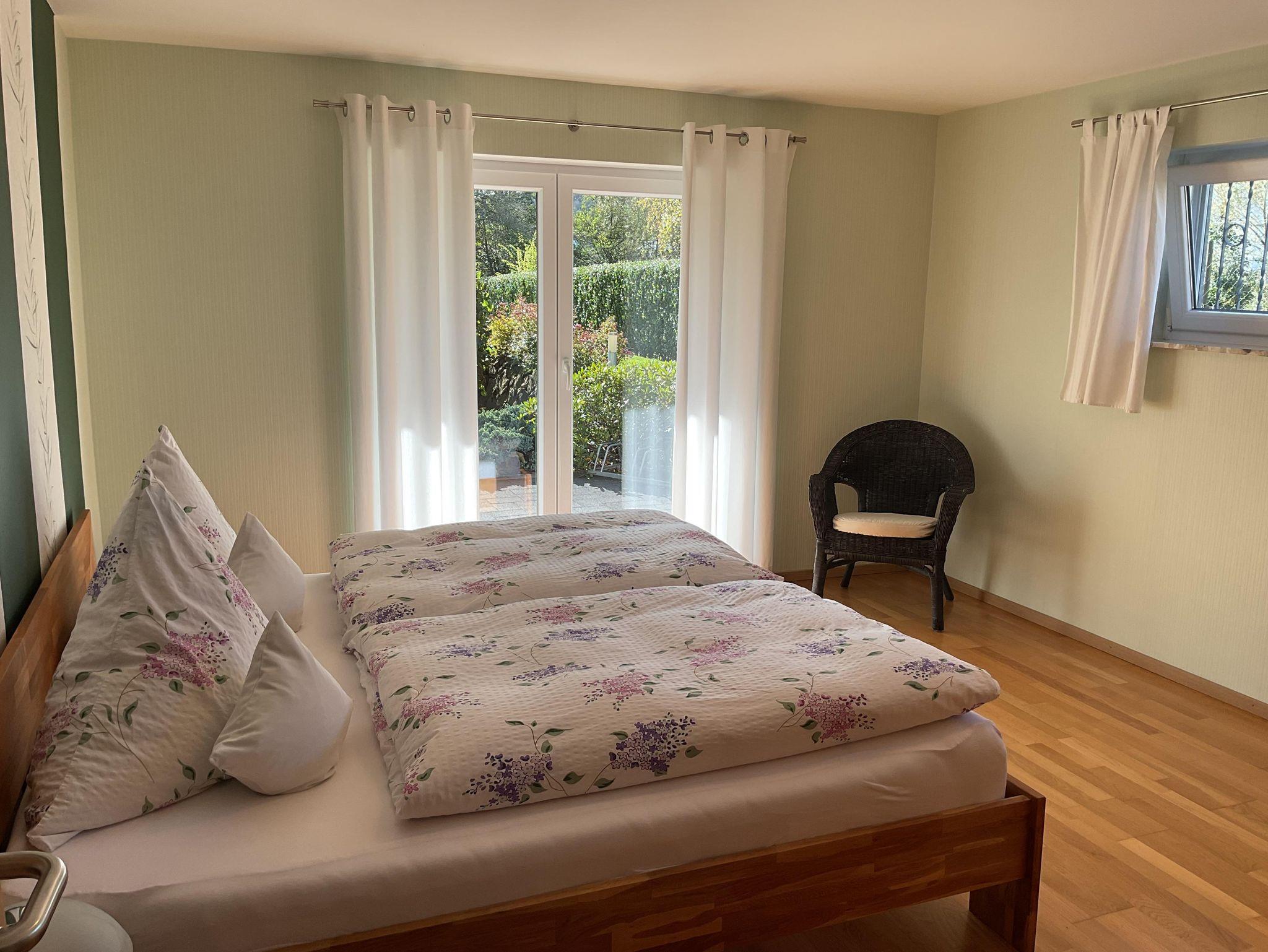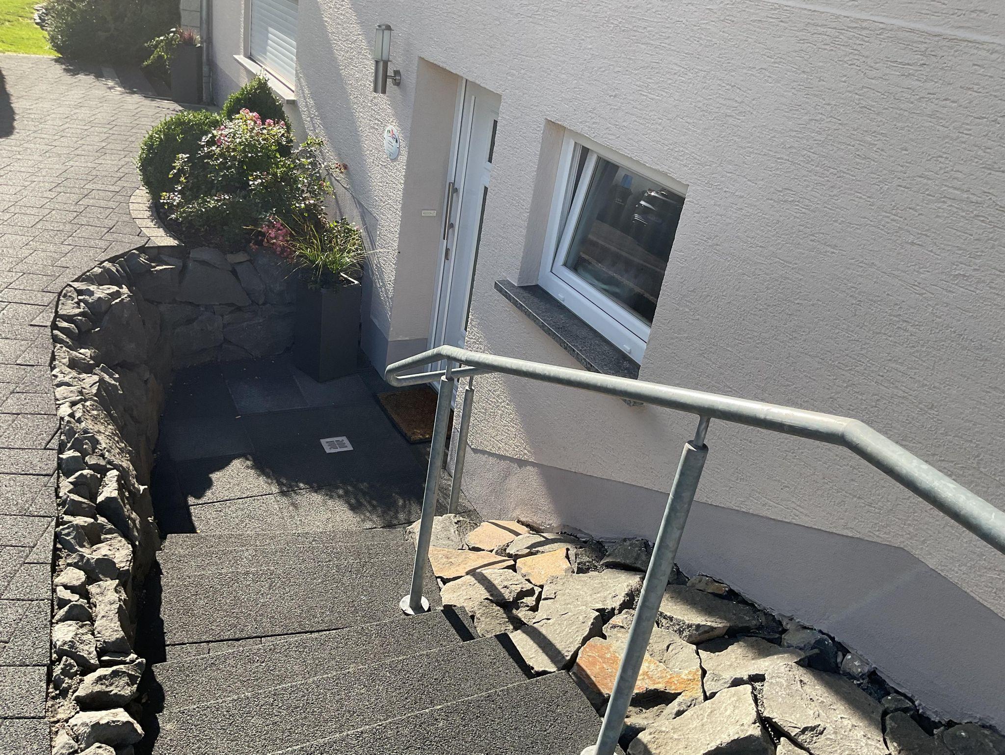 Die Ferienwohnung hat einen separaten Hauseingang. Durch den geräumigen Hausflur gelangen Sie in den Wohnbereich mit Küchenzeile, Esstisch und Couch. Durch die bodentiefen Fenstertüren gelangen Sie auf die große Sonnenterrasse. Auch vom Schlafzimmer aus haben Sie Zugang zur Terrasse. Das Bad ist mit einer ebenerdigen Dusche und WC ausgestattet. Ein Haartrockner ist vorhanden.