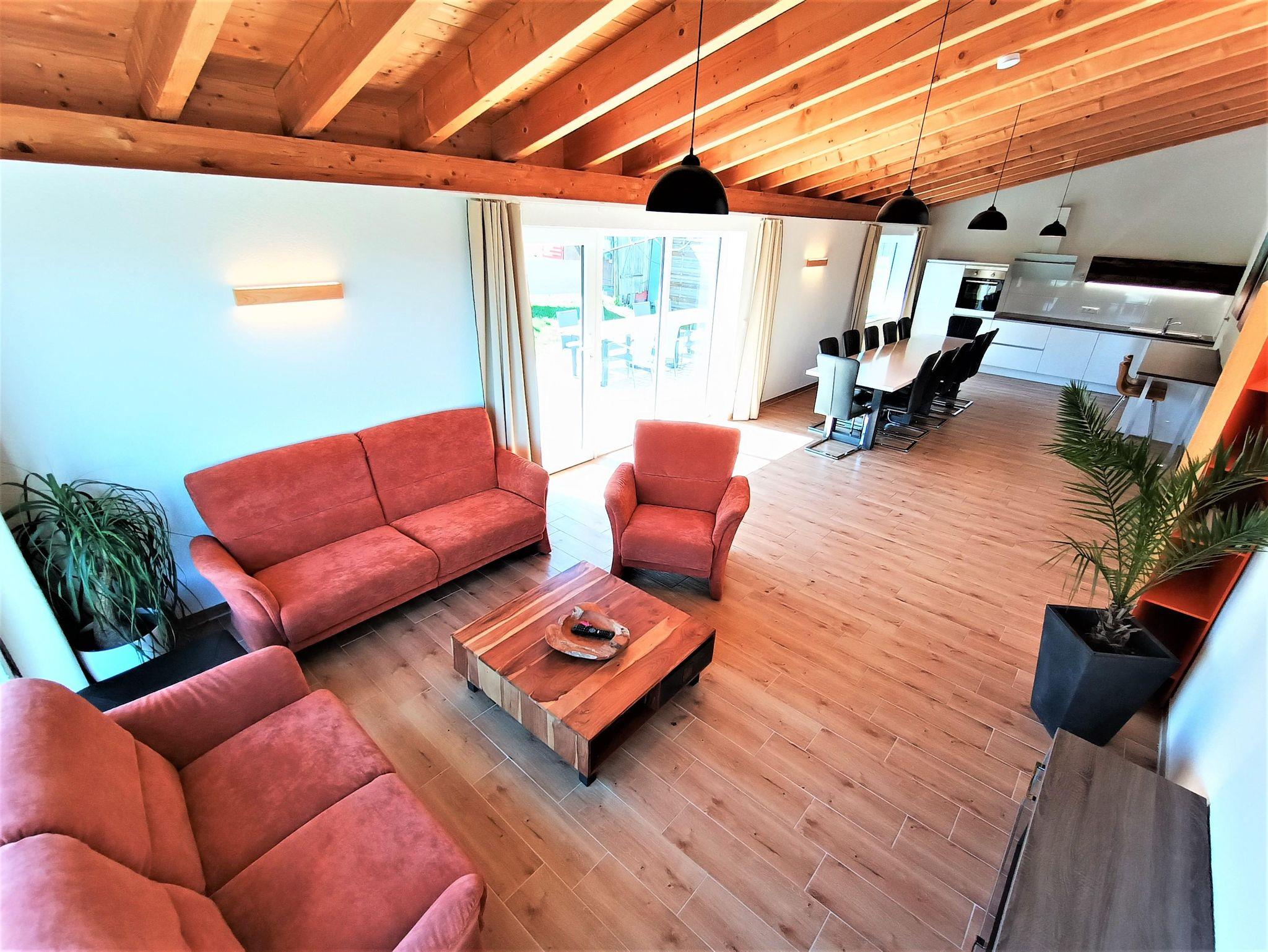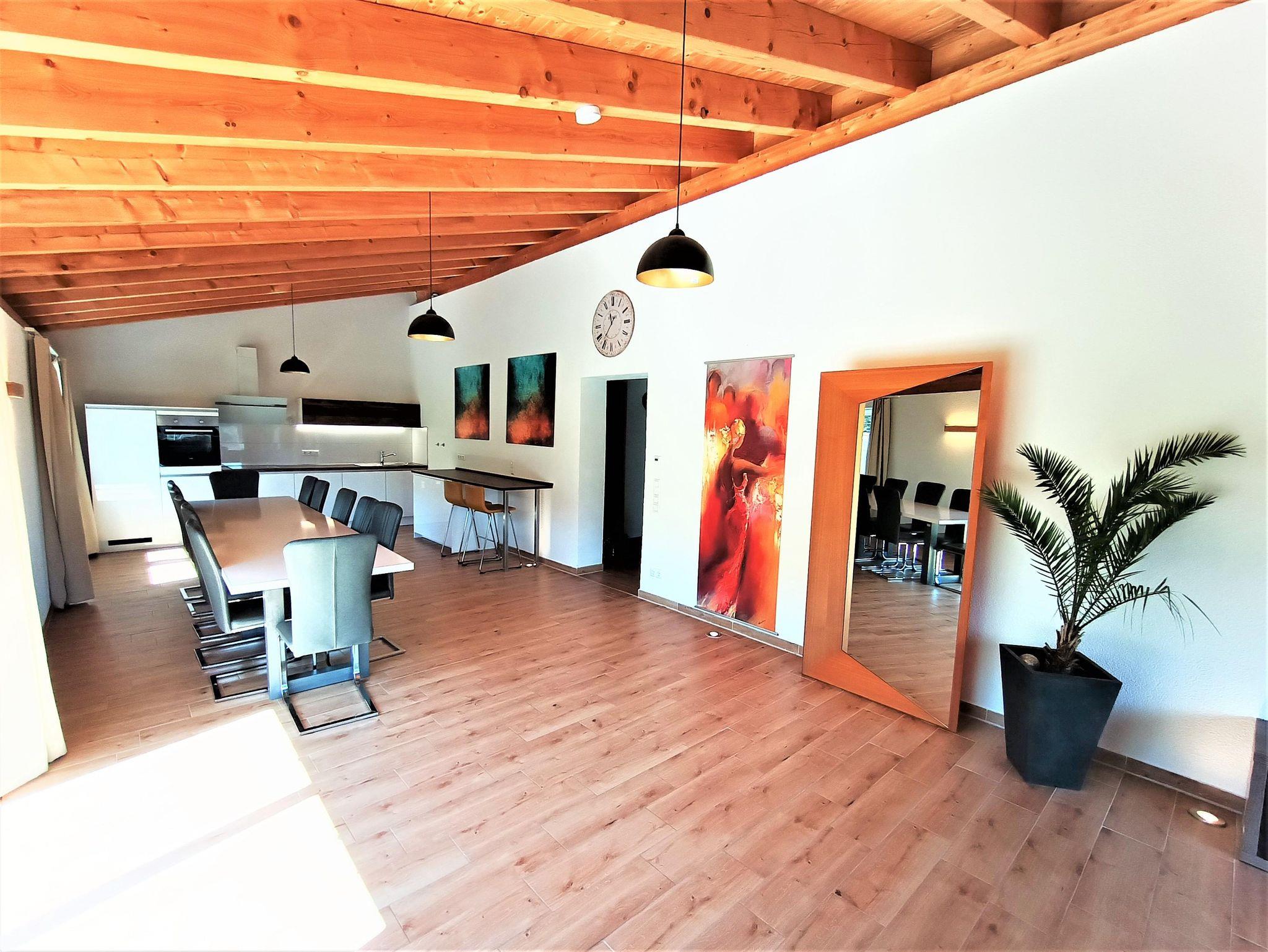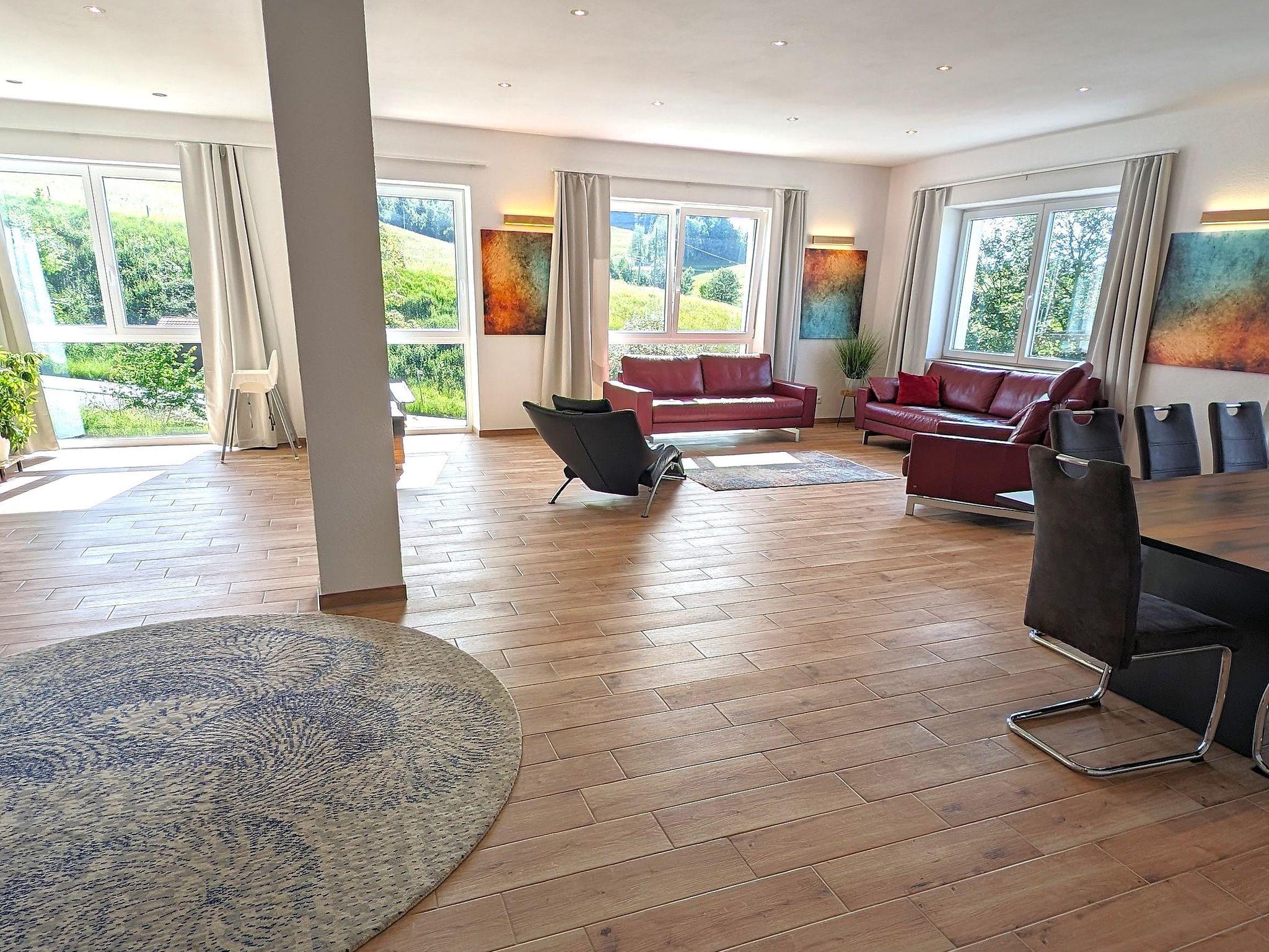 Riesiger Wohn/Essbereich für´s Beisammensein der Großfamilien, fünf separate Schlafzimmer (für 13 Erwachsene + 3 Babybetten), Infrarotsauna für 4 Personen, 2 Bäder, 2 separate WC-Räume, Fußbodenheizung, 55 Zoll Smart TV, eine Kinderspielecke, große Südterrasse zur Alleinnutzung, eigene Auffahrt, separater Eingang, eigener Hang, separater Stellplatz uvm. lassen keine Wünsche offen.