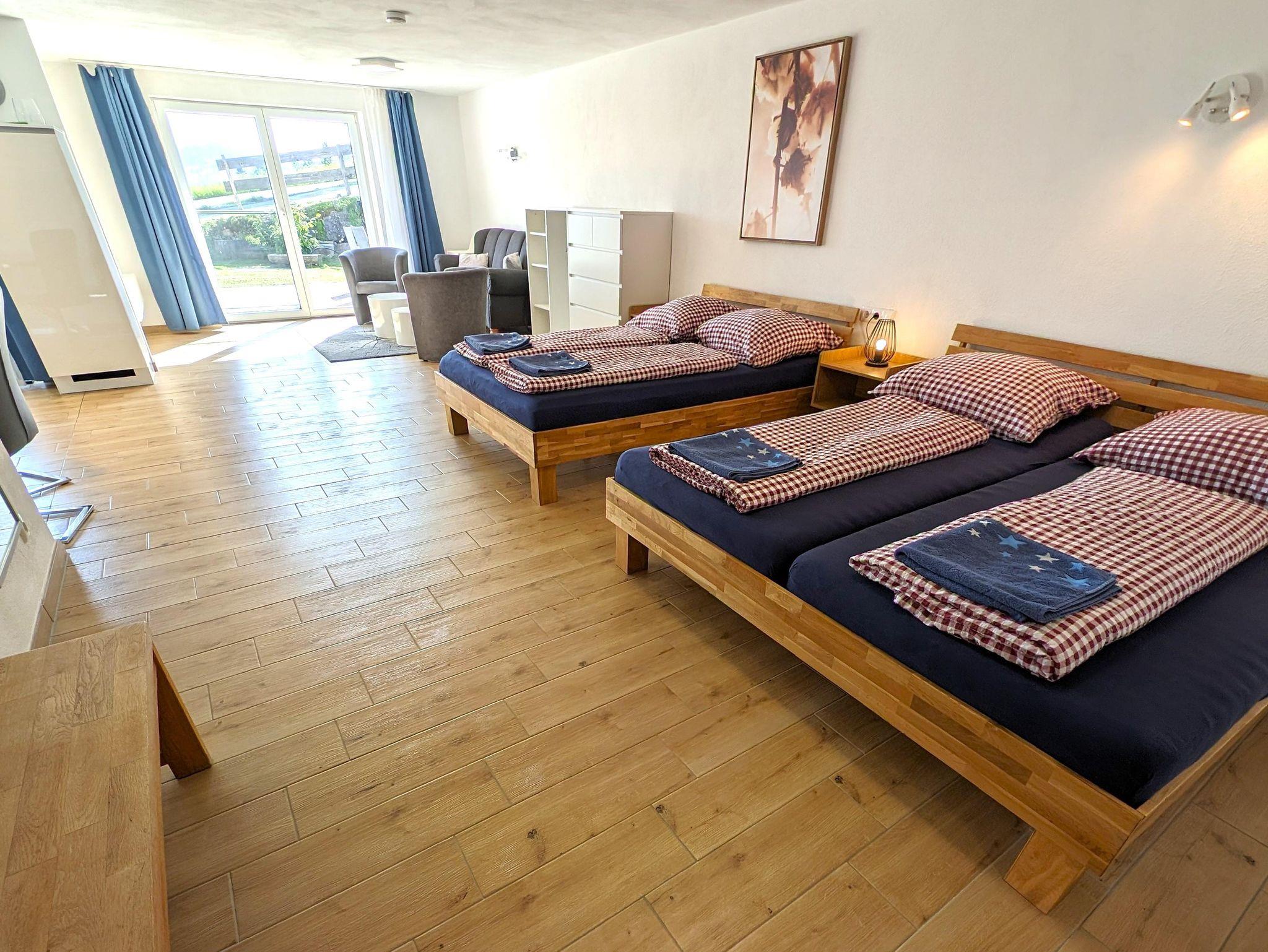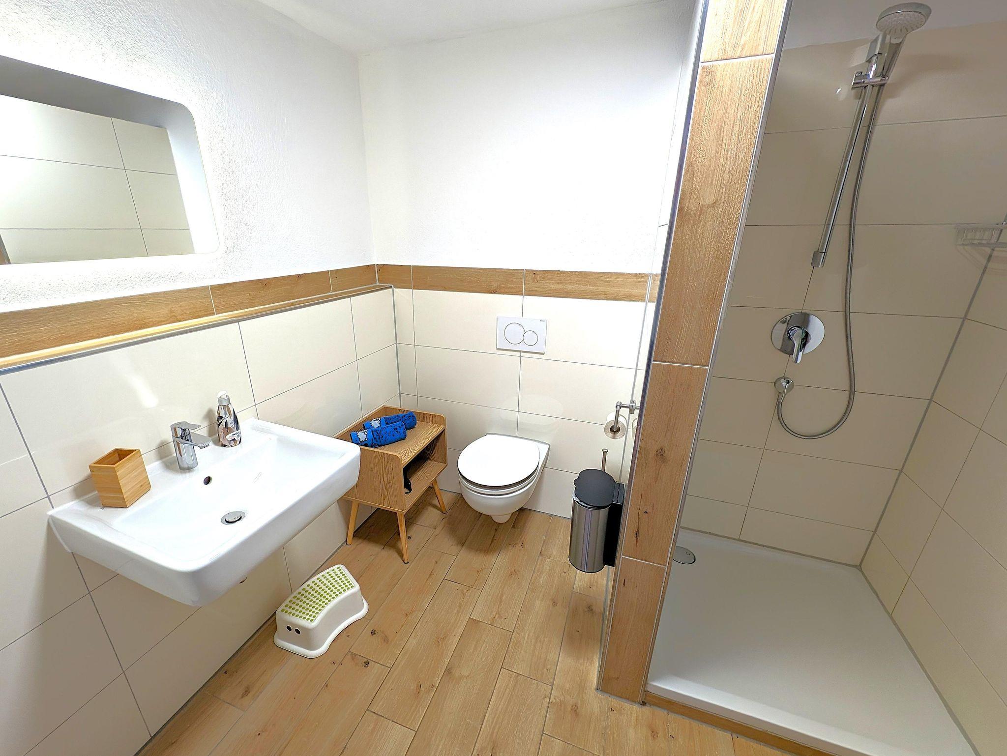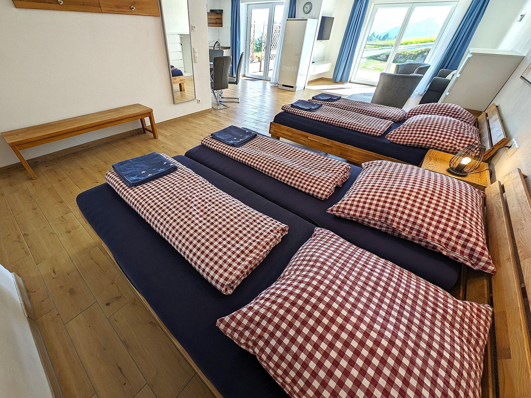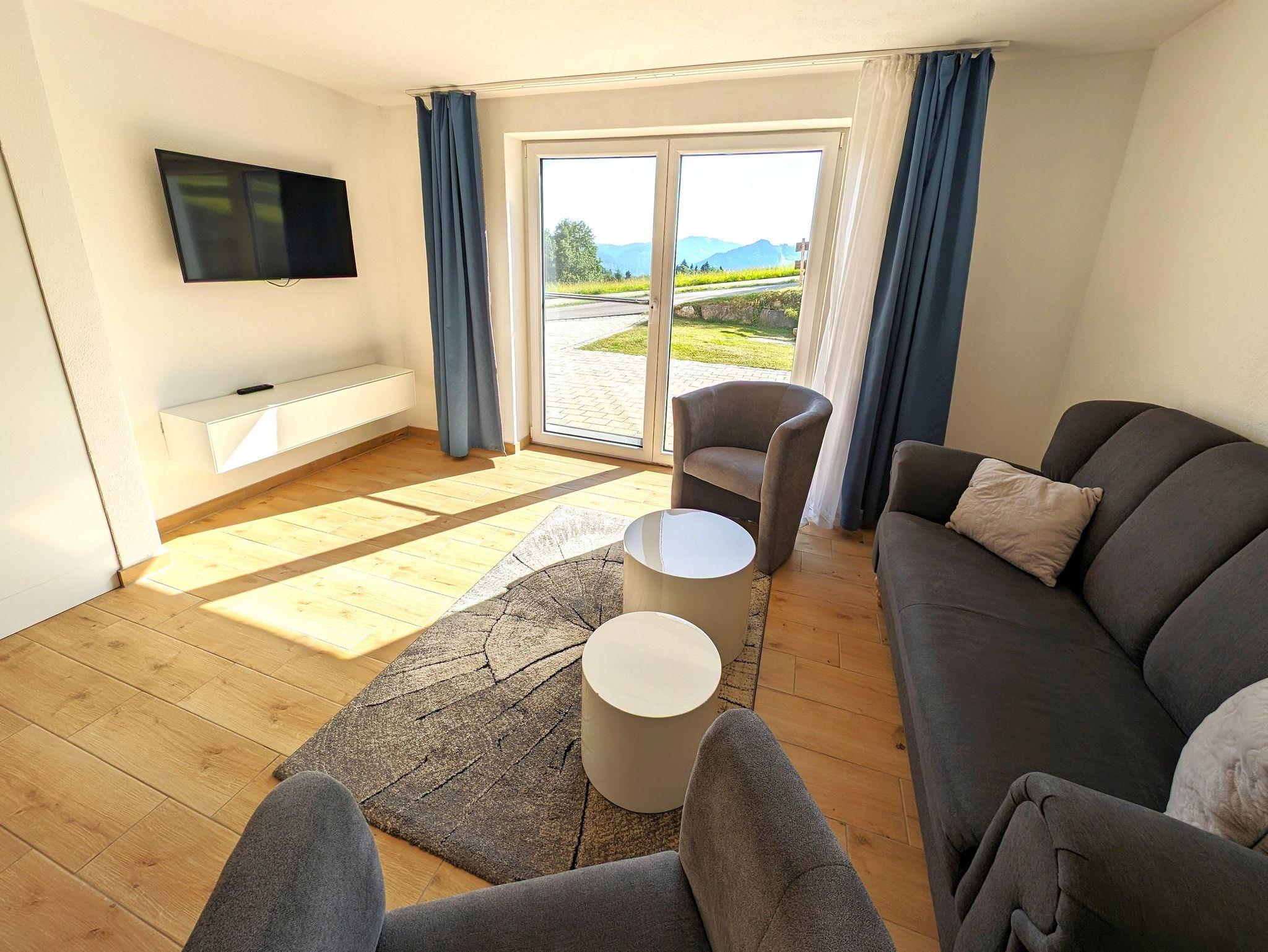 Die EG Wohnung (ca. 60 qm) hat einen separatem Eingang und eine Terrasse mit herrlichem Blick ins Tal auf die Nagelfluhkette und Oberstaufen. Die Wohnung bietet Platz für bis zu 4 Personen - ein Doppelbett 180cm, ein Bett 140 cm und eine Couch und ist offen (loftmäßig) gestaltet - lediglich das Bad ist abgetrennt.