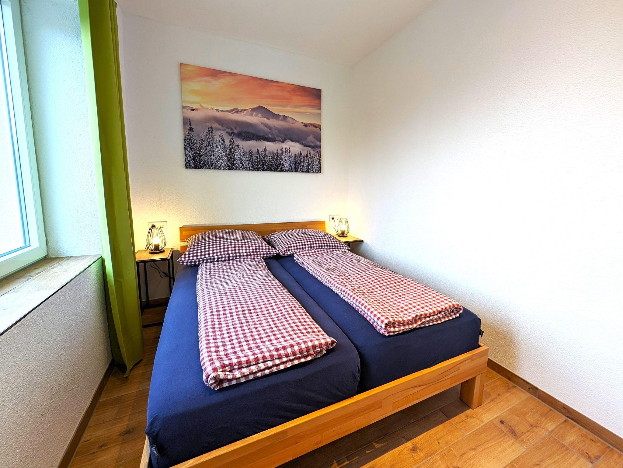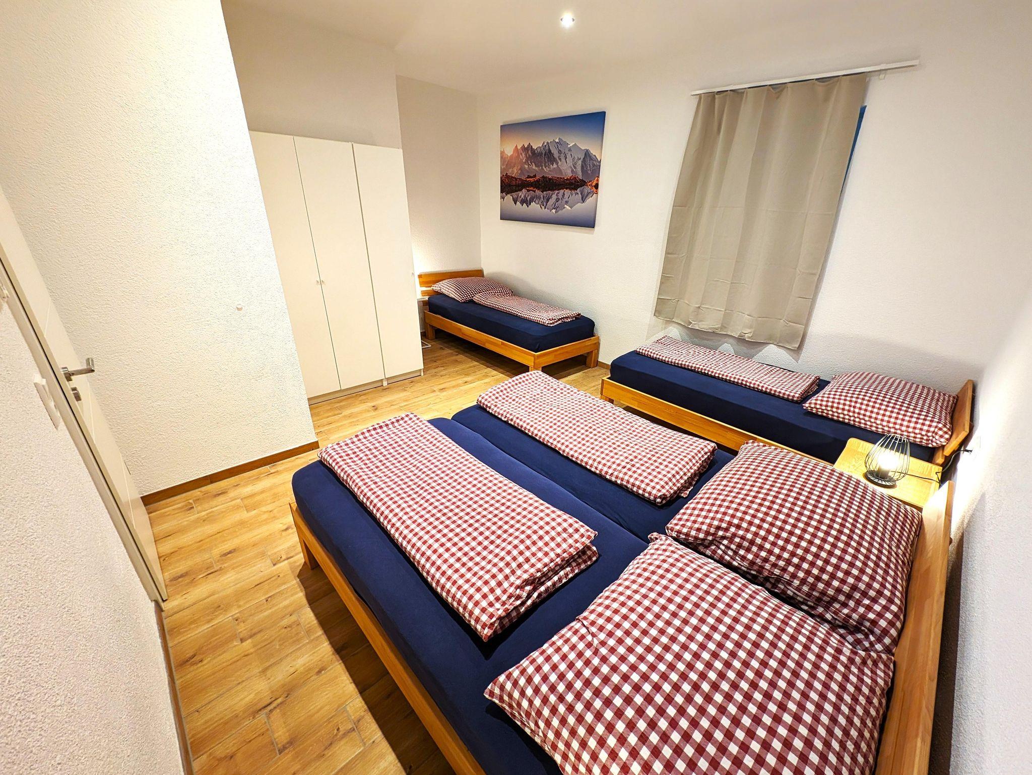 SZ1 (Doppelbett und zwei Einzelbetten), SZ2 (Doppelbett), im Wohnbereich zwei weitere Einzelbetten (90×200 als Wand/Schrankbett ausklappbar)