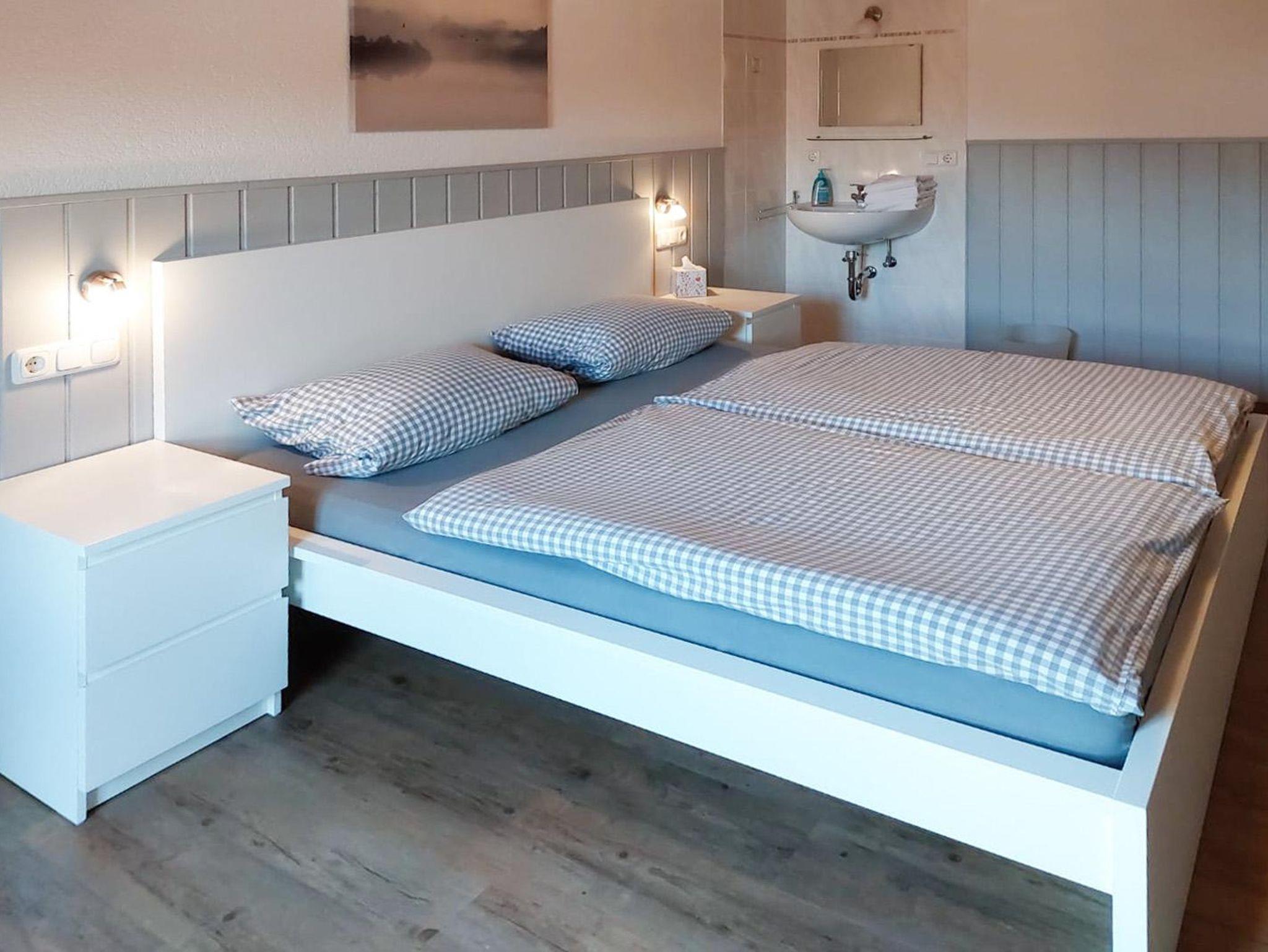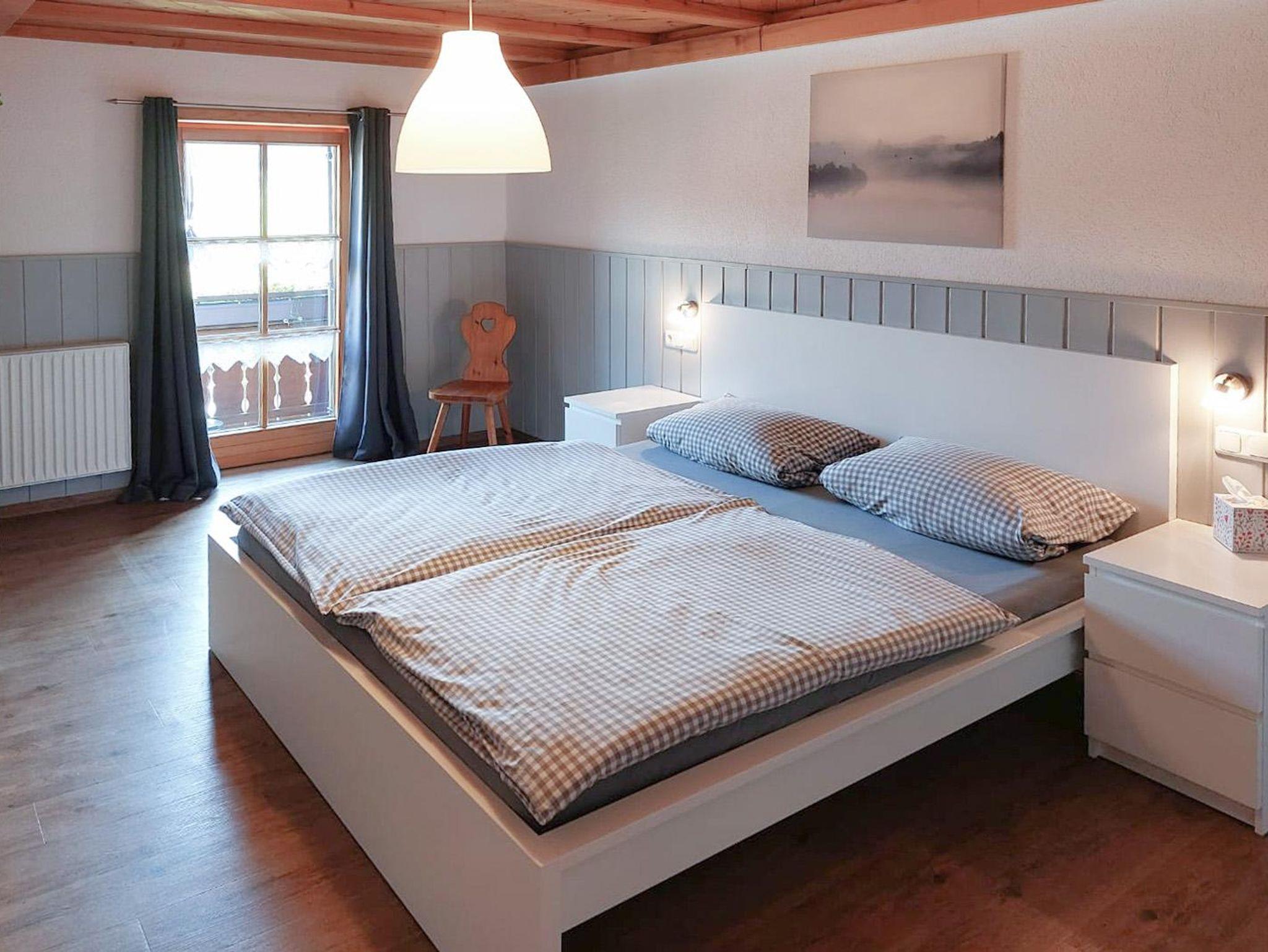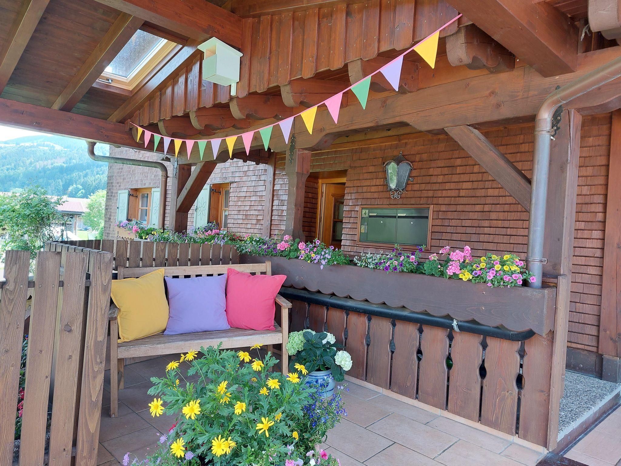 Unsere helle 4 Zimmer Wohnung Bergblick liegt in der zweiten Etage. Von dem wunderschönen, im Sommer mit Blumen geschmückten, möblierten Balkon mit Sonnenschirm aus, haben Sie einen einzigartigen Blick auf die umliegenden Wiesen, Wälder und Berge, sowie den hauseigenen Gartenbereich. Die weiße Landhausküchenzeile lädt mit Ihrer Ausstattung und dem Essbereich zum Kochen und Verweilen ein. Gemütliche Stunden erleben Sie in dem geschmackvoll eingerichteten Wohnbereich mit Laminat, Korbliege, Sofa und Flachbildfernseher. Das Sofa verfügt über eine Schlaffunktion. Im Elternschlafzimmer befindet sich ein eigenes Waschbecken, sowie einen Balkonzugang. Dieser kann bei Bedarf verdunkelt werden. Das separate Kinderschlafzimmer verfügt über ein 1,60 m großes Bett und ein Fenster. Es stehen allen Daunenkopfkissen und 4 Jahreszeitenbettdecken zur Verfügung. Das vollausgestattete Badezimmer mit ebenerdiger Dusche lässt ebenso keine Wünsche offen.