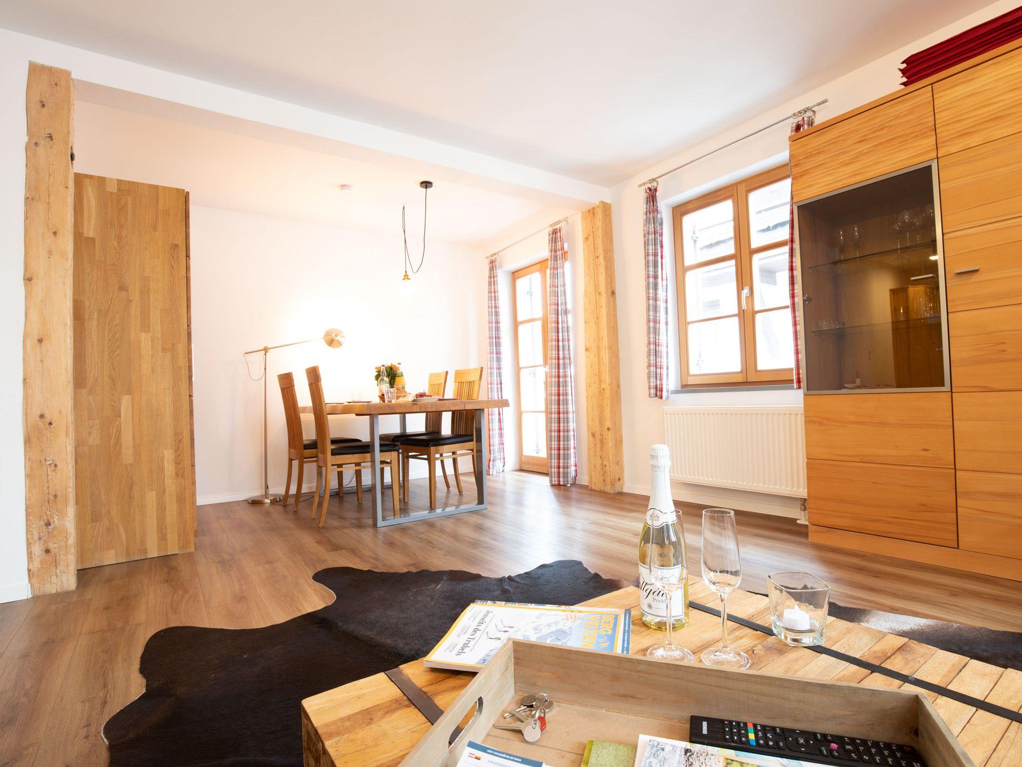 3 Zimmer, Küche, Bad Ferienwohnung mit 62 m² für 1 bis 4 Personen, großes Wohnzimmer, zwei Schlafzimmer mit Doppelbetten, separate Küche, 1. Obergeschoß, Westbalkon, Kinderzustellbett und Hochstuhl auf anfrage möglich