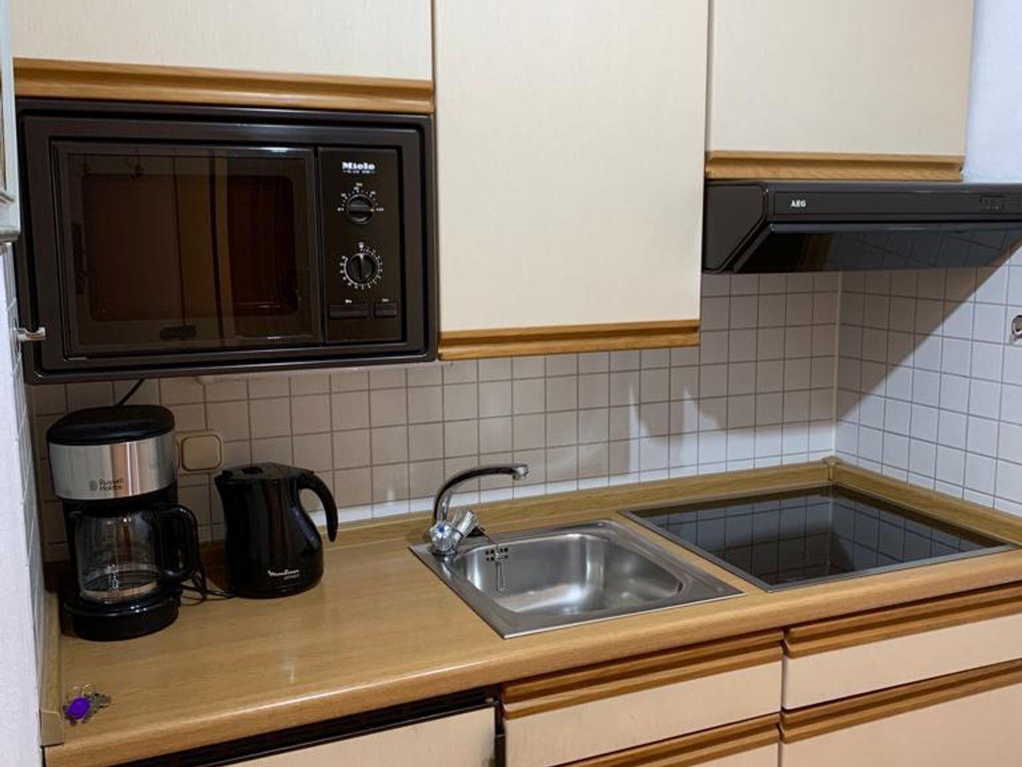 Es ist ausgestattet mit einer Küchenzeile (Spüle, Kühlschrank mit Gefrierfach, 4-Platten Herd Glaskeramik und Mikrowelle), so dass Sie sich bei Bedarf selbst verpflegen können.