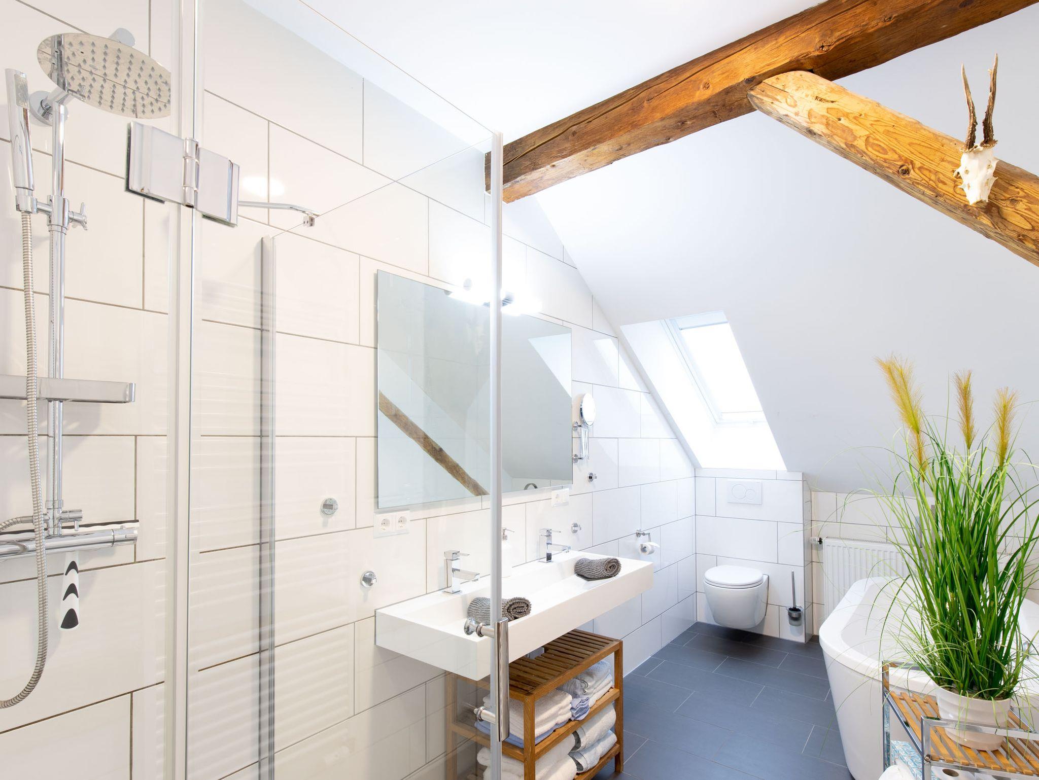 3 Zimmer Ferienwohnung mit 64 m² für 1 bis 4 Personen, 3 Räume mit 2 Schlafzimmern, Wohnzimmer, Küchenzeile in der geräumigen Diele, 2. Obergeschoß/Dachgeschoß, Südbalkon, Bergblick, Kinderzustellbett/-hochstuhl auf Anfrage möglich