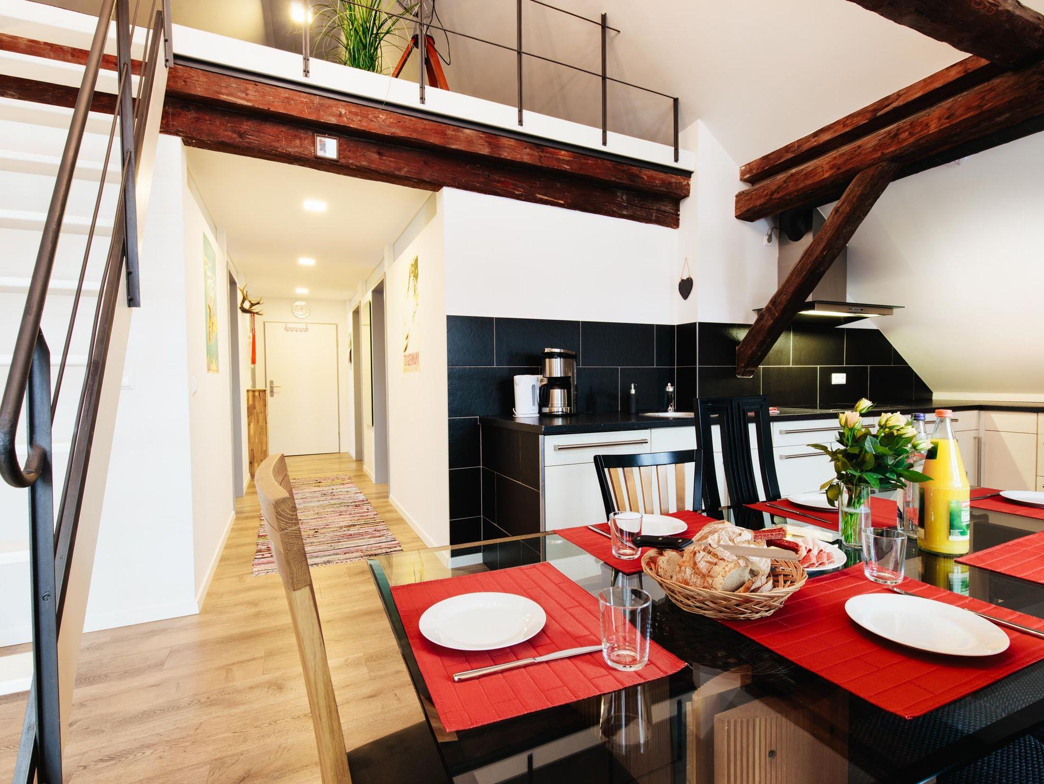 4 Zimmer Ferienwohnung mit 102 m² für 1 bis 6 Personen, 4 Räume mit 3 Schlafzimmern, Wohnzimmer mit offener Küche, Galerie, 2. Obergeschoß/Dachgeschoß, Balkon, Bergblick, Kinderzustellbett/-hochstuhl auf Anfrage möglich