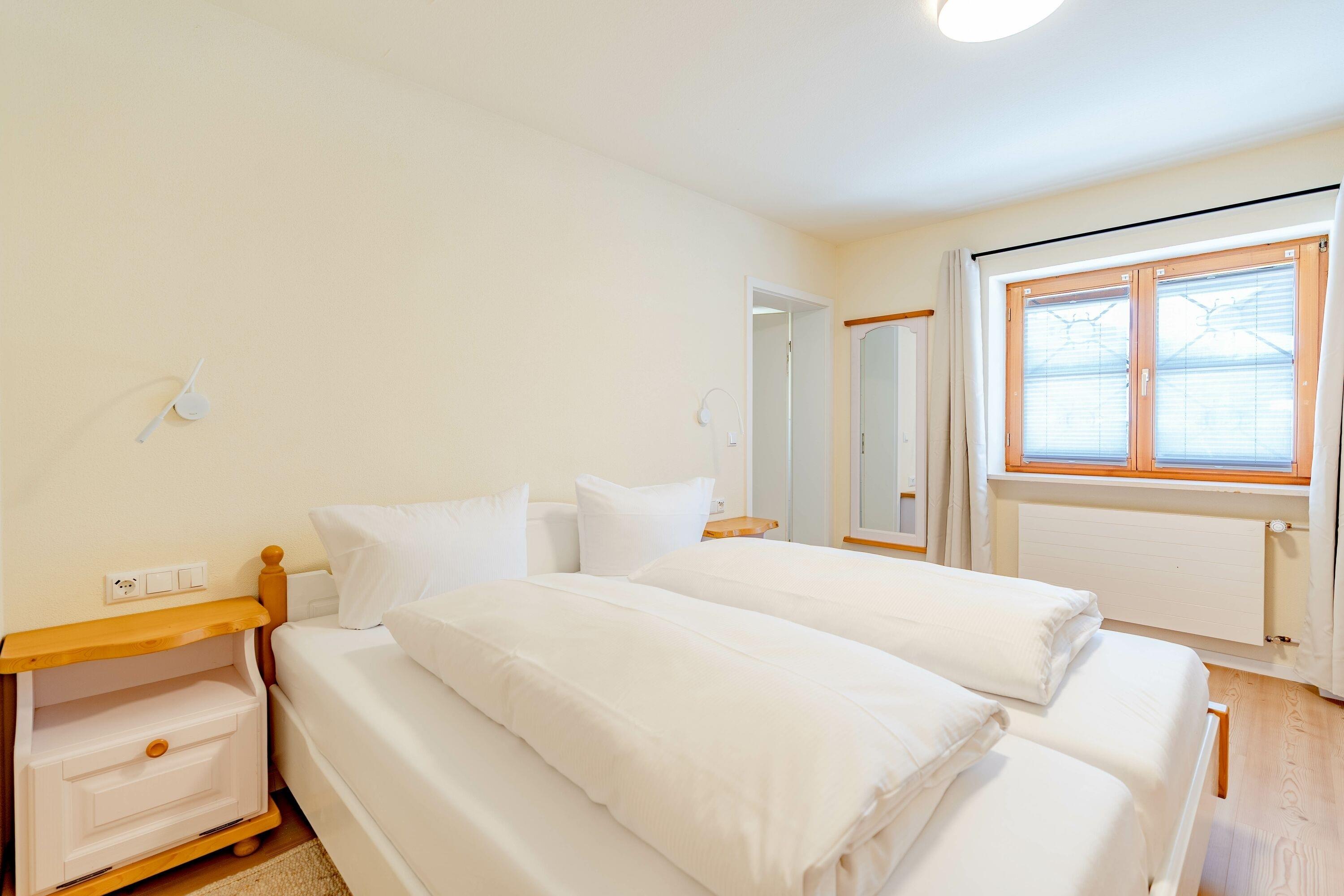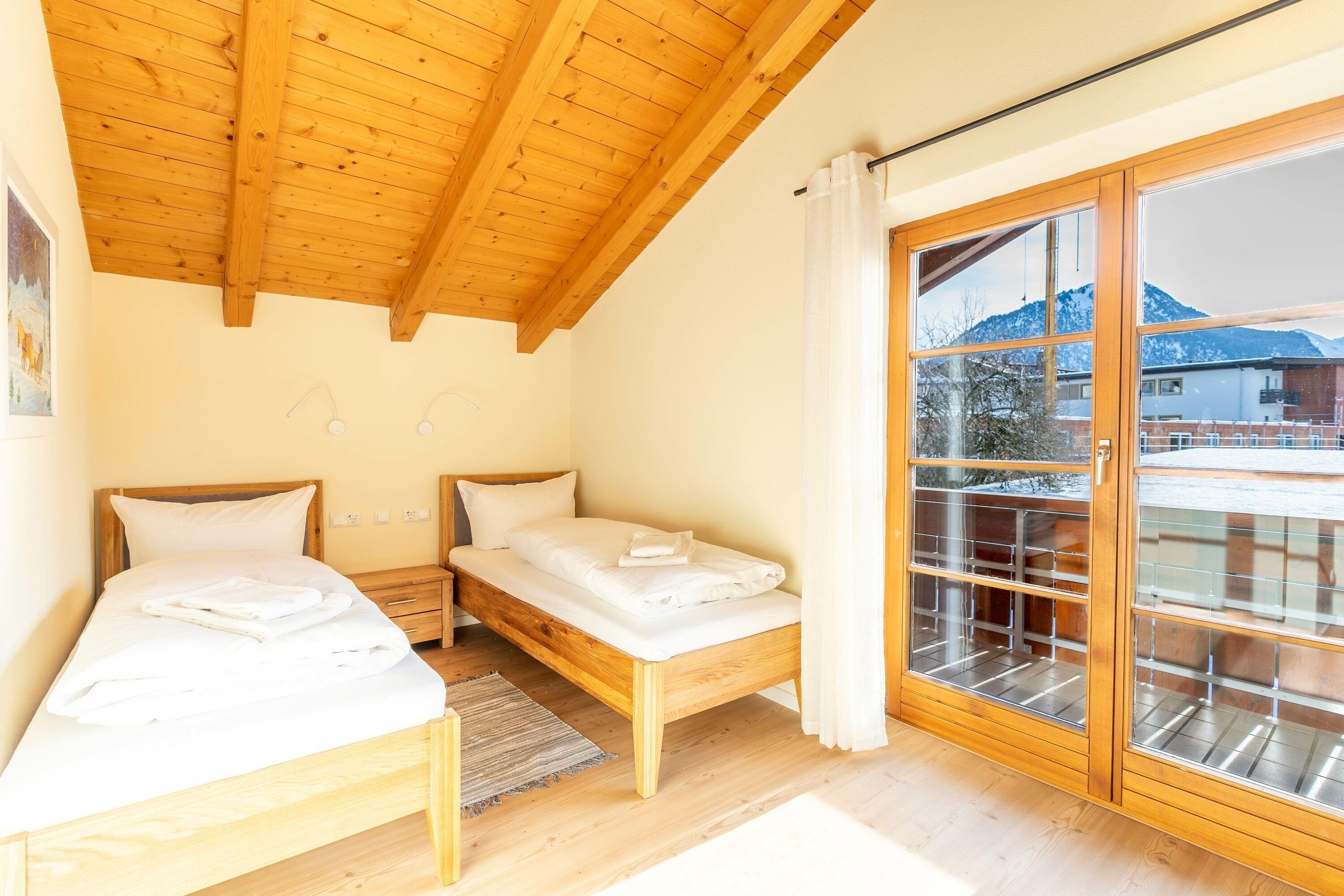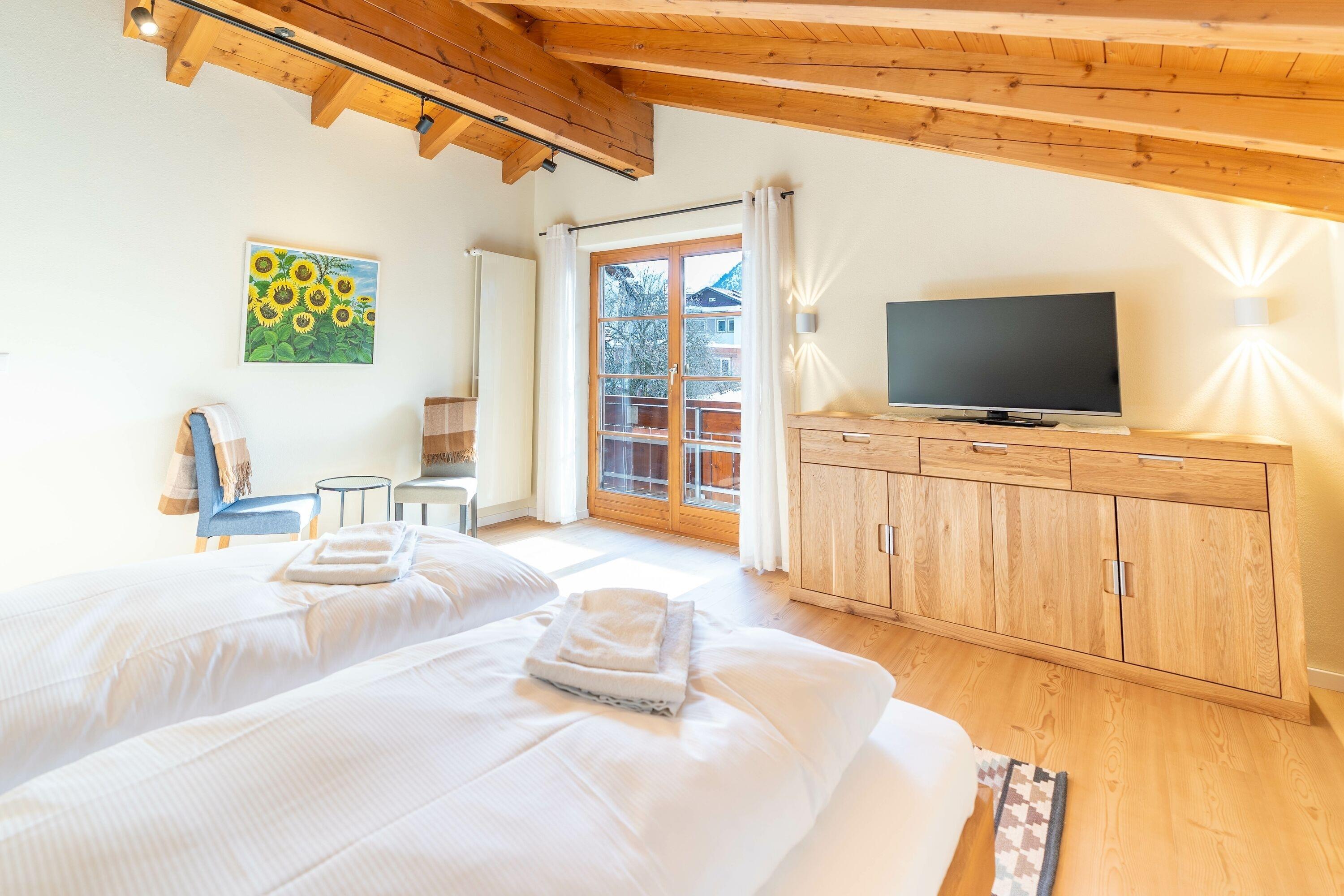 Über das Treppenhaus erreicht man das Obergeschoss. Im Flur befindet sich ein großer Kleiderschrank. Hier liegen zwei weitere Schlafzimmer die sich einen Südbalkon teilen. Eines der Zimmer ist mit einem Doppelbett, einer Kommode einem Fernseher sowie zwei Stühlen mit einem kleinen Tischchen ausgestattet. Das zweite Schlafzimmer verfügt über zwei Einzelbetten, einer Kommode mit Fernseher und ebenfalls zwei Stühlen. Das Badezimmer im Obergeschoss bietet eine Dusche, ein WC, einen großen Waschtisch, eine Handtuchheizung sowie ein kleines Regal für Ihre persönlichen Reiseutensilien.