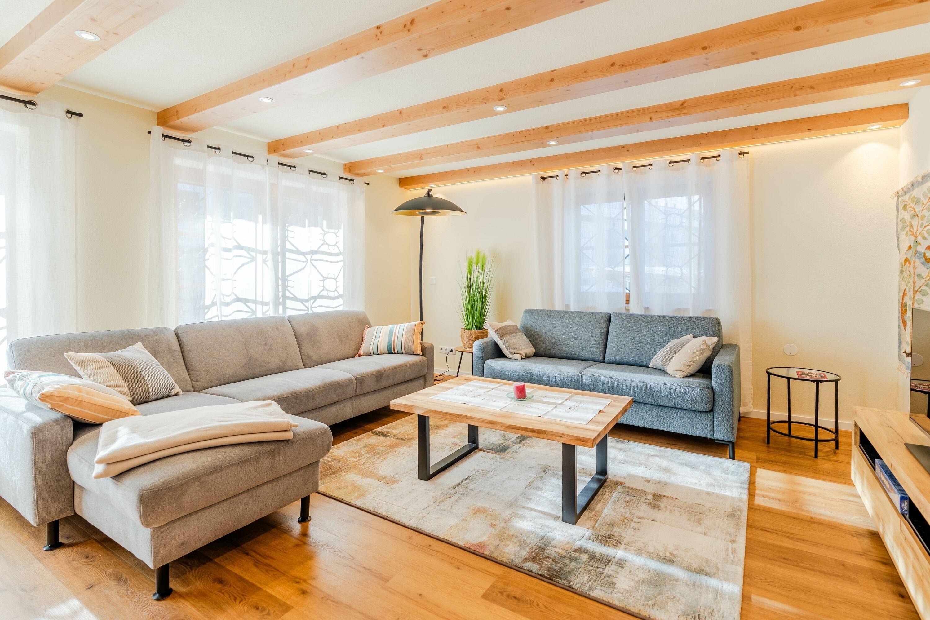 Der offene Ess- und Wohnbereich lädt zum Verweilen ein. Hier stehen zwei Sofas, eine gemütliche Leseecke, ein Fernseher sowie Spiele zur Verfügung. Vom Wohnbereich aus gelangt man direkt auf die Terrasse.