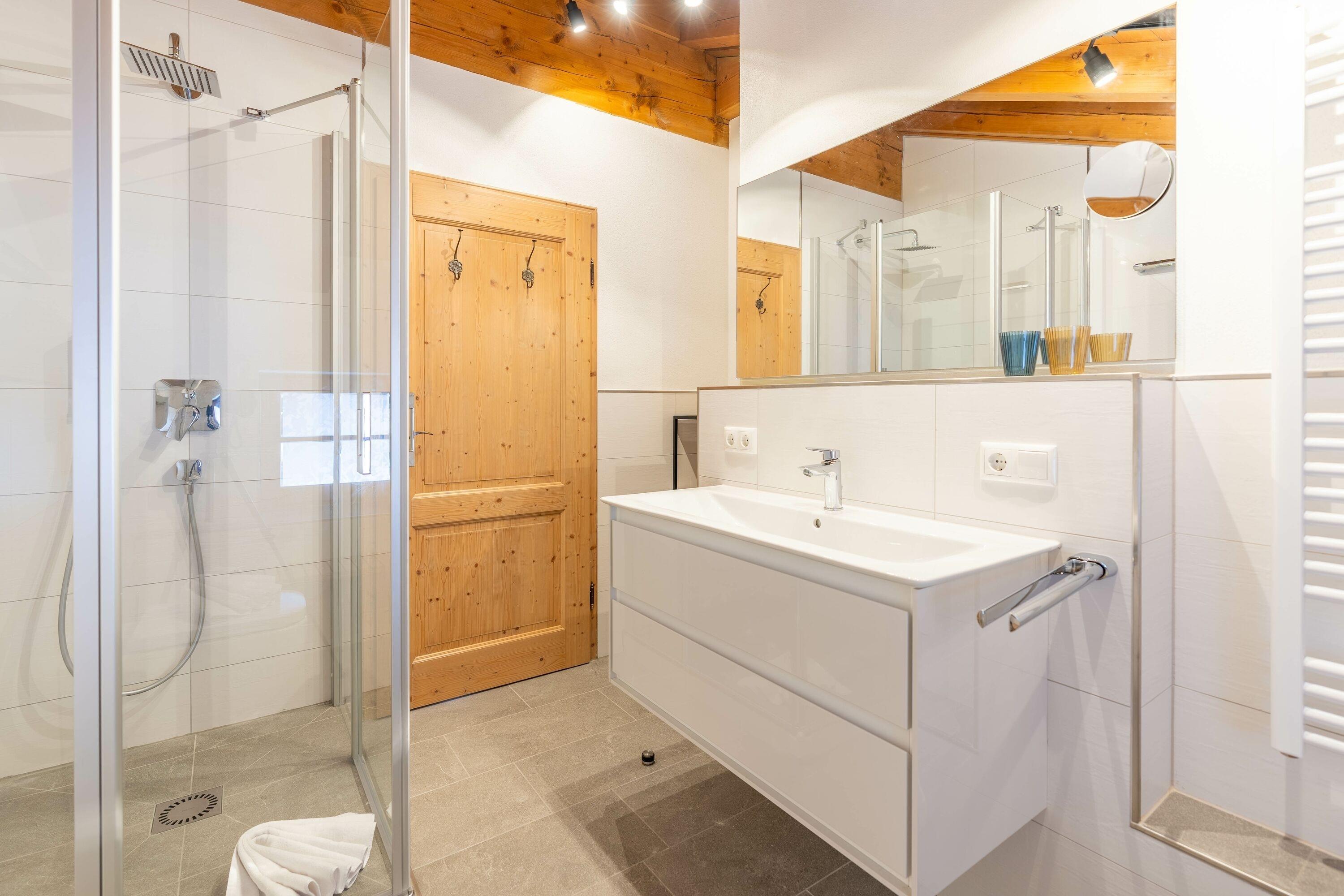 Im Erdgeschoss befindet sich der Eingangsbereich mit Garderobe und Jackenschrank. Direkt angrenzend liegt ein Gäste WC mit Waschbecken. Ebenfalls im Erdgeschoss befindet sich ein Schlafzimmer mit Doppelbett, Kleiderschrank, Kommode und TV-Gerät. Das Zimmer verfügt über ein eigenes Bad mit Dusche, WC und Waschbecken und ist - wie alle Schlafzimmer im Haus - mit Verdunkelungsvorhängen bzw. -Läden ausgestattet.