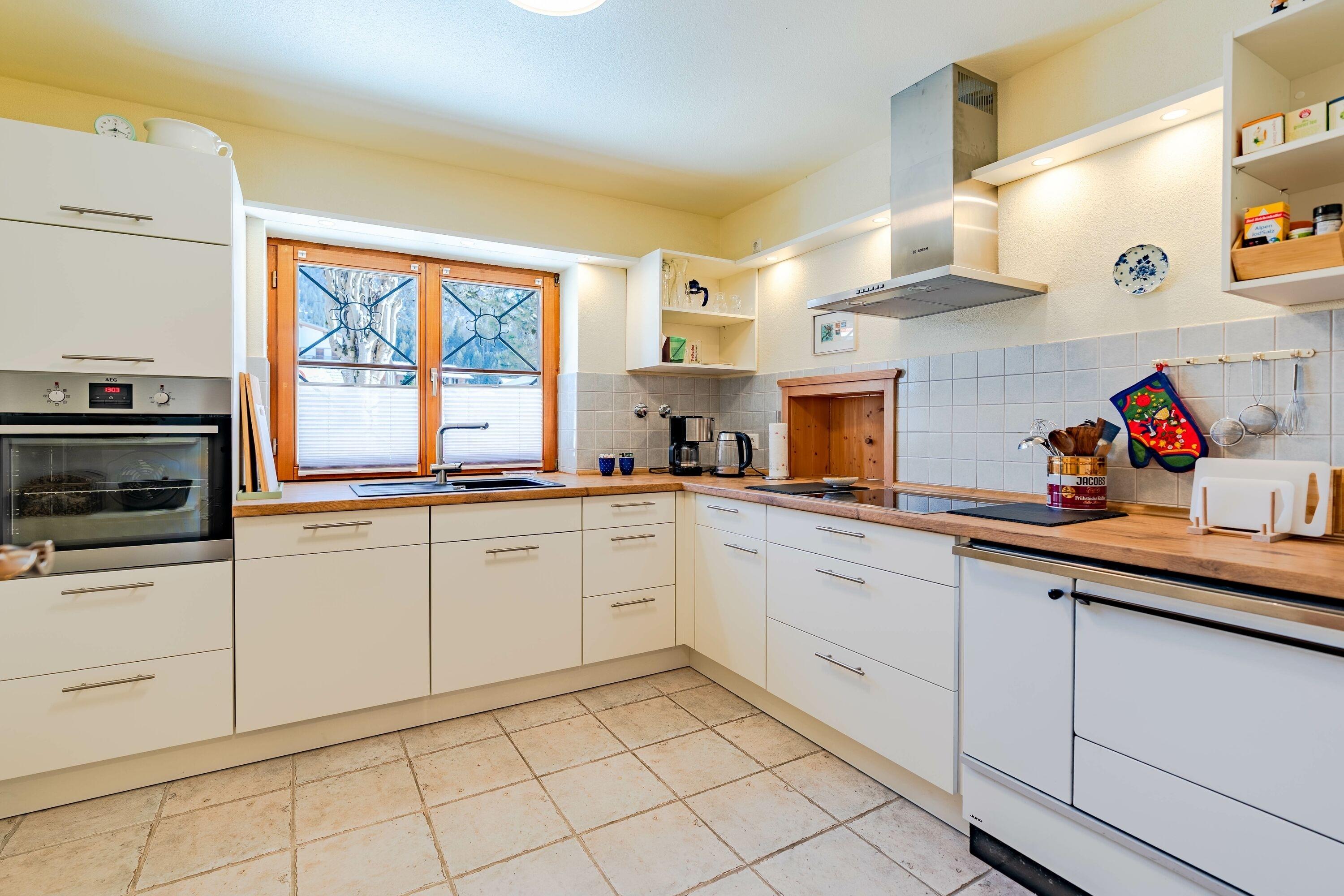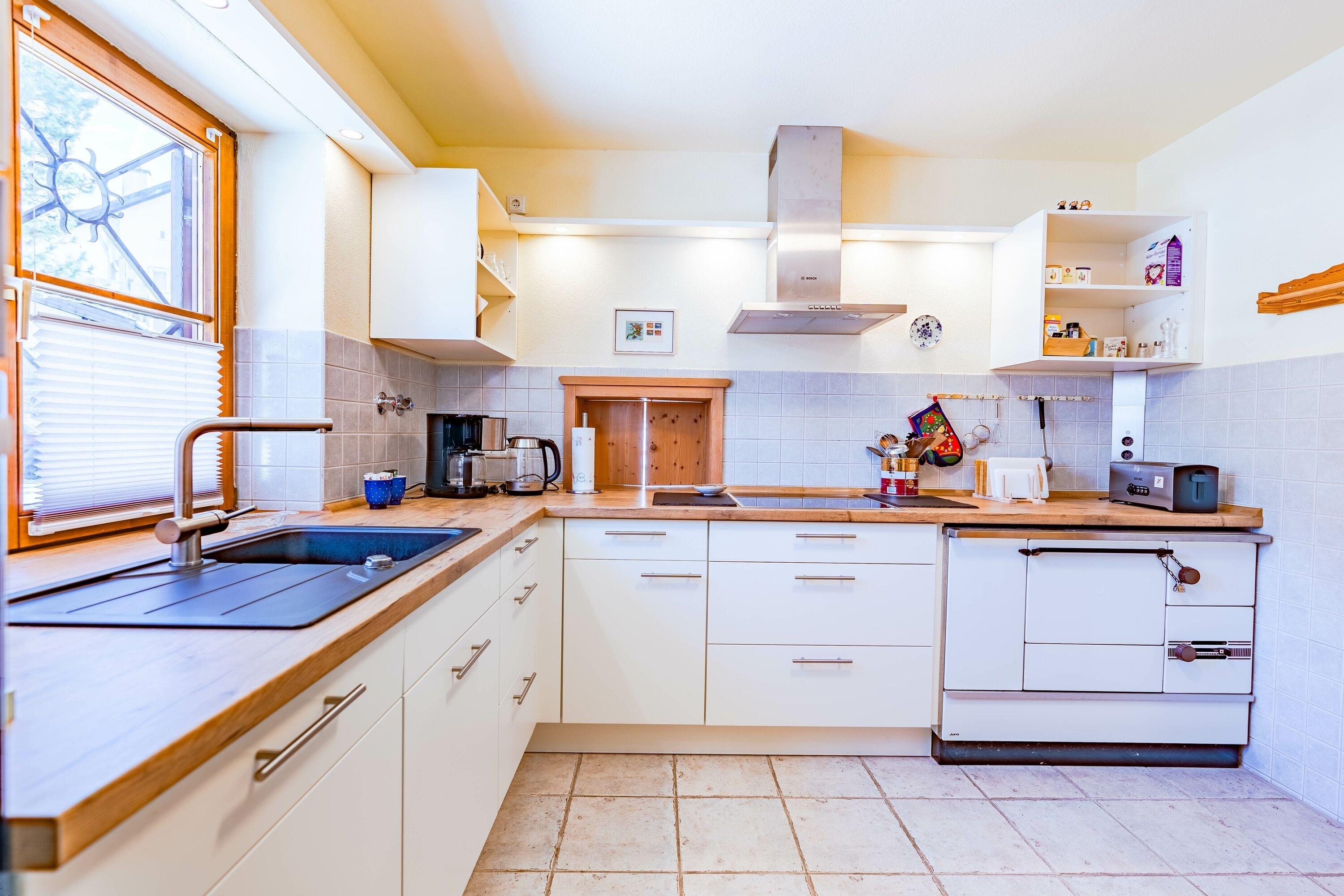 Die Küche ist großzügig gestaltet und bietet zusätzlich einen praktischen Abstellraum sowie eine Durchreiche. Sie ist vollständig ausgestattet mit einem Kühlschrank und separatem Gefrierschrank, einem Backofen auf Brusthöhe, einem 4-Platten Kochfeld, einem Geschirrspüler, Mikrowelle sowie einem Toaster, Wasserkocher und einer Filterkaffeemaschine.