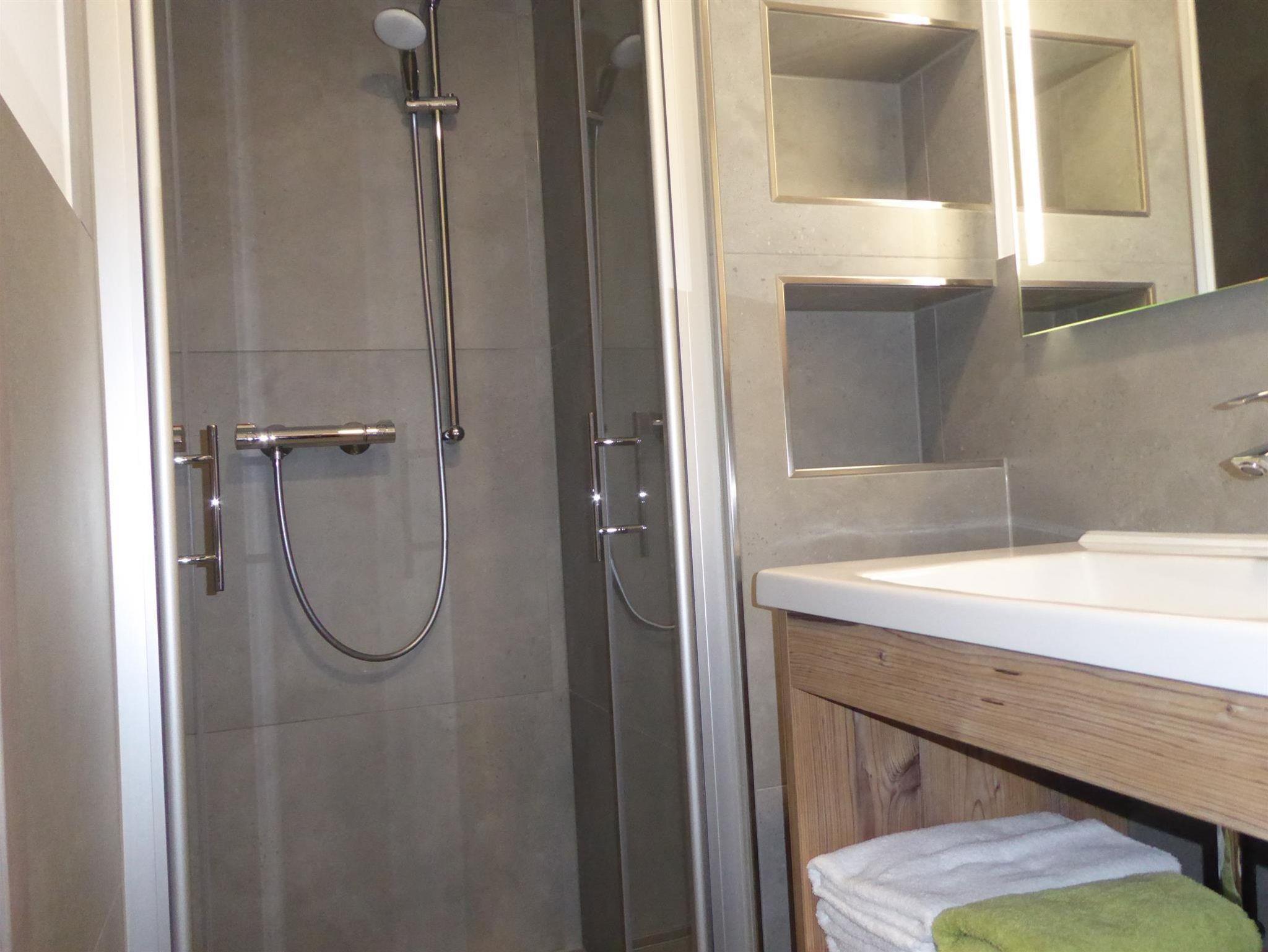 - Modernes Bad mit Walk-In-Dusche, WC, Haartrockner