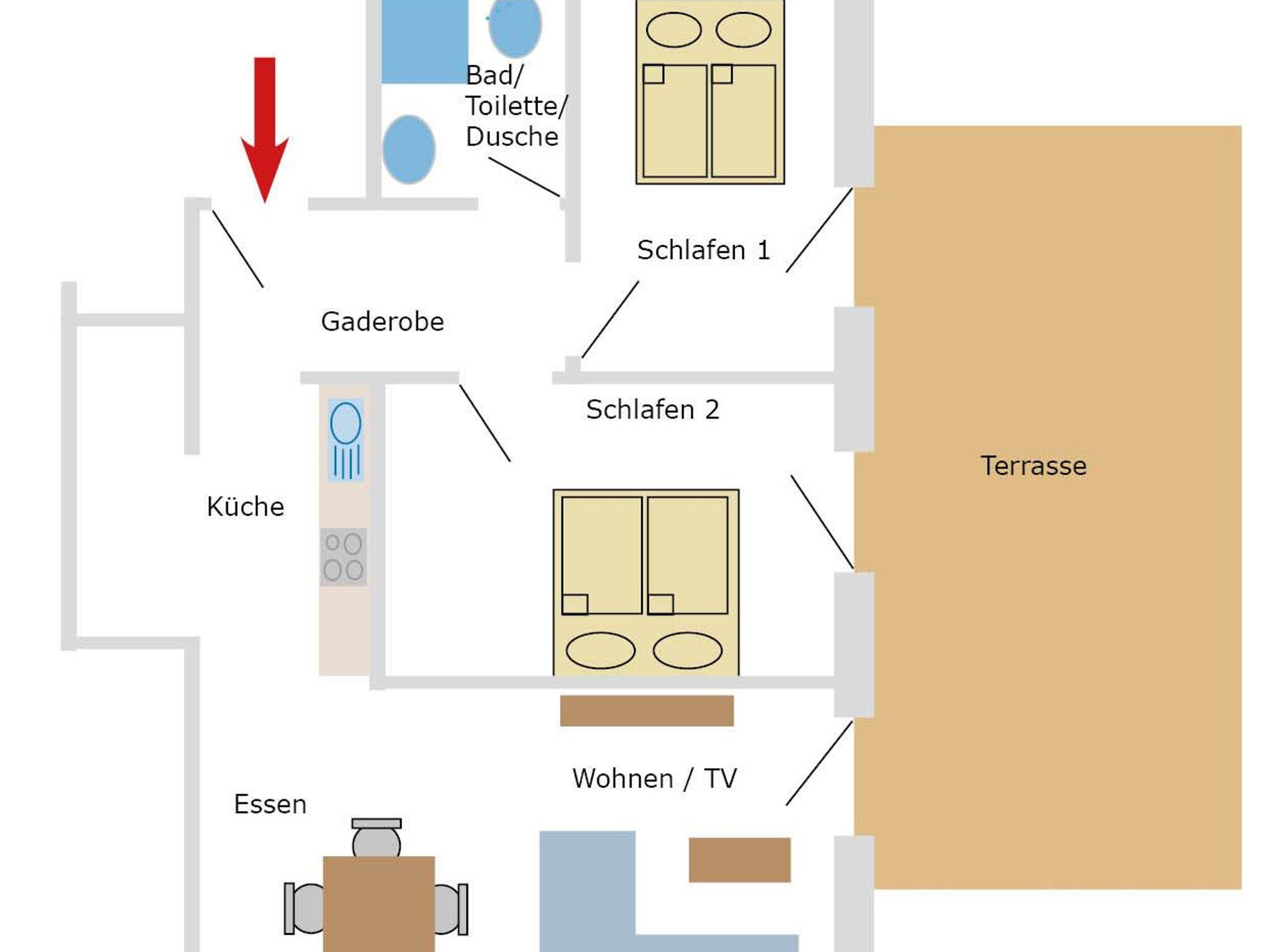 Die Ferienwohnung hat einen offenen Wohn- / Ess- / und Küchenbereich, 2 Schlafzimmer mit je einem Doppelbett und ein Bad mit Dusche.