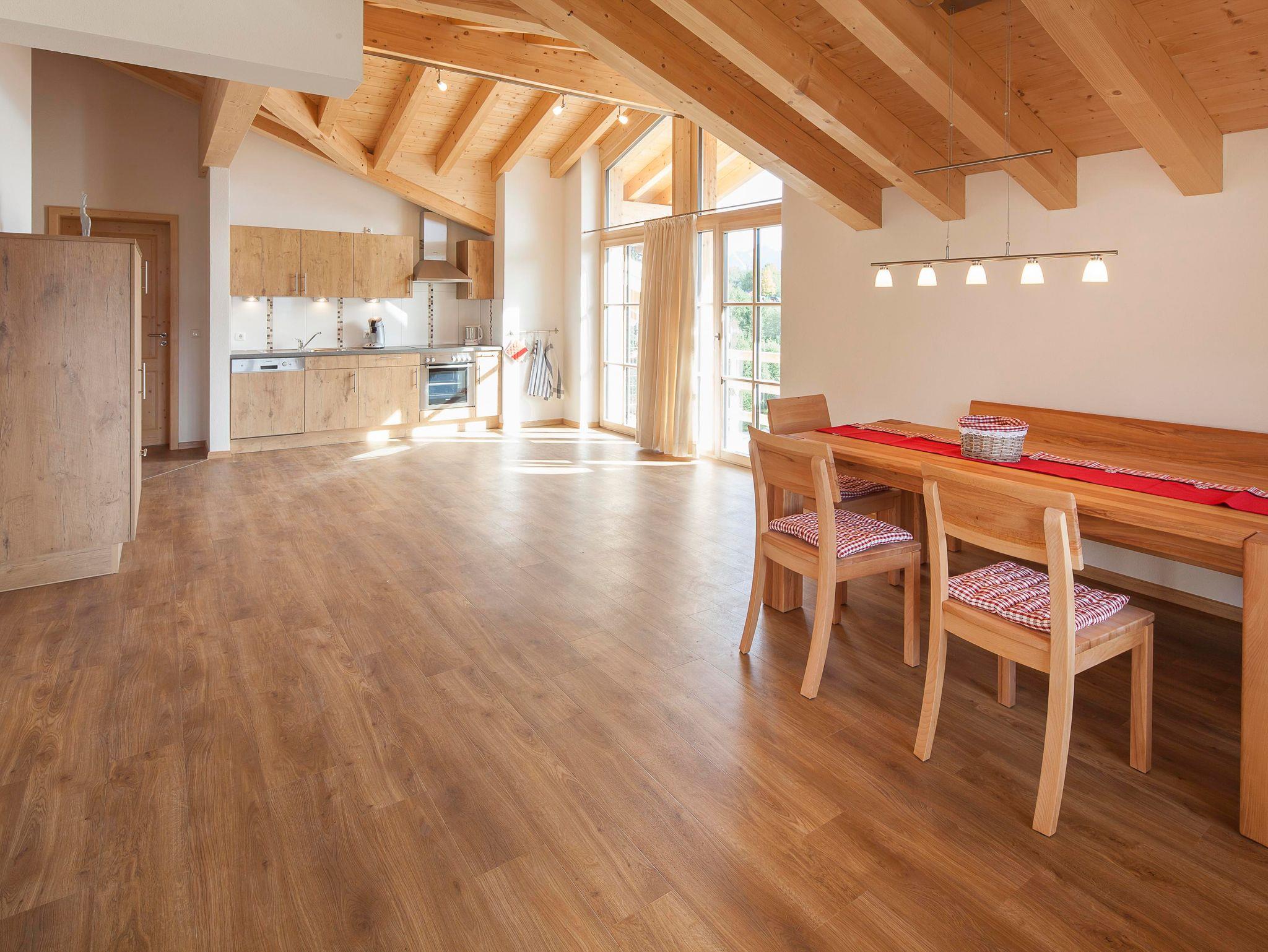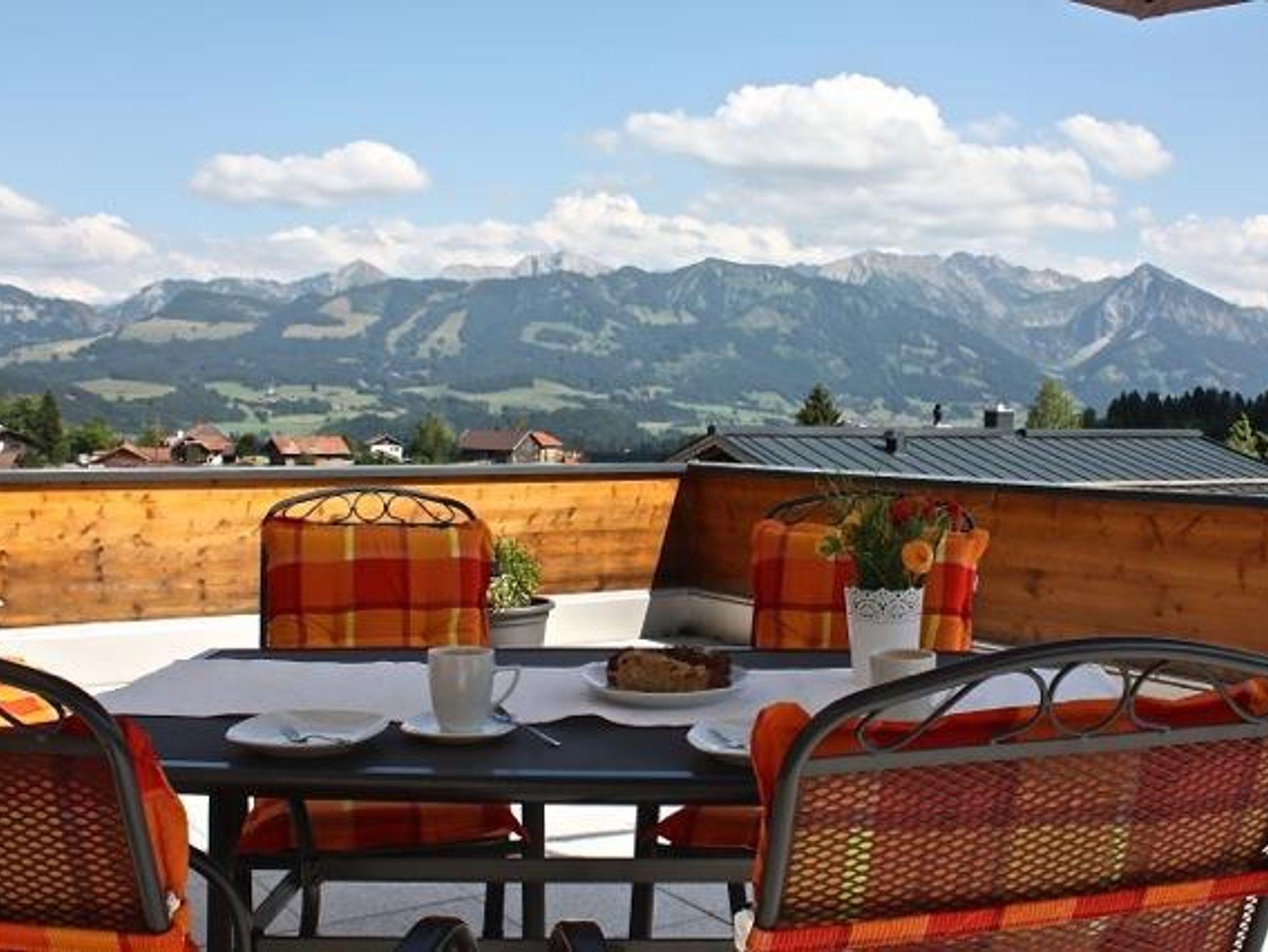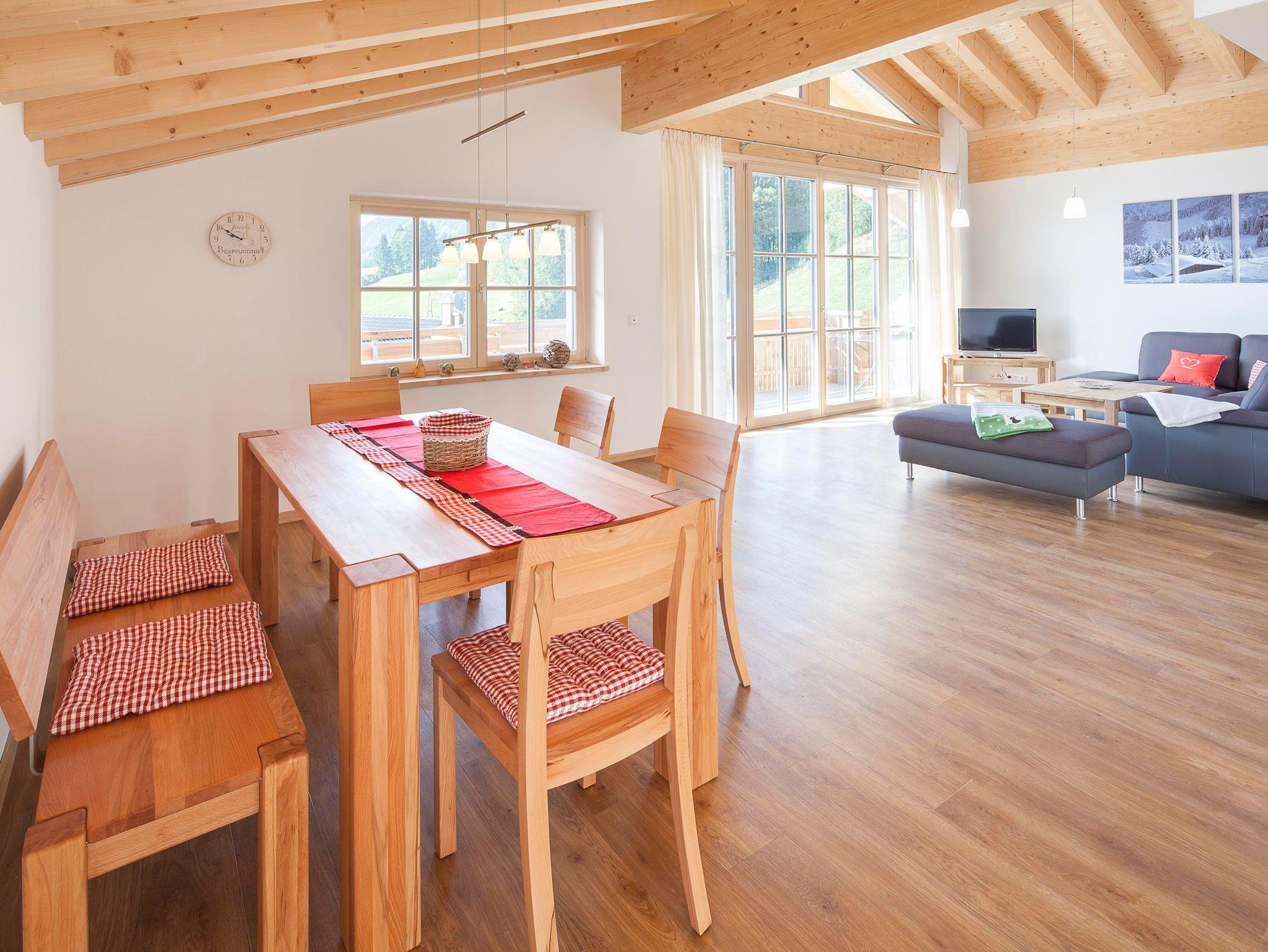 Großzügig, geschmackvoll eingerichtete Ferienwohnung Rubihorn (120 m²) mit offenem Dachstuhl. Vom Südbalkon traumhafter Blick in die Allgäuer Berge.