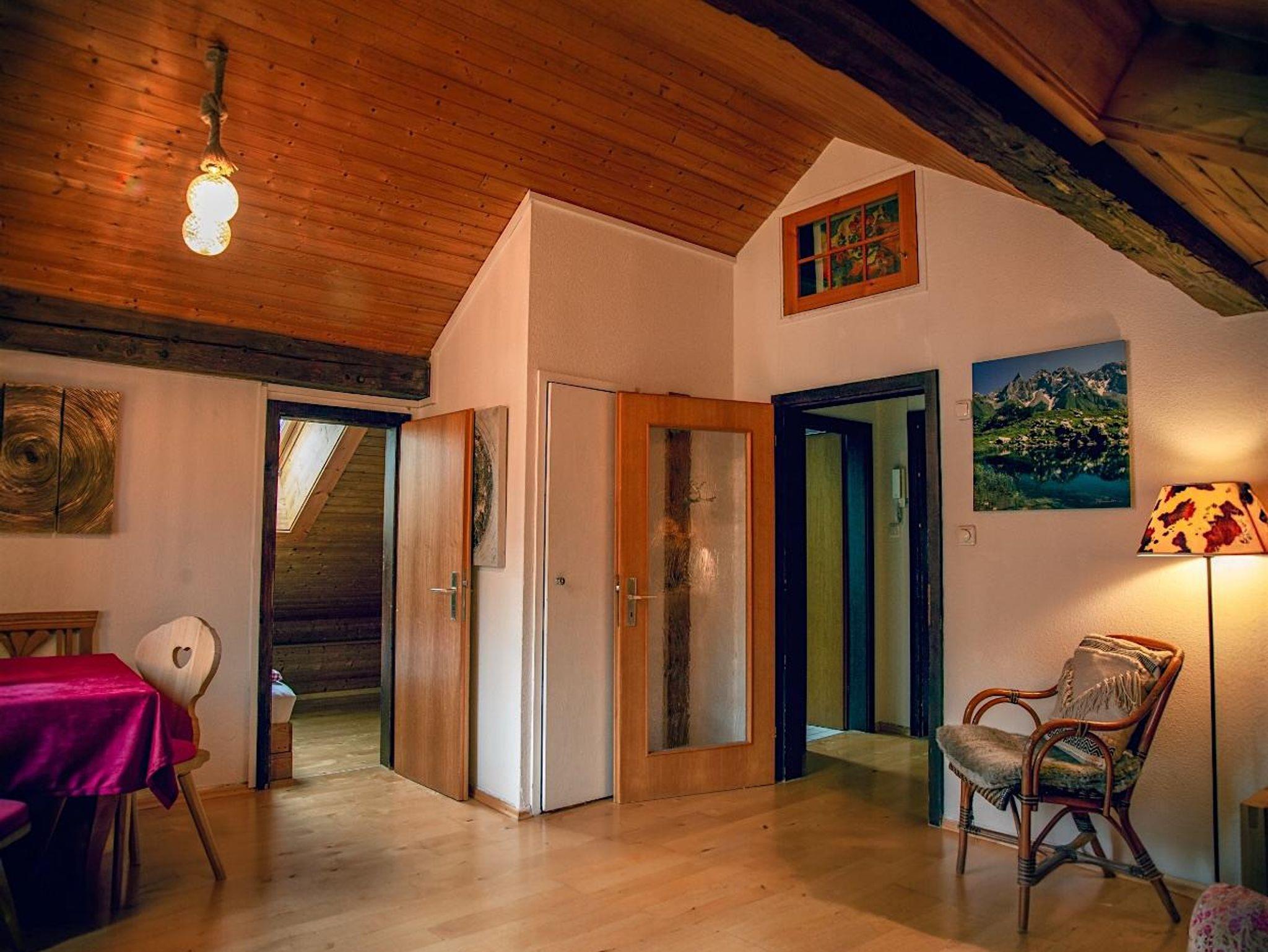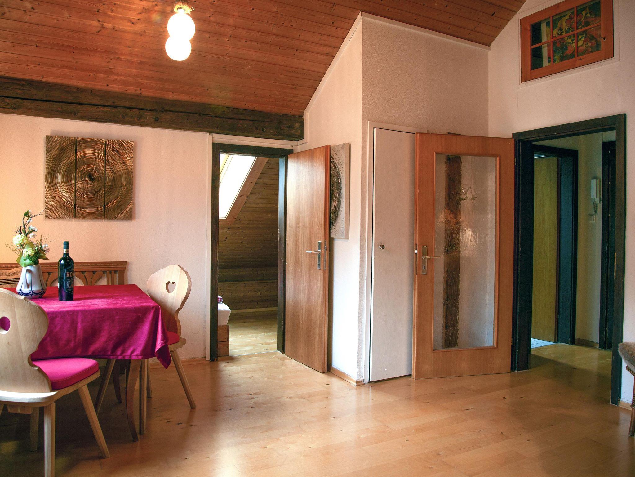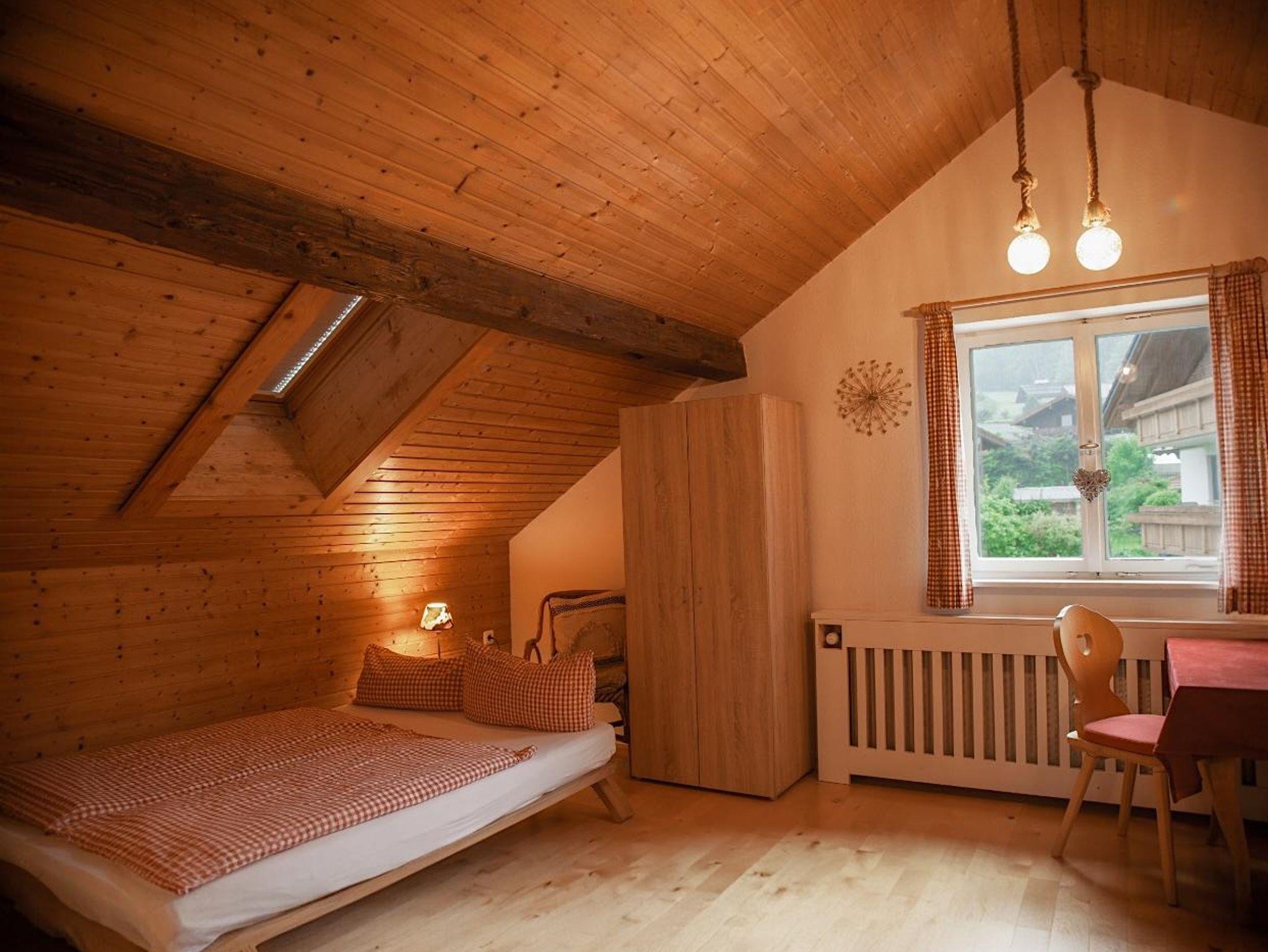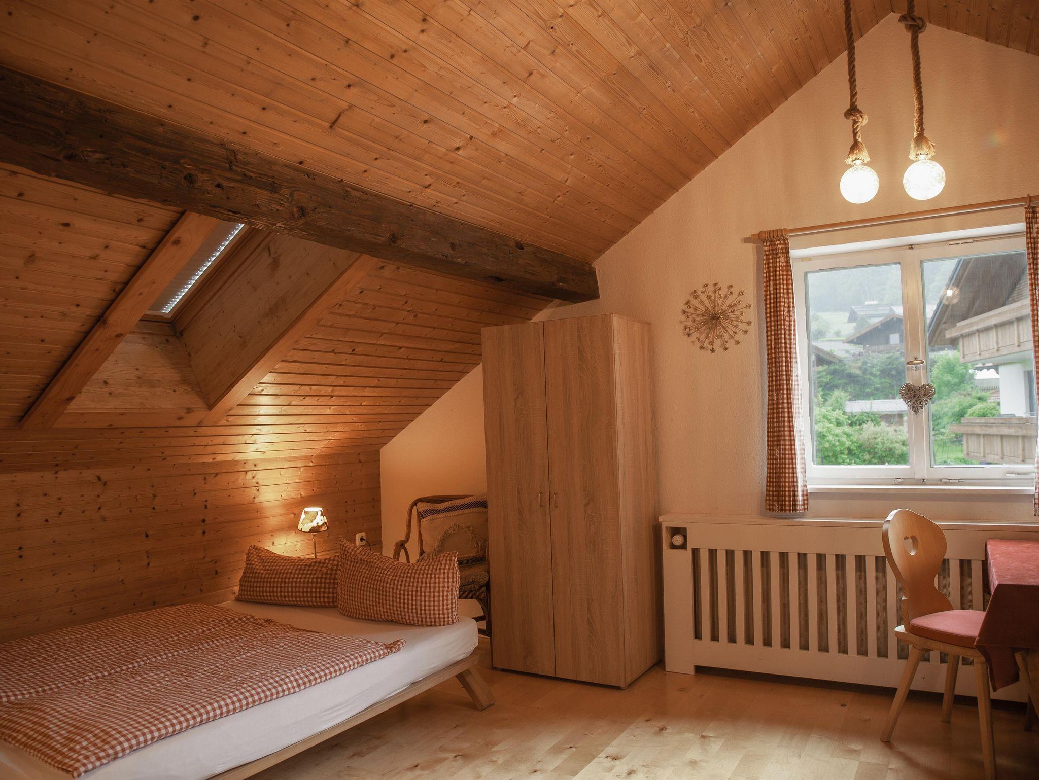 Die komfortabel ausgestattete große Ferienwohnung mit Naturholz-Dachschrägen erstreckt sich mit 100 qm über das gesamte Dachgeschoss des Hauses. Schöner Blick in die Berge und ins Dorf.