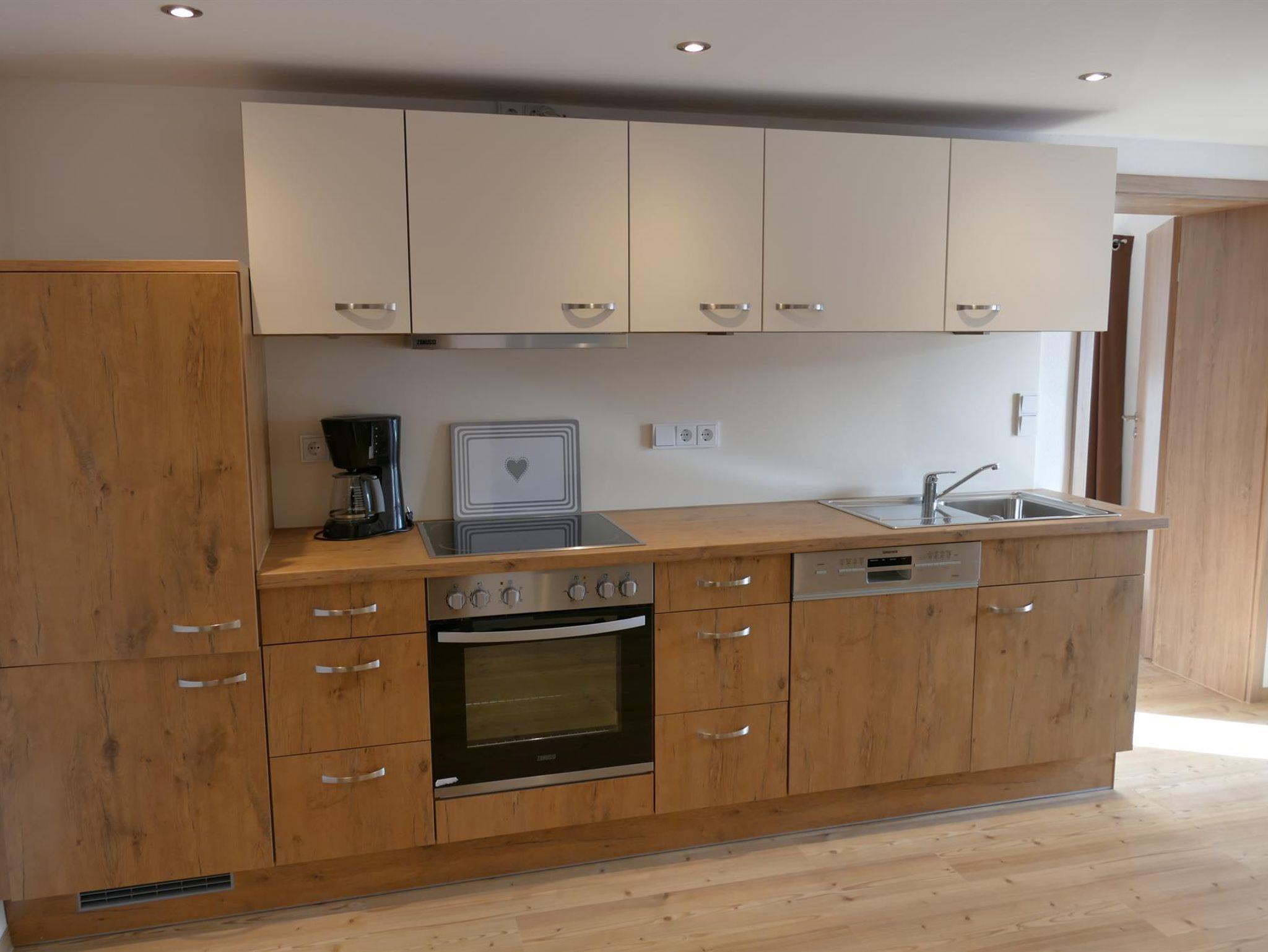 Sie betreten die neue erbaute Ferienwohnung und befinden sich direkt in einer großen Wohnküche mit Essplatz. Alles hier ist in Eiche Optik sehr geschmackvoll eingerichtet. Hier gibt es ebenfalls einen Zugang zum Südbalkon.