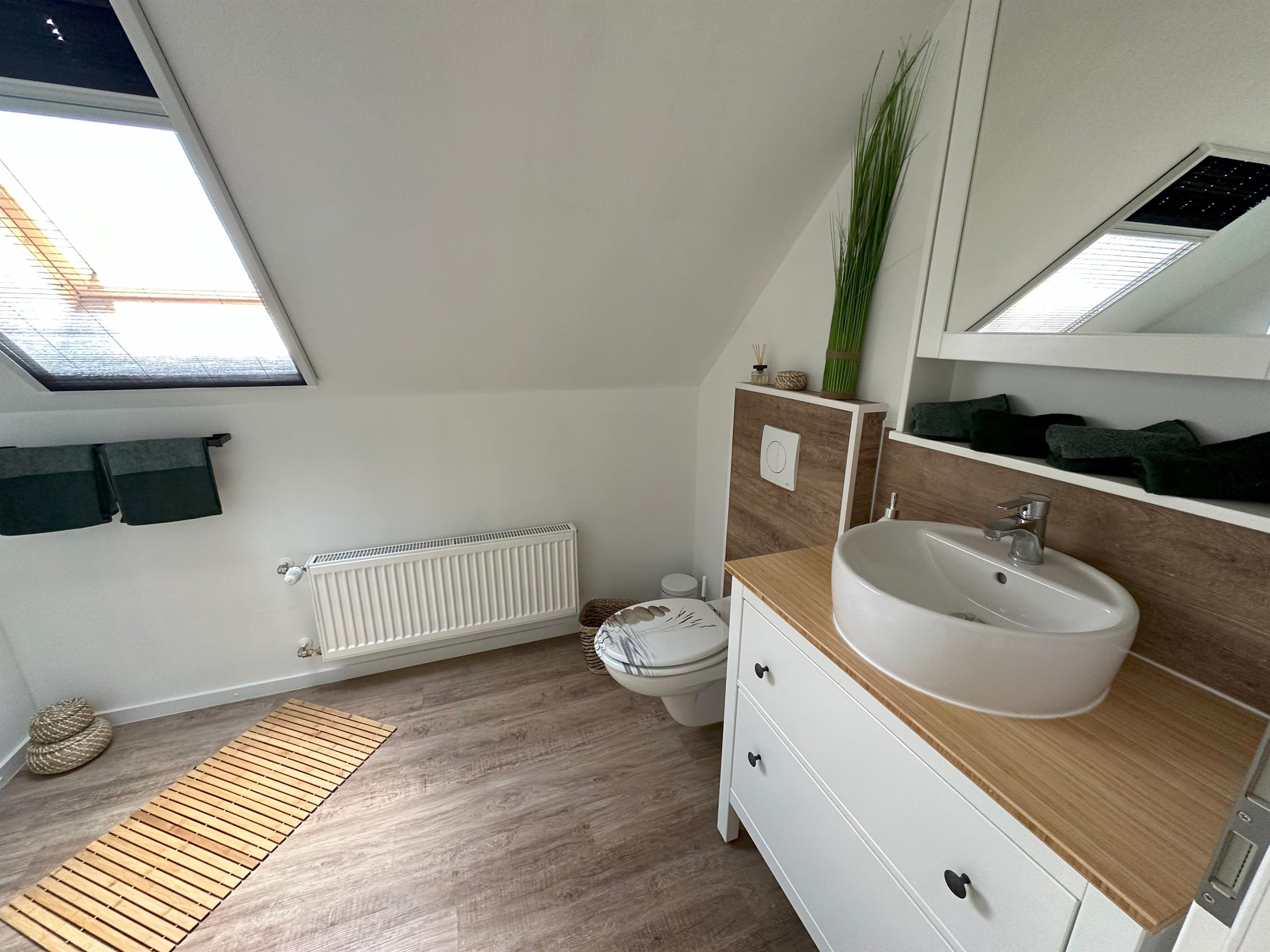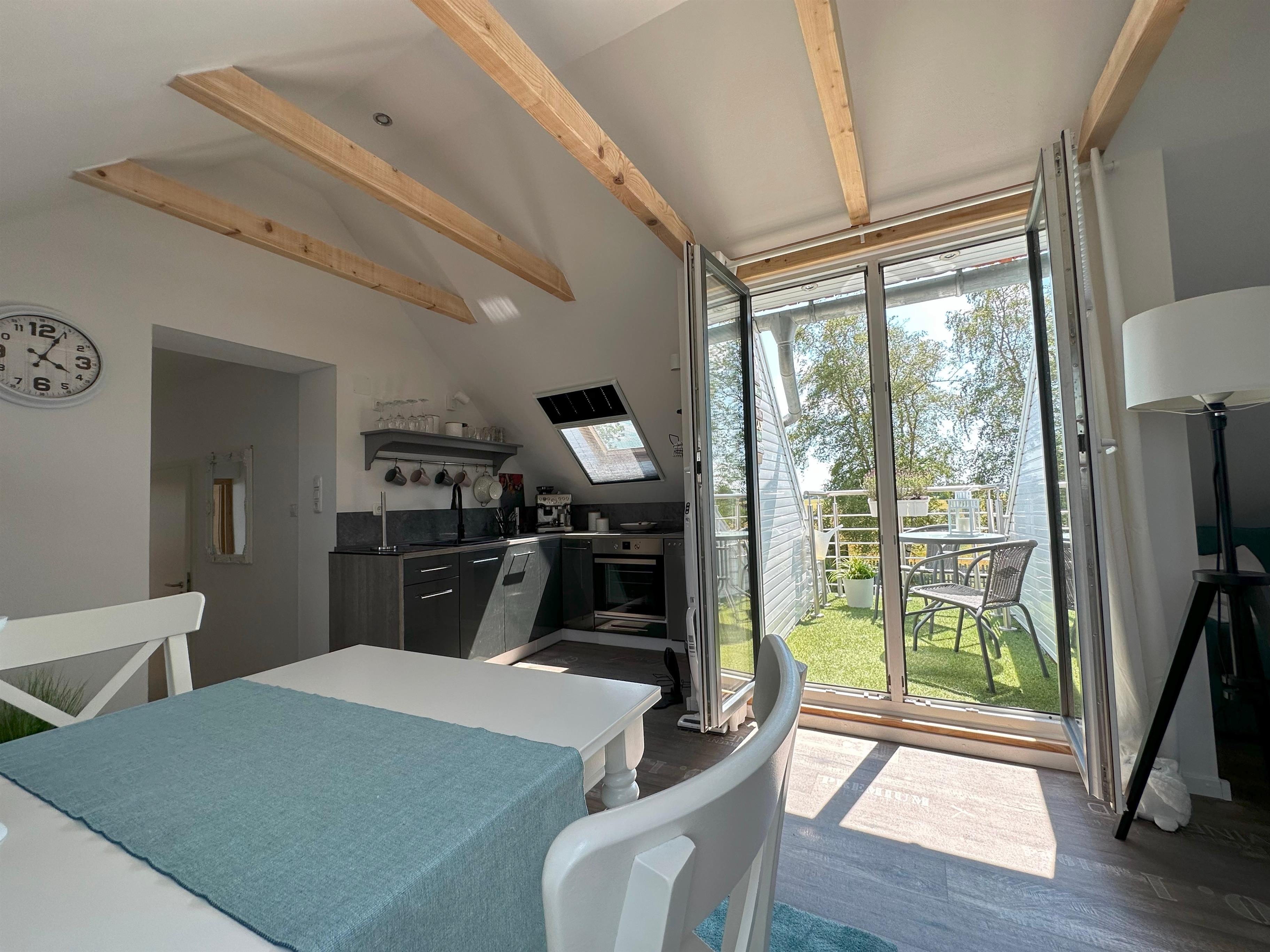?? **Charmante Dachgeschoss-Ferienwohnung mit Loggia & Weitblick – Ruhe & Natur pur** ?? Entdecken Sie ein ganz besonderes Urlaubsdomizil im Dachgeschoss des **„Huus an’t Koornfeld“** – idyllisch gelegen, umgeben von weitläufigen Feldern und Wiesen. Diese liebevoll gestaltete Ferienwohnung ist ein echter **Rückzugsort für alle, die Ruhe, Natur und Komfort** miteinander verbinden möchten ??. Die Wohnung eignet sich ideal für **1–2 Personen**, die fernab vom Alltagstrubel entspannen und neue Energie tanken möchten. Die **moderne und hochwertige Innenausstattung**, kombiniert mit viel Tageslicht und sichtbaren Dachbalken, schafft eine **warme und freundliche Wohlfühlatmosphäre** ?. --- ?? **Wohnen & Ausstattung** Die im Jahr **2023 komplett neu fertiggestellte Dachgeschosswohnung** bietet Ihnen alles, was Sie für einen sorgenfreien Aufenthalt benötigen: • ??? Gemütliches **Schlafzimmer mit 160 cm breitem Bett** • ??? **Voll ausgestattete Küche** mit großem Kühlschrank inkl. Gefrierfach, Spülmaschine und Filterkaffeemaschine • ?? Modernes **Badezimmer mit Dusche, WC und Handwaschbecken** • ?? Großer **Flachbildfernseher** für entspannte Abende • ?? Alle Dachfenster mit **Verdunkelungsplissees & Fliegengittern** ausgestattet --- ?? **Loggia & Außenbereich** Ein besonderes Highlight ist die **sonnige Loggia**, von der aus Sie einen traumhaften **Weitblick über Felder und Wiesen** genießen können ??. Hier lässt sich fast den ganzen Tag die Sonne erleben – perfekt für ein entspanntes Frühstück ? oder ruhige Abendstunden ??. Der angrenzende Garten, direkt am Kornfeld gelegen, bietet eine **weite, ungestörte Aussicht** und unterstreicht das Gefühl von Freiheit und Naturverbundenheit. --- ?? **Lage & Umgebung** Die Ferienwohnung liegt ruhig an einer kleinen Straße und ist dennoch hervorragend angebunden: • ?? **Greetsiel** ca. 11 km entfernt • ?? **Norden / Norddeich** ca. 14 km entfernt (beides in ca. **15 Minuten mit dem Auto** erreichbar) Die Umgebung lädt zu **ausgedehnten Spaziergängen, Wanderungen und Fahrradtouren** ???? durch die malerische ostfriesische Landschaft ein. Ob Erholung oder aktive Urlaubsgestaltung – **hier ist beides möglich**. --- ? **Fazit** Diese Dachgeschoss-Ferienwohnung vereint **exklusive Ausstattung, naturnahe Lage und modernen Wohnkomfort** auf ideale Weise. Genießen Sie sonnige Stunden auf der Loggia, entdecken Sie die nahegelegenen Küstenorte und erleben Sie einen Urlaub, der **Erholung und kleine Abenteuer** perfekt miteinander verbindet ??. ?? **Virtueller 360°-Rundgang:** ?? [https://my.matterport.com/show/?m=CrGVSZY2WsA](https://my.matterport.com/show/?m=CrGVSZY2WsA) ??