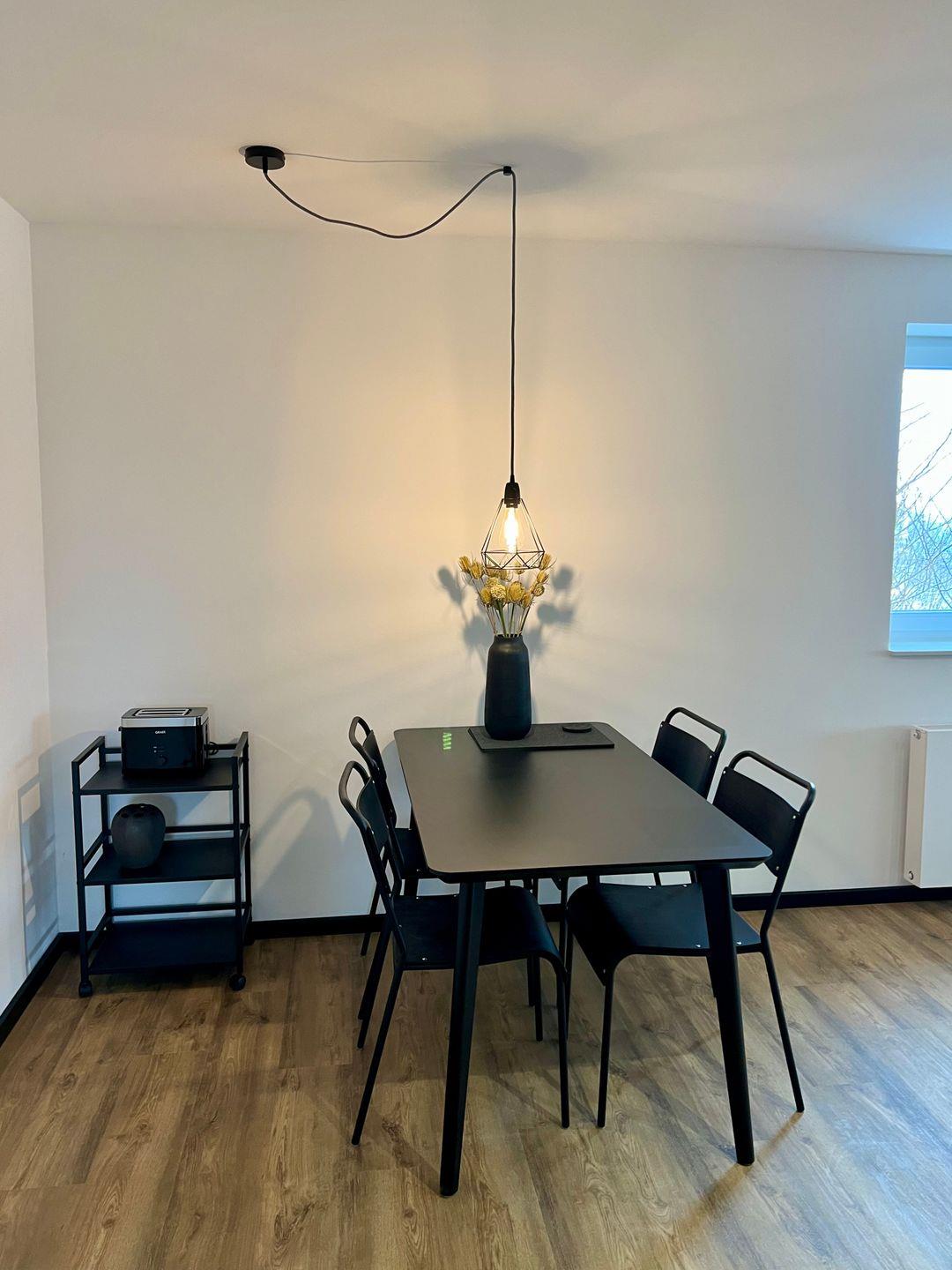 Der großzügige Wohn- und Essbereich ist mit einem Sofa sowie einem Esstisch (140 cm x 78 cm) ausgestattet. Für einen gemütlichen Fernsehabend steht ein 43“ Fernseher mit Satellitenanschluss für dich bereit. Auch deinen Netflix-Account kannst du darauf nutzen. In der gesamten Wohnung stellen wir dir selbstverständlich kostenlos einen schnellen, kabellosen Internetzugang zur Verfügung.