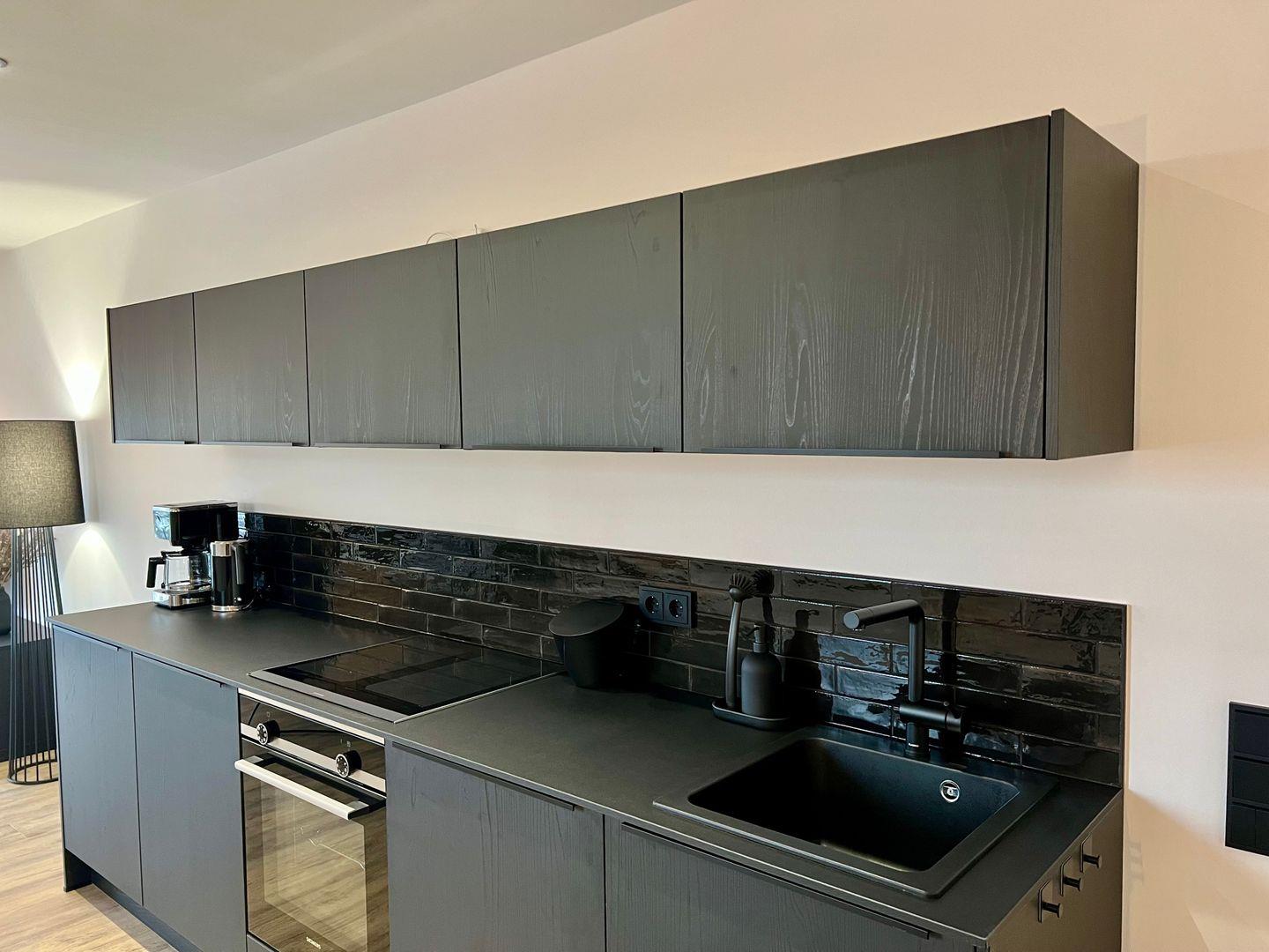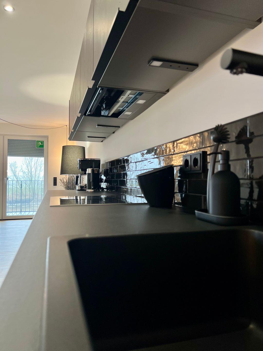 In der hochwertigen Kochnische findest du neben einem Induktionskochfeld mit vier Kochplatten einen Backofen sowie einen Kühlschrank mit Gefrierfach und einen Geschirrspüler. Die sorgfältig ausgewählten Küchenutensilien helfen dir beim Kochen und Genießen. Zu unserer Grundausstattung gehören außerdem Salz, Pfeffer und Zucker. Für die Kaffee- und Teezubereitung stehen dir eine Kaffeemaschine und ein Wasserkocher zur Verfügung.