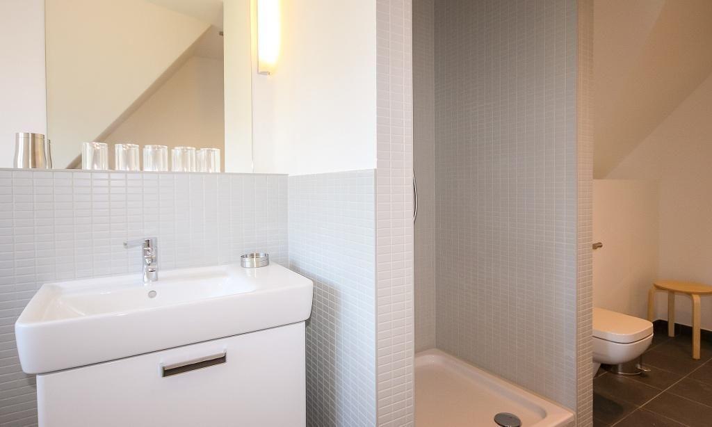 Das Erdgeschoss verfügt über einen einladenden und lichtdurchfluteten Wohnraum mit einer gemütlichen Sitzecke und Ausblick auf die Terrasse. Die offene Küchenzeile mit angrenzendem Essbereich ist integriert und sorgt für einen offenen Wohncharakter. Ein Gäste-WC befindet sich ebenfalls auf der unteren Etage. Im Obergeschoss sind ein Schlafzimmer mit einem Doppelbett sowie ein zweites Schlafzimmer mit einem Einzelbett und einem ausziehbaren Kojenbett für ein bis zwei Personen untergebracht. Das großzügige Bad mit Dusche/WC im Obergeschoss sorgt für zusätzlichen Wohnkomfort.