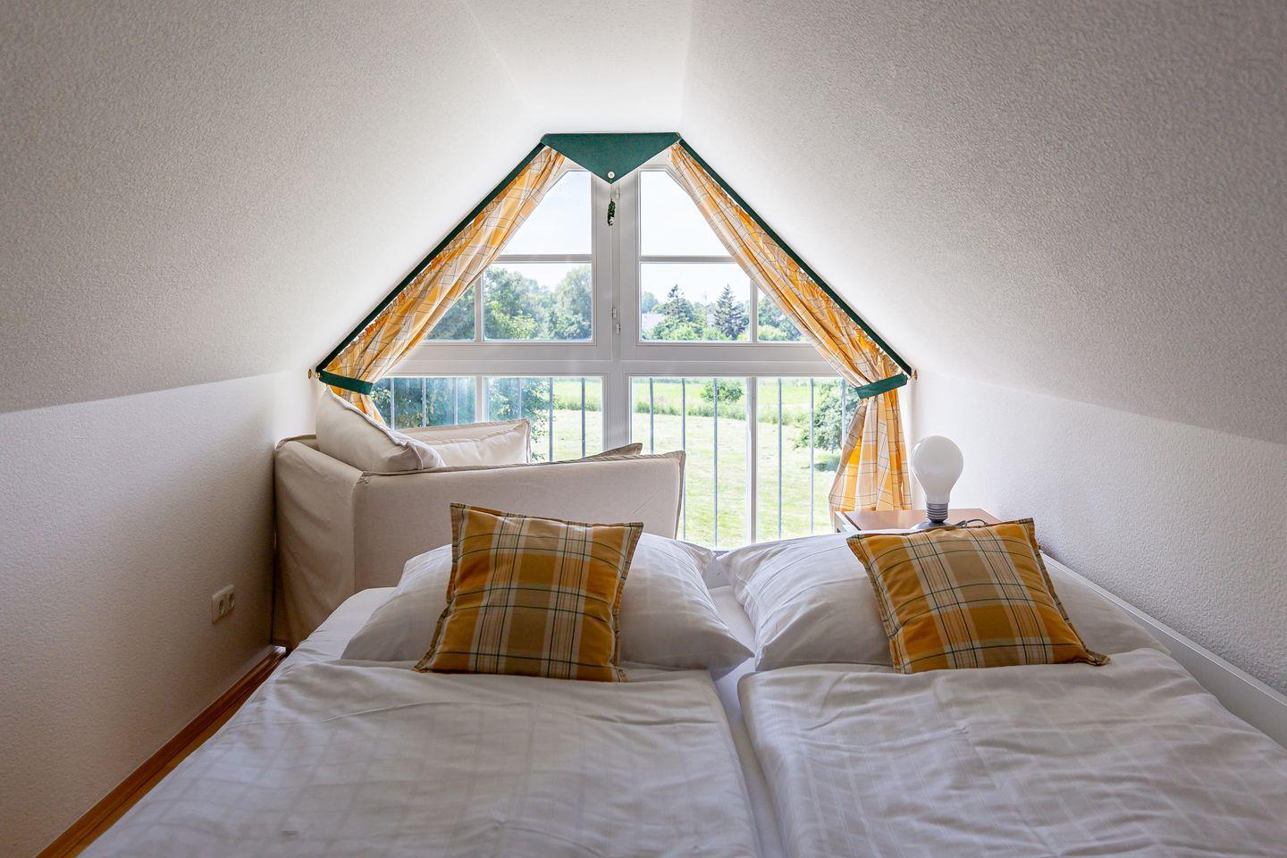Die Wohnung befindet sich im ersten Obergeschoss eines Mehrfamilienhauses und erstreckt sich über zwei Etagen. Der Wohnraum empfängt dich mit einer gemütlichen Sitzecke am Kaminofen. Die Küchenzeile mit angrenzendem Essbereich ist unmittelbar integriert und schafft einen offenen Wohncharakter. Das Schlafzimmer ist mit einem Doppelbett ausgestattet. Das Bad verfügt über Dusche/WC sowie eine Waschmaschine. Der Balkon ist sowohl vom Wohnbereich, als auch vom Schlafzimmer aus begehbar. Über eine Wendeltreppe gelangst du ins offen gestaltete Dachgeschoss. Von hier genießt du einen freien Blick auf eine wildwachsende Wiese. Auch ein zweiter Schlafbereich mit einem Doppelbett befindet sich hier.