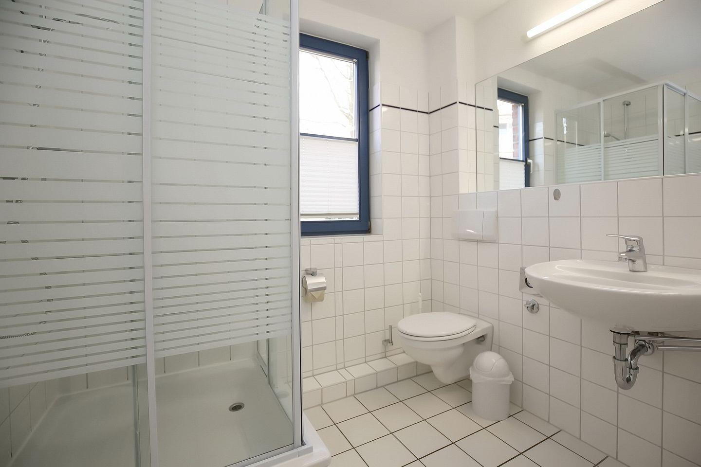 Zum gefliesten Duschbad gehört ein Fenster. Fahrräder können im Fahrradständer am Haus abgestellt werden.